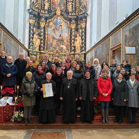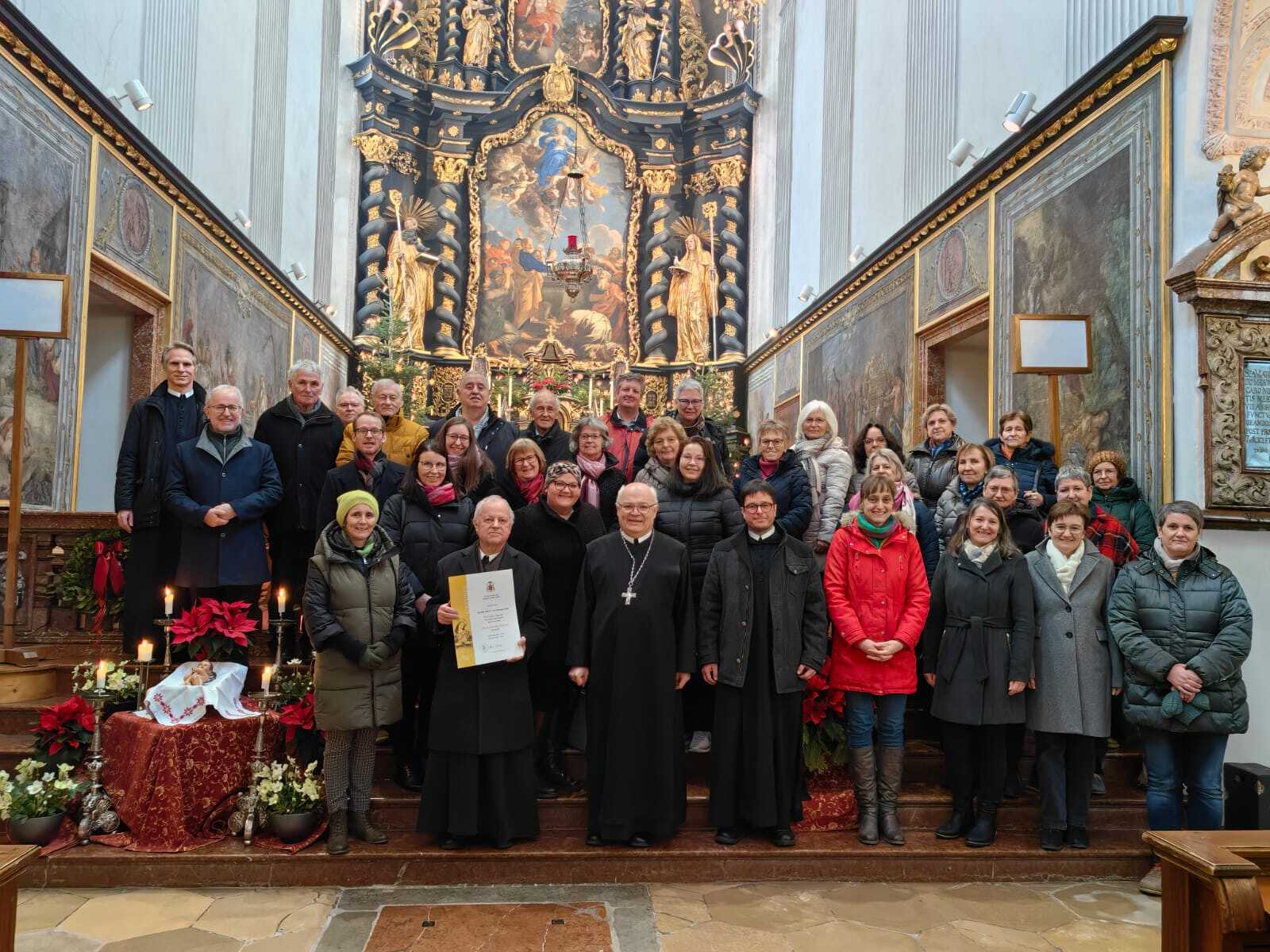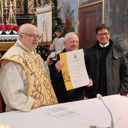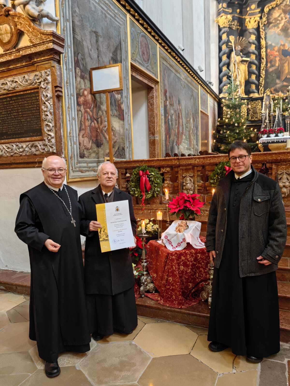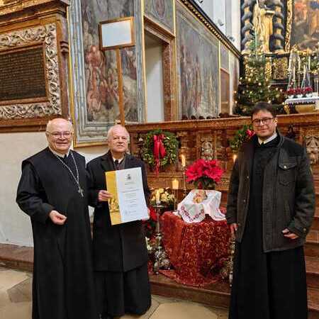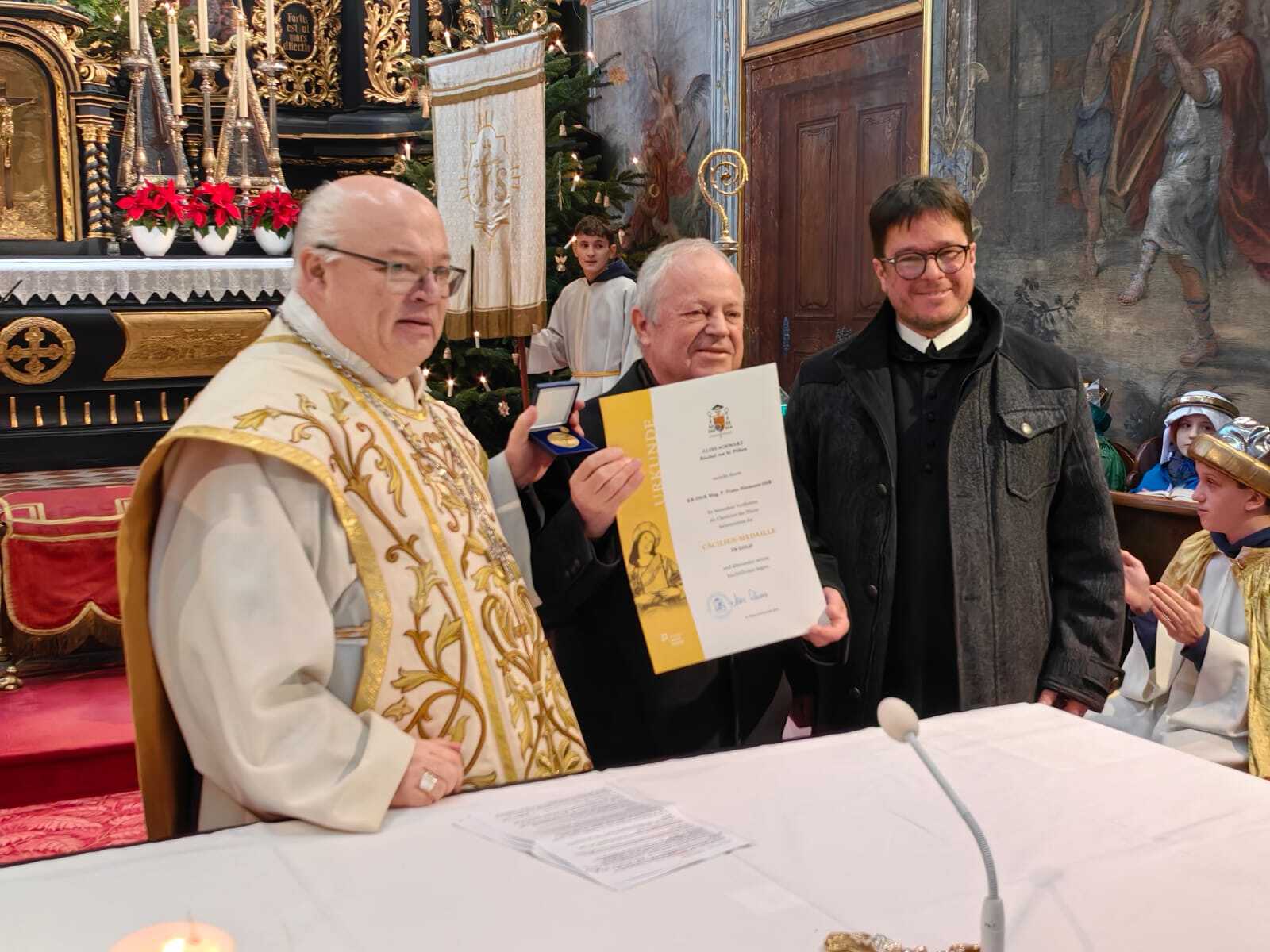 Im Anschluss an den Gottesdienst konnte Abt Petrus die "Cäcilienmedaille in Gold" der Diözese St. Pölten (benannt nach der Patronin der Kirchenmusik, der Heiligen Cäcilia) an P. Franz Hörmann verleihen. P. Franz hat den Kirchenchor 42 Jahre lang geleitet, zu einem tollen Ensemble und vor allem einer guten Gemeinschaft gemacht. Im Sommer letzten Jahres hat er die Leitung des Chores an P. Florian übergeben - und verstärkt seitdem das Bass-Register mit seiner Stimme. Vergelt's Gott an P. Franz und Gottes Segen!