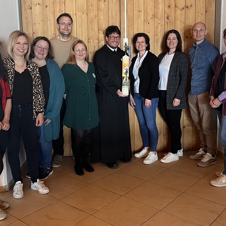 Wie jedes Jahr lässt das Team Familie Aktiv auch heuer wieder die Osterkerze für die Friedhofskirche St. Veit von Frau Eva Palmsteiner gestalten. Diese wurde an Pater Florian übergeben.