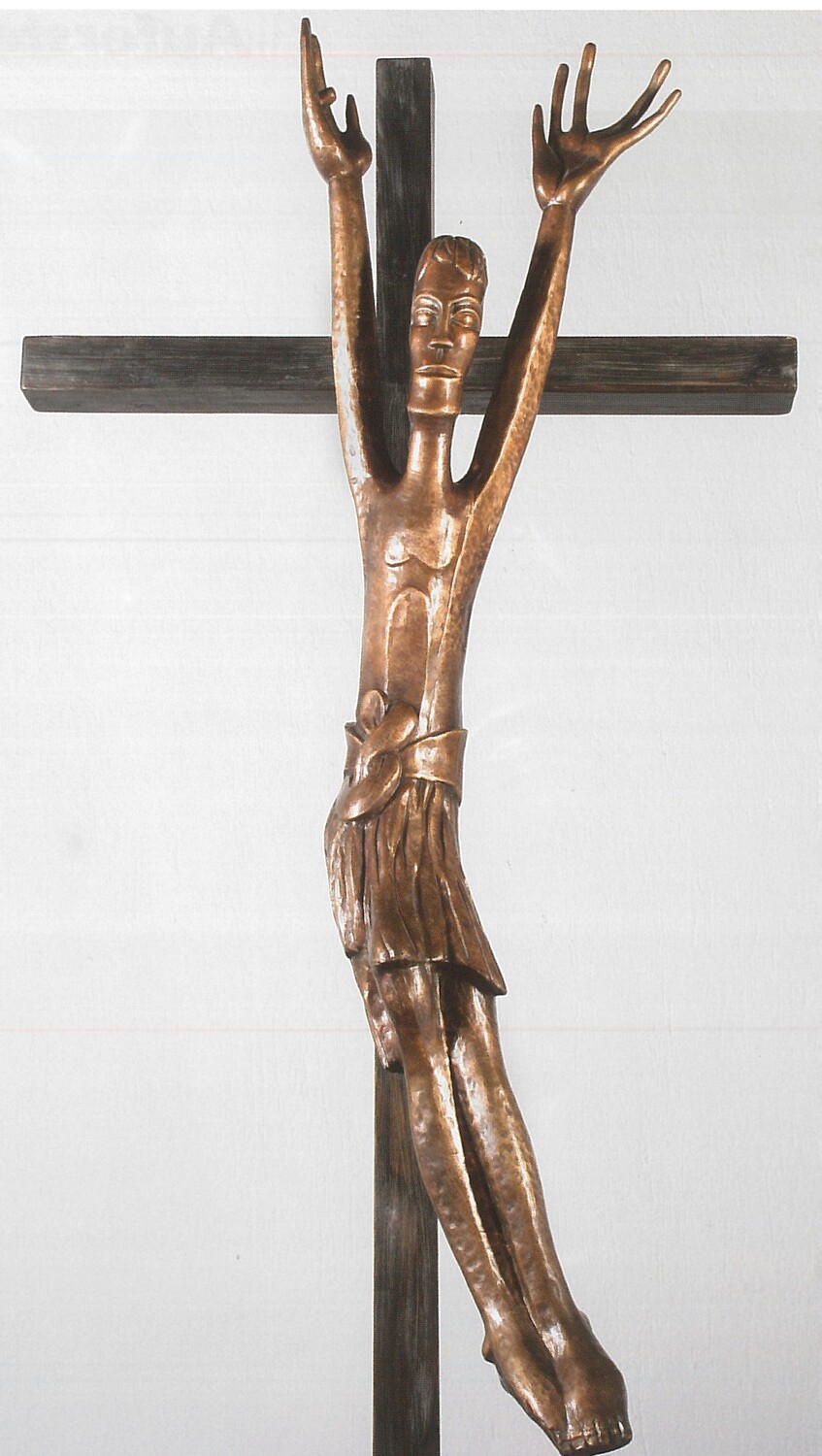 Das Kreuz ist ein Bronzeabguss des „Auferstehungskreuzes“ des Künstlerpfarrers Josef Elter aus Bad Traunstein.