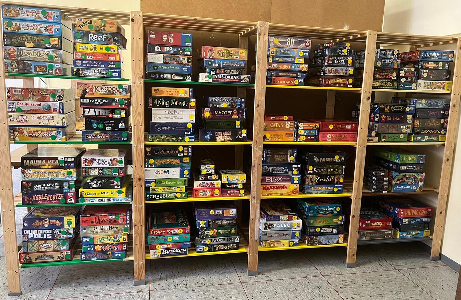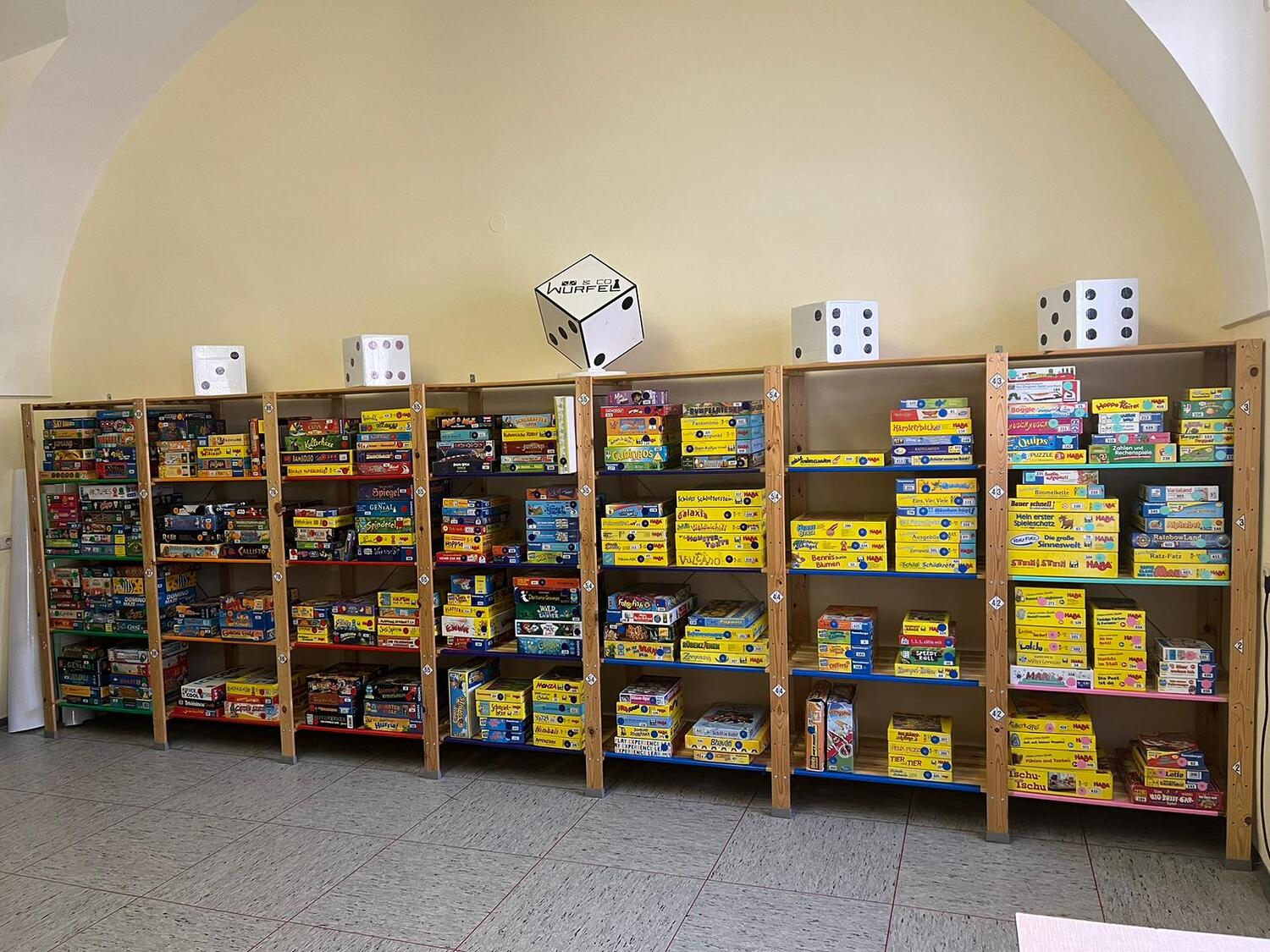 Mittlerweile befinden sich in den Räumlichkeiten von „Würfel & Co“ (erreichbar durch den Seiteneingang der Stiftskirche, erste Tür rechts) über 600 Brettspiele für Spielefans von 2 bis 99 Jahren. Das Angebot ist breit gefächert und bietet sowohl Klassiker und Raritäten wie auch Neuheiten und preisgekrönte Spiele.
