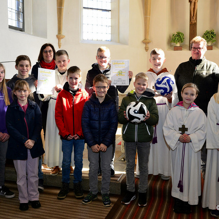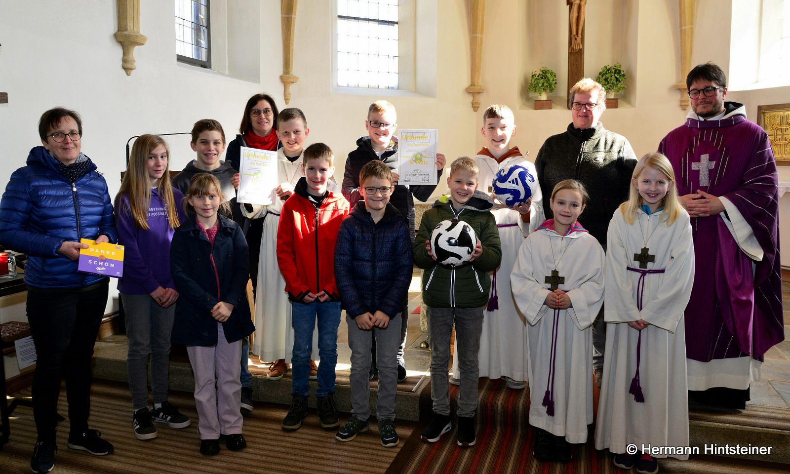 P. Florian gratulierte am nächsten Tag am Schluß der Sonntagsmesse dem Ministranten-Kicker-Team und bedankte sich bei den Begleiterinnen recht herzlich. Ein Ball wurde Phillip für zukünftige Minis-Trainingseinheiten übergeben und der zweite der Jungschar geschenkt.