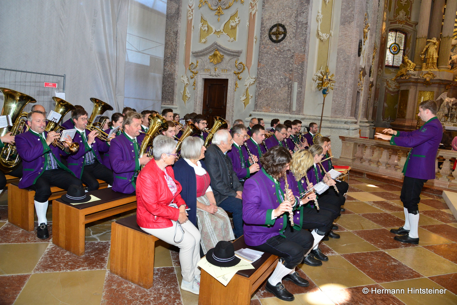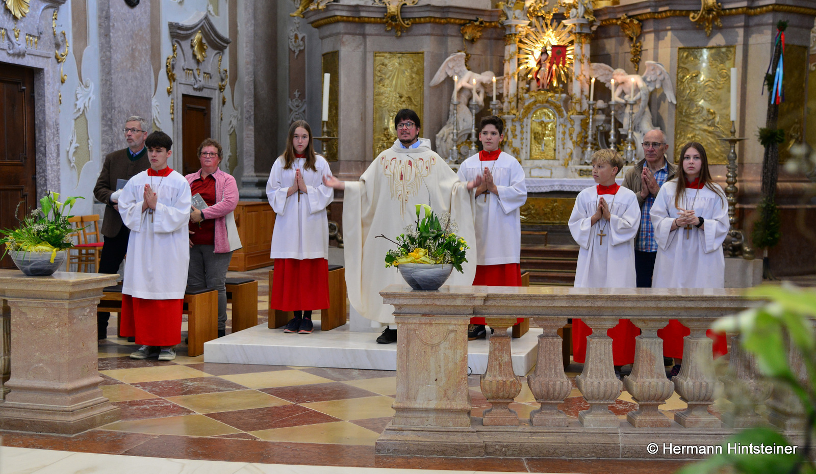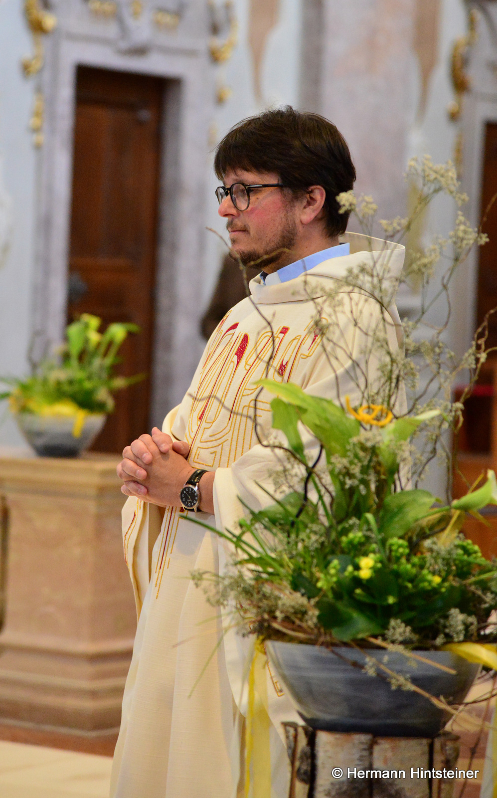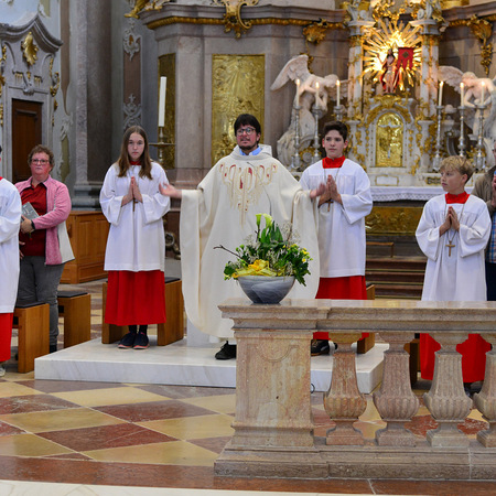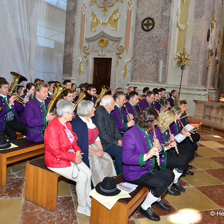 Die Messe in der Basilika wurde dann gemeinsam mit P. Florian und vielen Nachkommenden aus beiden Pfarren gefeiert - musikalisch begleitet von der Blasmusikkapelle Biberbach und einem Chor, der sich aus den Chören von Biberbach und St. Georgen zusammensetzte (an der Orgel: Maria Sonnleitner jun.). Unter der Leitung von Maria Rittmannsberger vereinten sich die Stimmen und erfreuten uns mit der "Friedensmesse" von Lorenz Maierhofer und dem "Locus iste" von Bruckner.