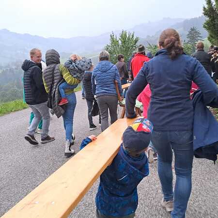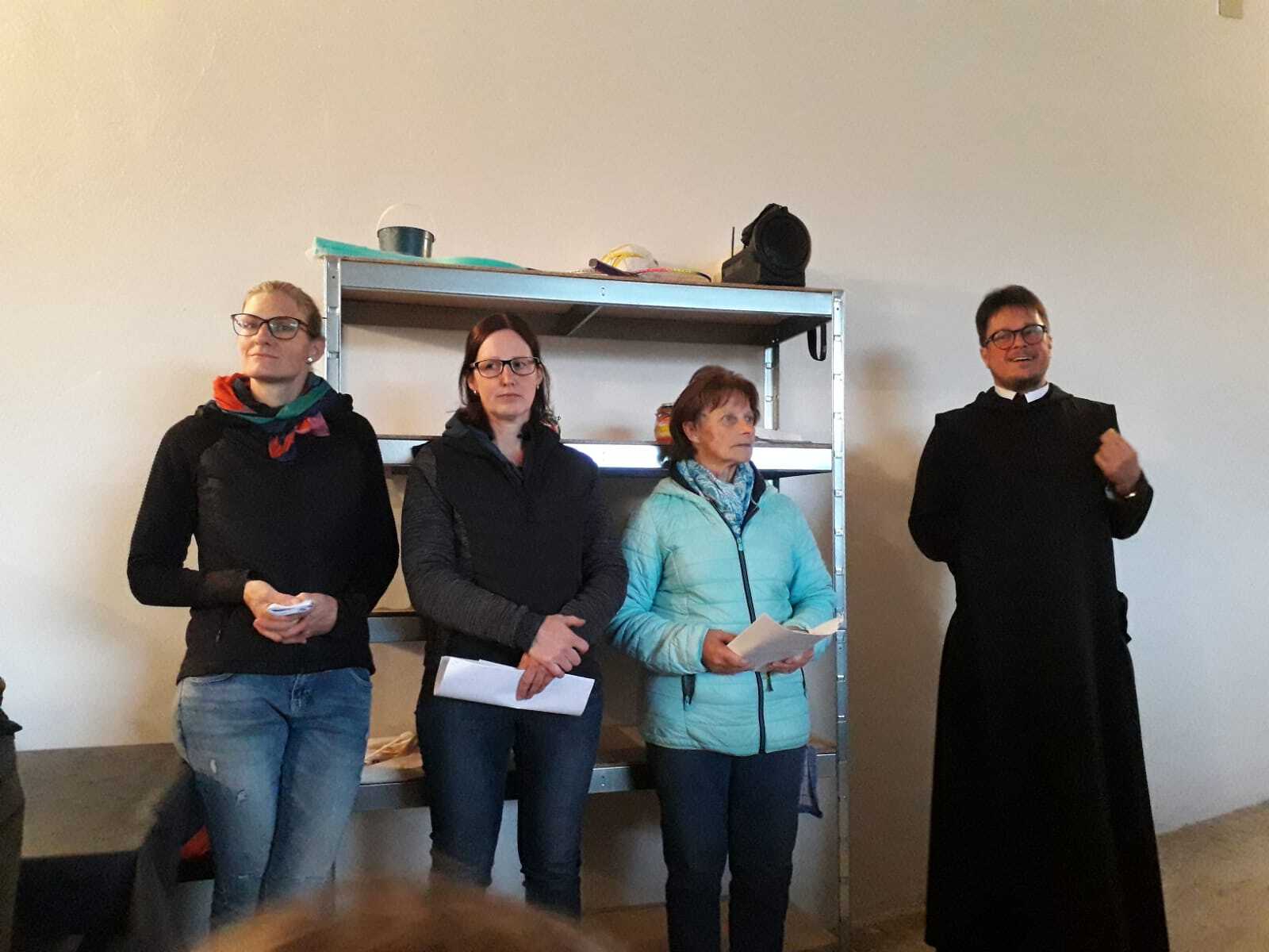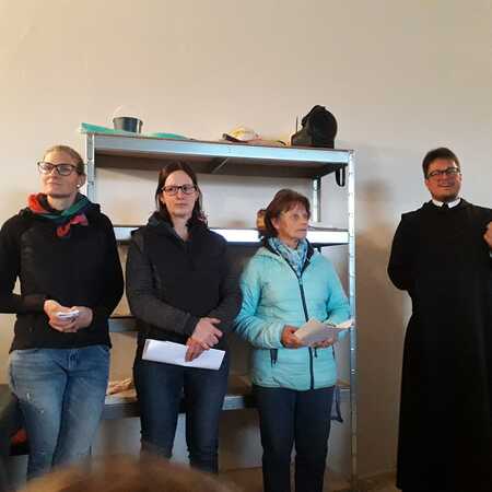 Die Kath. Frauenbewegung gestaltete die Andacht mit schönen besinnlichen Texten. Da es kurz nach Beginn zu regnen anfing, suchten die zahlreichen Mitfeiernden in der Garage Schutz und die Andacht konnte im Trockenen fortgesetzt werden. "Unter deinen Schutz und Schirm fliehen wir..." wurde in die Praxis umgesetzt.