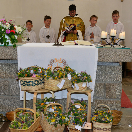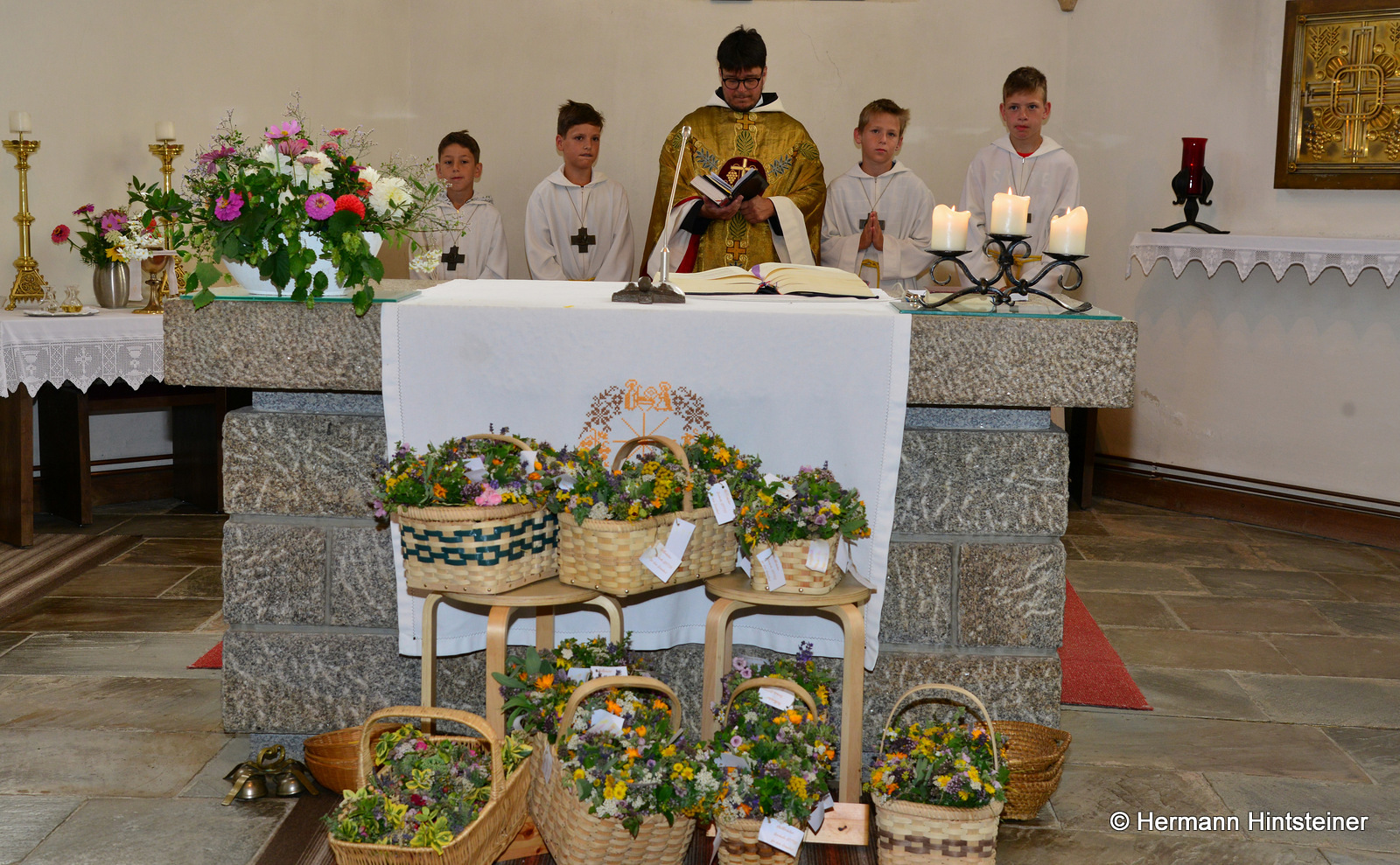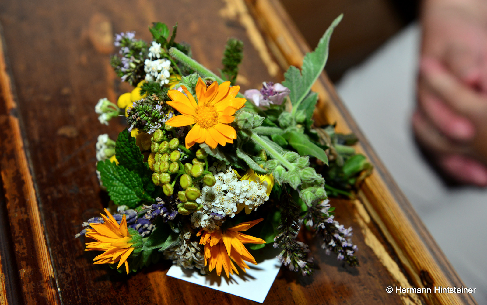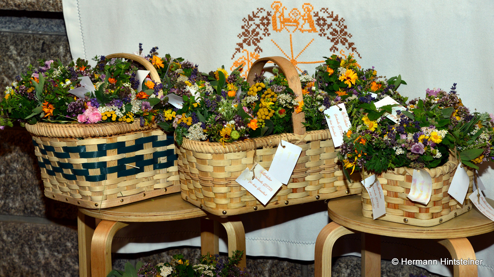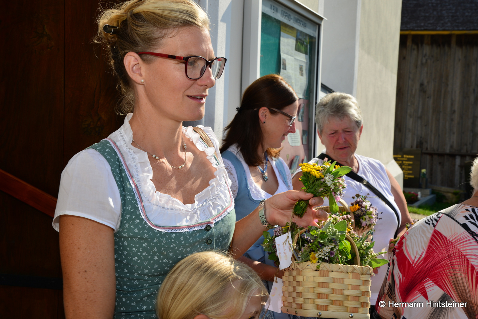 Am Fest der Gottesmutter Maria wurden wiederum bunte Blumen in duftenden Kräutersträußerln zur Segnung in die Kirche gebracht. Sie wurden am Vortag von den Damen der Katholischen Frauenbewegung (Leitung Maria Brandstätter) in liebevoller Arbeit gebunden - ein Zeichen der Dankbarkeit für die wertvollen Geschenke der Natur.