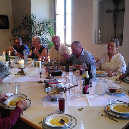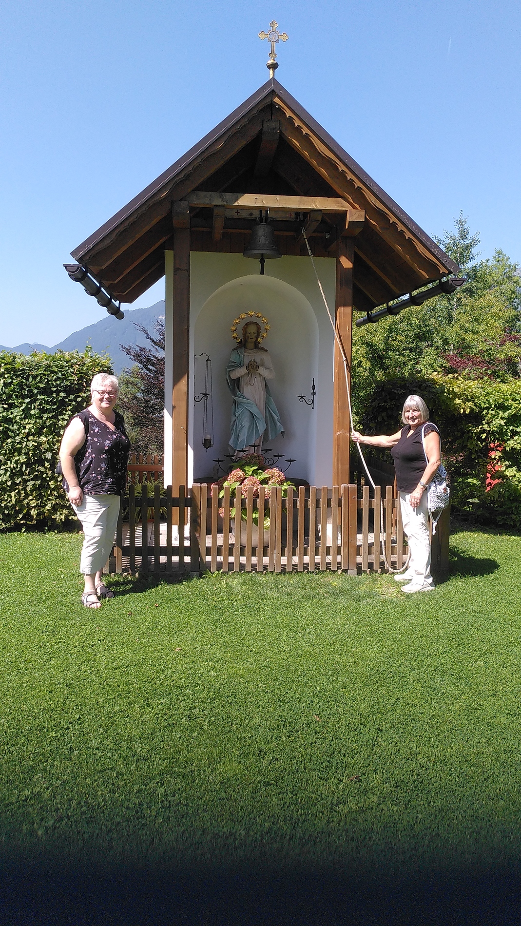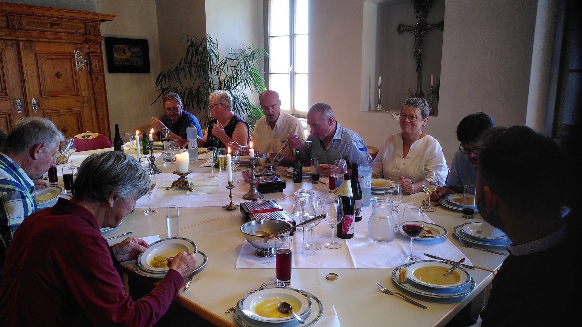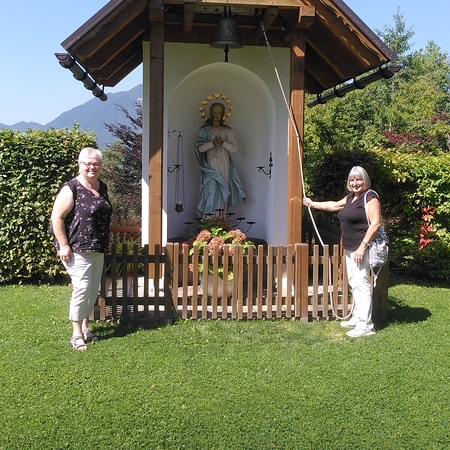 Dank seiner guten Beziehungen zum Stift Admont, insbesondere zu seinem Studienkollegen P. Prior Maximilian, der die Pfarre Frauenberg als Pfarrer betreut, fühlten wir uns sehr privilegiert. Schon der Empfang war überwältigend - es läuteten alle Glocken und P. Maximilian segnete jeden einzelnen von uns mit Weihwasser. Wir hielten in der Wallfahrtskirche "Maria Opferung am Kulm", wie sie richtig heißt, eine kleine Andacht mit ein paar musikalischen Beiträgen des Chores. Danach spazierten wir noch eine Weile durch die schönen Gartenanlagen und kehrten dann in den Pfarrhof zurück, wo wir von Frau Barbara mit einem köstlichen Mittagessen im Speisesaal versorgt wurden. Das tolle Ambiente und die "hochwürdige" Bedienung haben wir sehr genossen.
