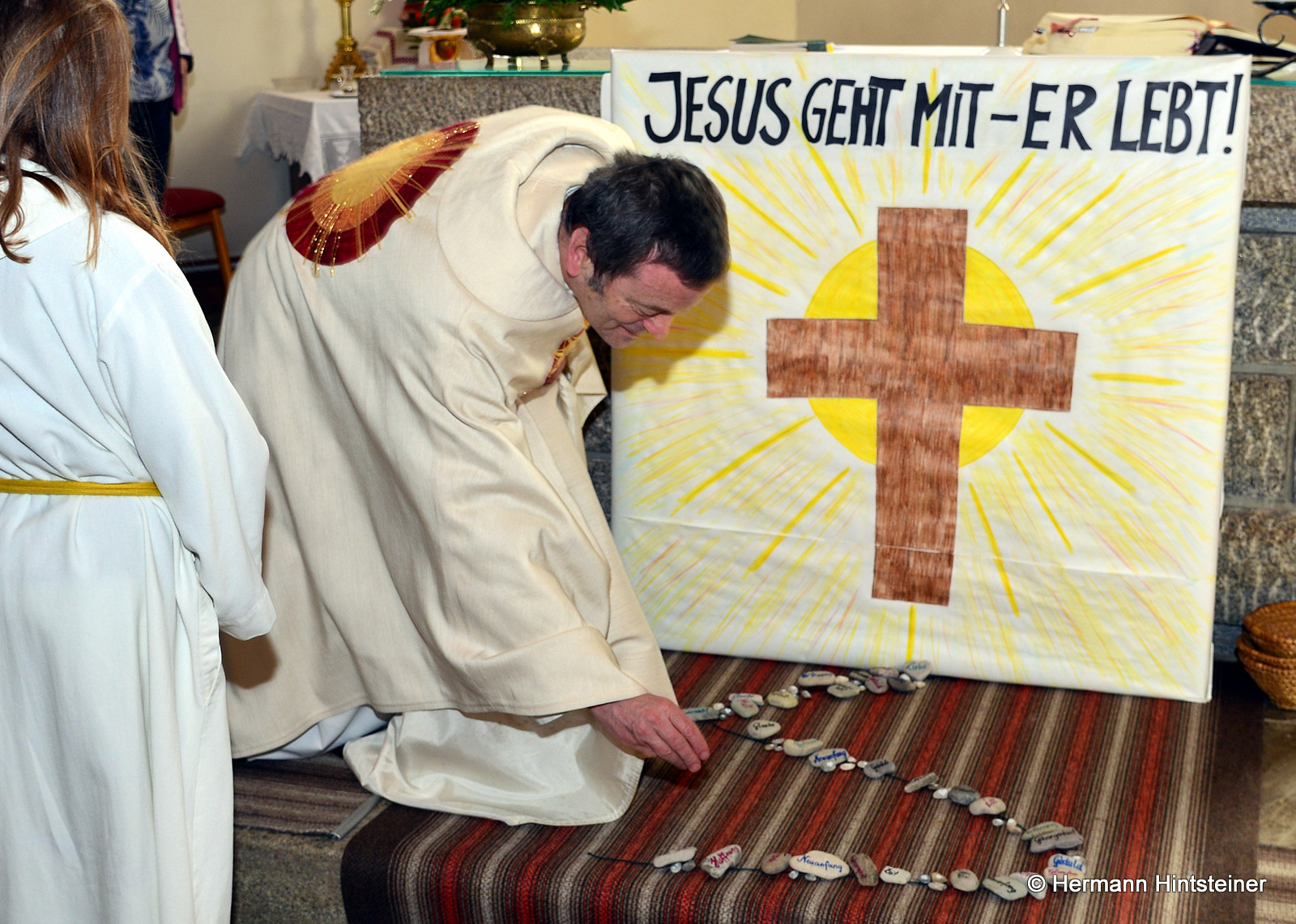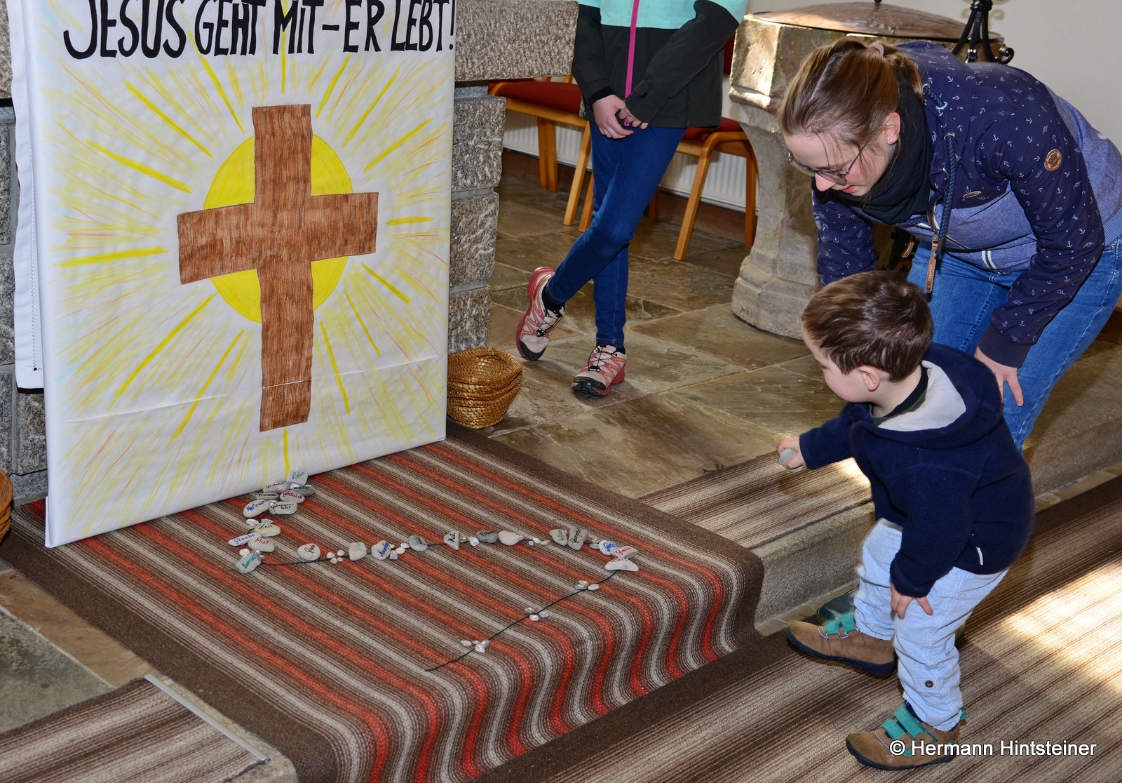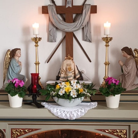 Die Osternacht wurde mit P. Laurentius und P. Ägid gefeiert. Viele Besonderheiten dieser Feier, wie der Einzug des Lichtes, das Entzünden der mitgebrachten Kerzen, das feierliche von P. Laurentius gesungene Exsultet, die Taufwasserweihe mit der Erneuerung des Taufversprechens und schließlich die Eucharistiefeier, berühren immer wieder. Das Hochamt am Ostersonntag wurde vom Kirchenchor unter der Leitung von Maria Sonnleitner jun. mit der "Missa brevis in C" von Charles Gounod besonders festlich gestaltet. Für den Ostermontag hat sich das Familienmessteam vorbereitet und zusammen mit den Jugendlichen, die zuvor schon den traditionellen Emmausgang gemacht hatten, einen lebendigen Gottesdienst gestaltet.
