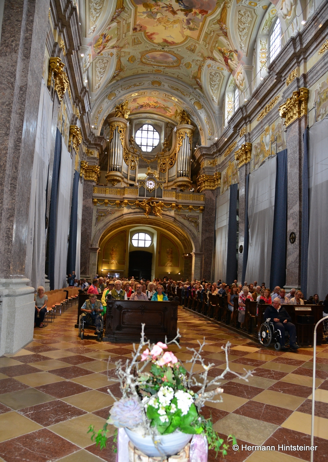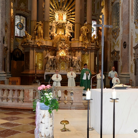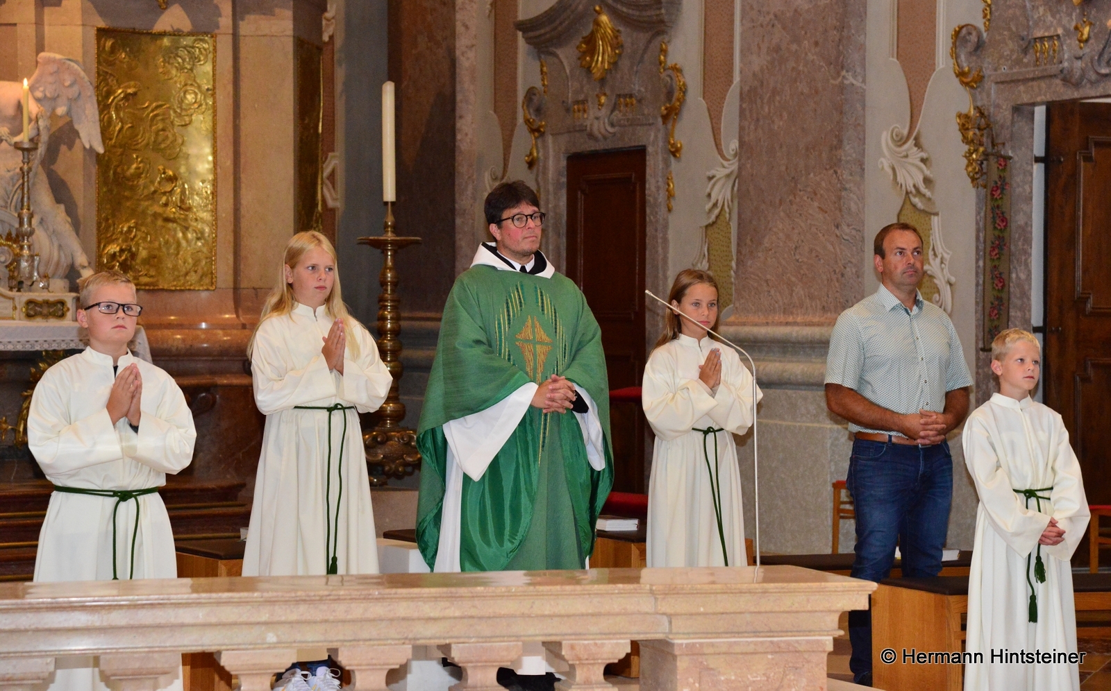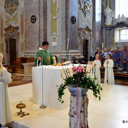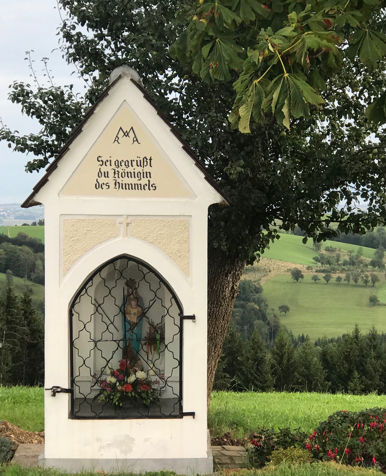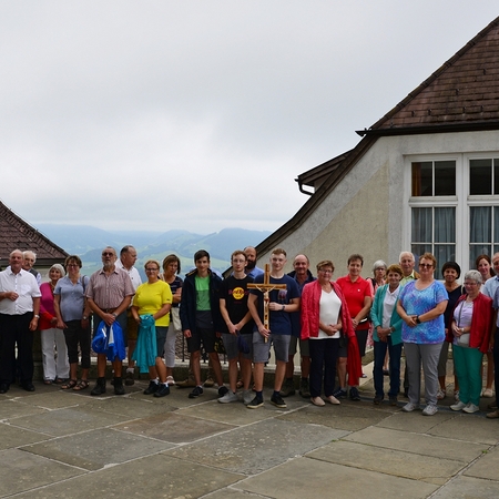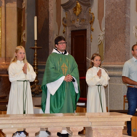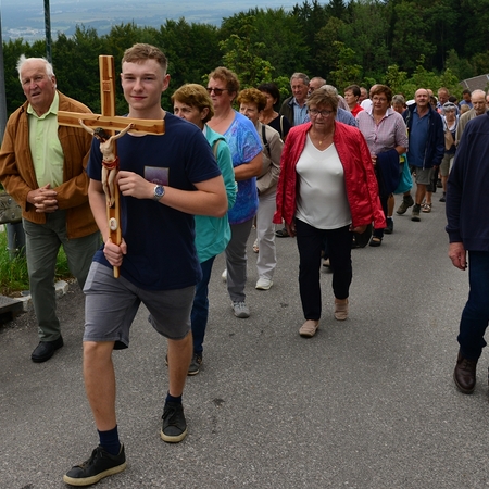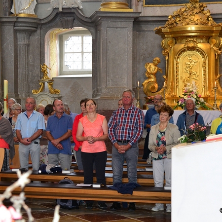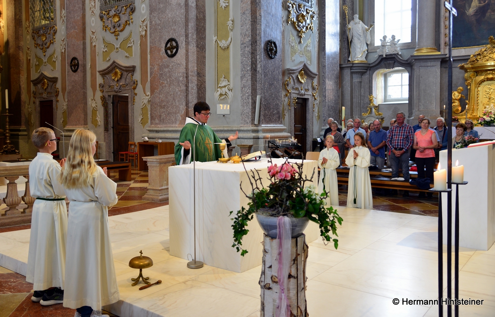 Am Sonntag, den 27. August fand unsere alljährliche Familienwallfahrt statt. Nach dem durch P. Florian erteilten Wallfahrersegen startete eine kleine Gruppe zu Fuß Richtung Sonntagberg. Einige Pilgerinnen und Pilger schlossen sich unterwegs noch an und so war es schließlich eine Schar von 18 Personen, die auf dem Wangelsteig den Berg hinauf marschierten. Bei der Dreifaltigkeitskapelle wurden sie dann von zahlreichen weiteren Pfarrangehörigen erwartet. Wir feierten dann mit P. Florian die Messe, die von einem Bläserensemble und Peter Putzer an der Orgel feierlich umrahmt wurde. Ein herzliches Dankeschön dafür und auch an Maria Gruber, die die Fußwallfahrt leitete und uns bereits unterwegs und am Schluss der Messe schöne spirituelle Gedanken mit auf den Weg gab.