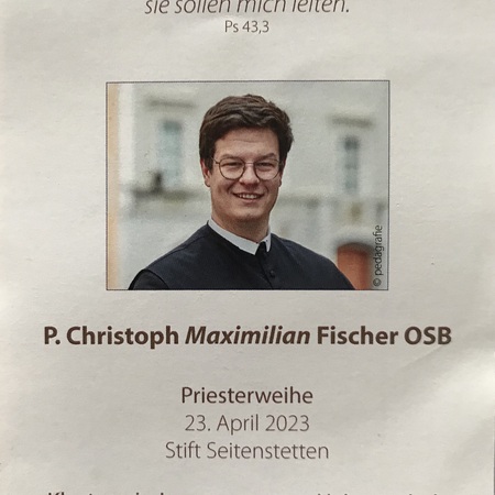 Wir wünschen P. Christoph für sein seelsorgliches Wirken - sei es als Jugendseelsorger im Schacherhof, als Kaplan in Aschbach ... - alles Gute und Gottes Segen!