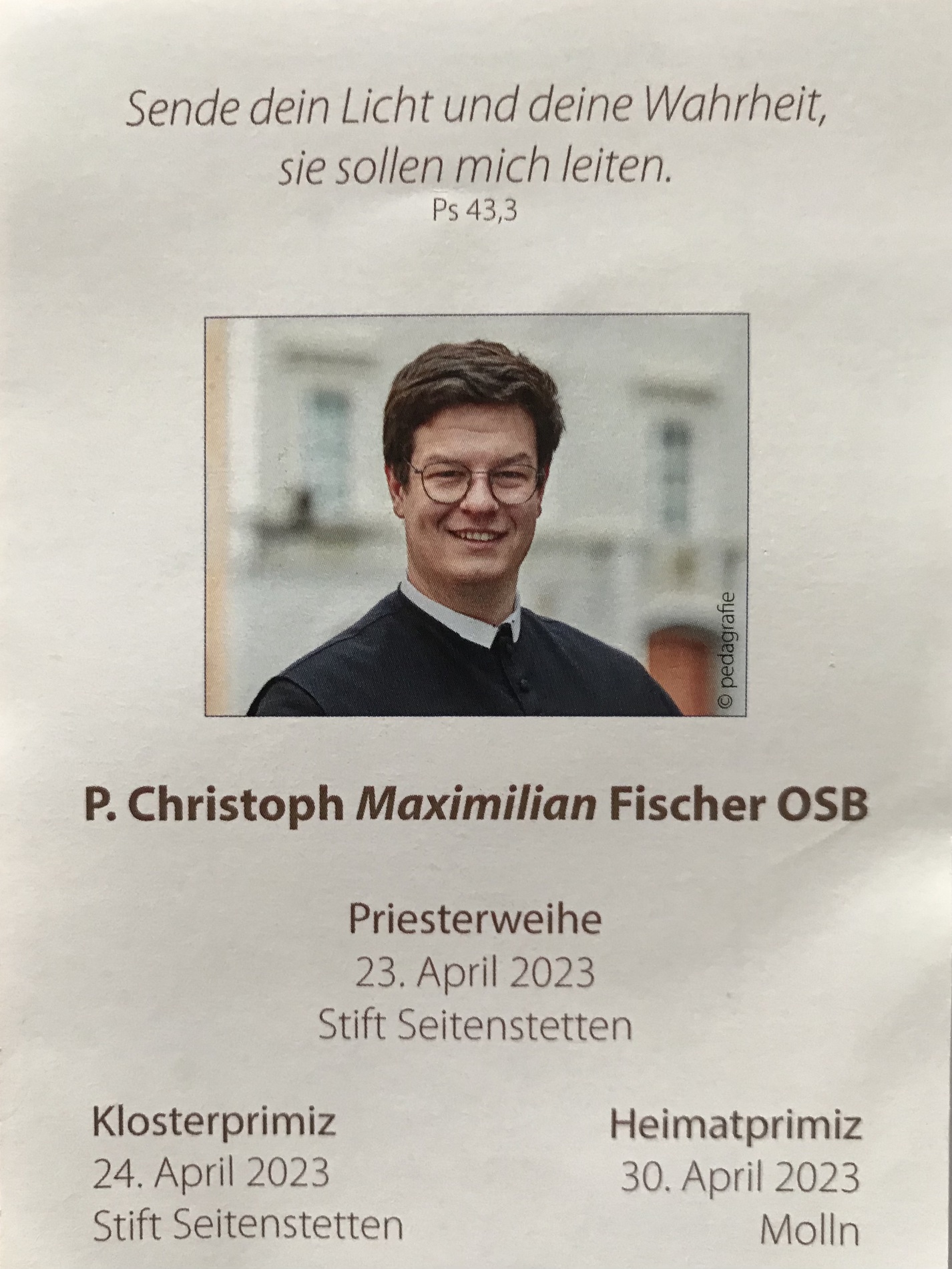Am Donnerstag, den 24. August 2023 konnten wir gemeinsam mit P. Christoph Fischer die Abendmesse feiern und im Anschluß daran persönlich von ihm den Primizsegen erhalten. Dieser Segen eines Neupriester gilt als sehr wertvoll. Früher sagte der Volksmund, dass es sich für einen Primizsegen lohnt, ein Paar Schuhsohlen durchzulaufen.