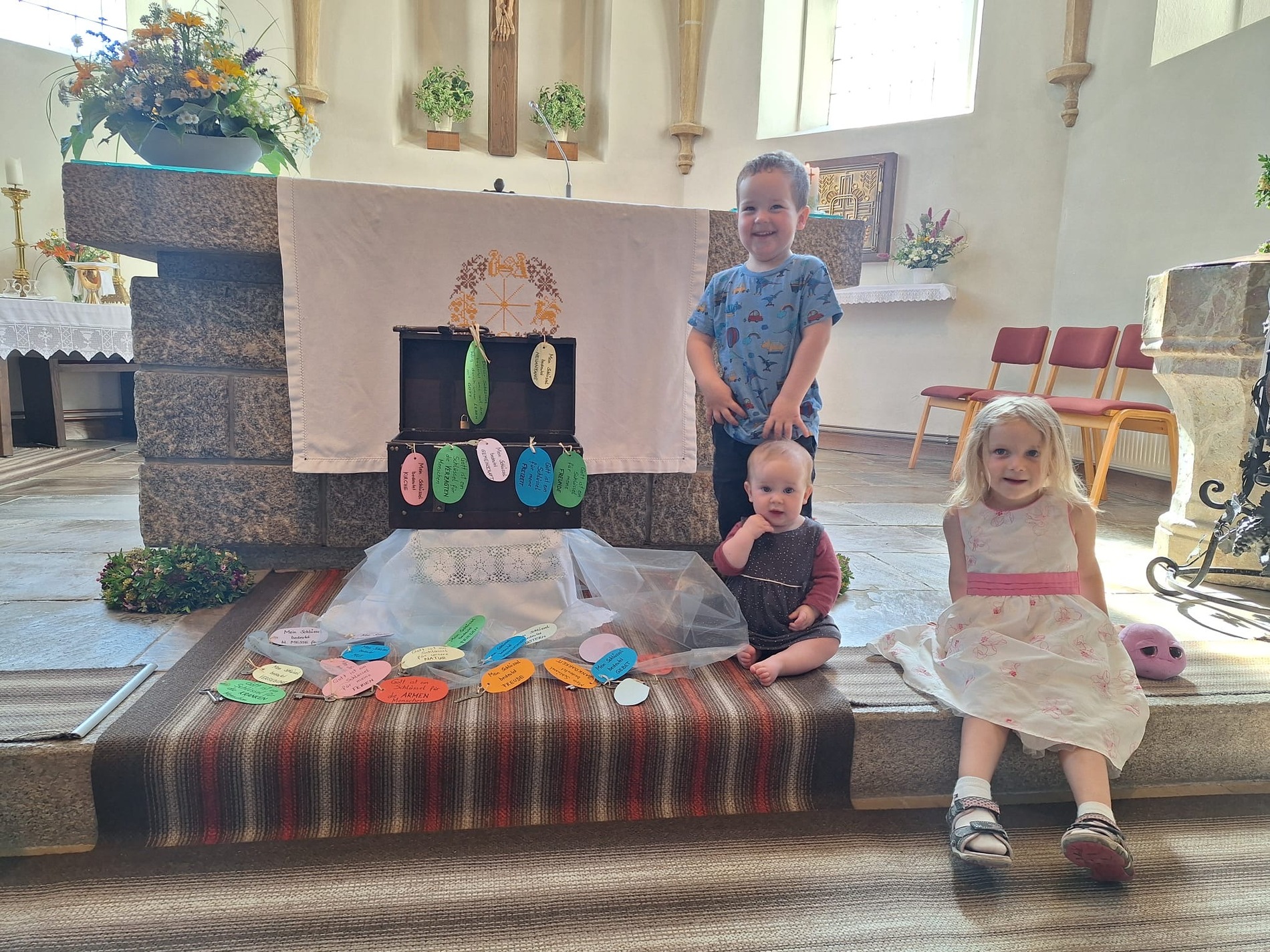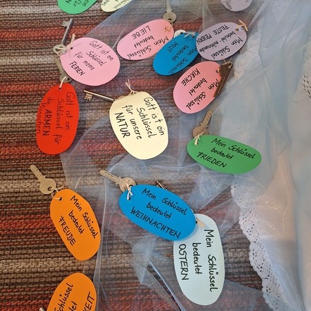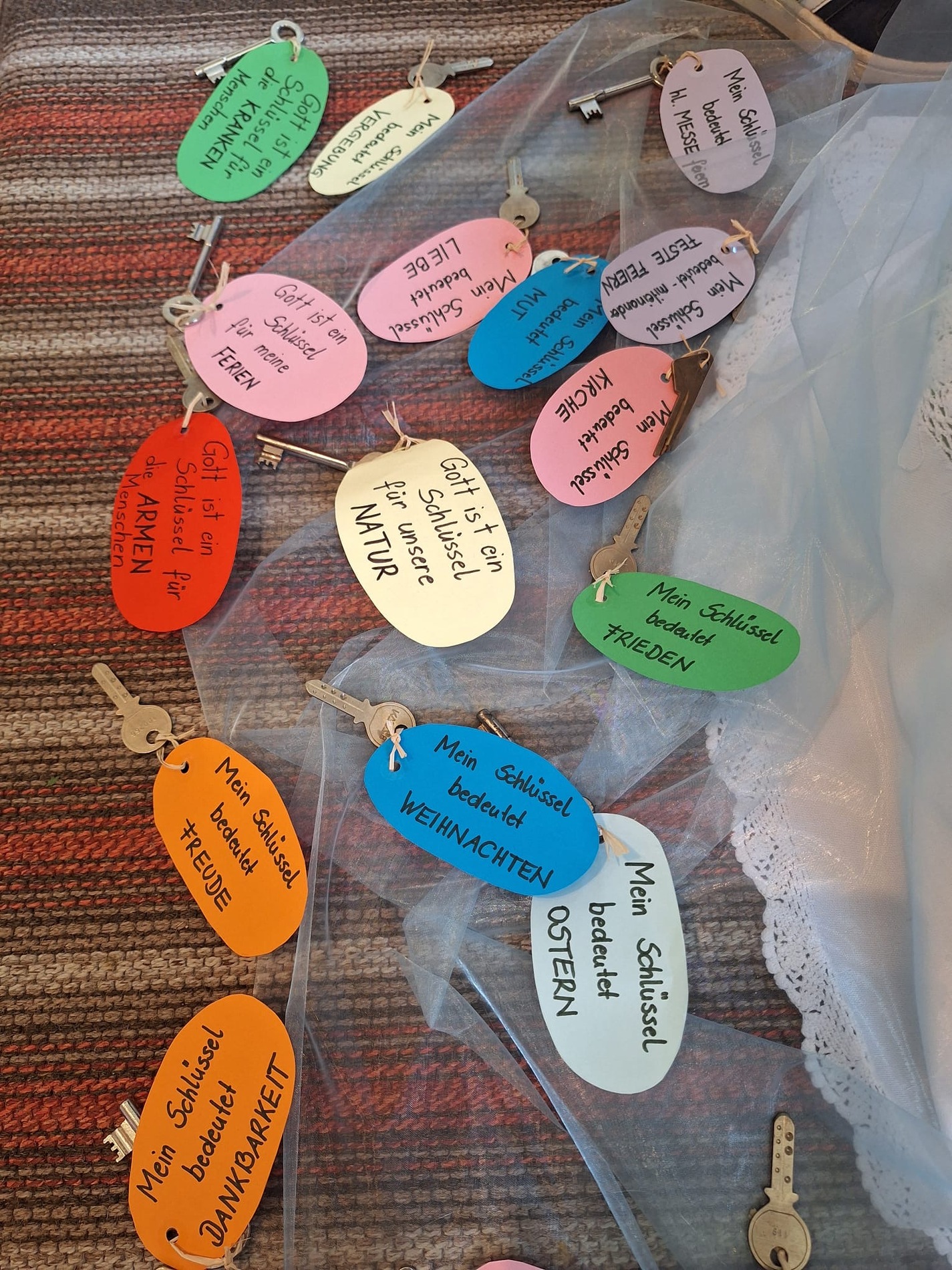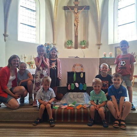 Die Kinder, die am ersten Feriensonntag zahlreich zur Familienmesse gekommen sind, legten Schlüssel mit Gedanken, was ein Schlüssel so alles bedeuten kann, in eine Schatzkiste: