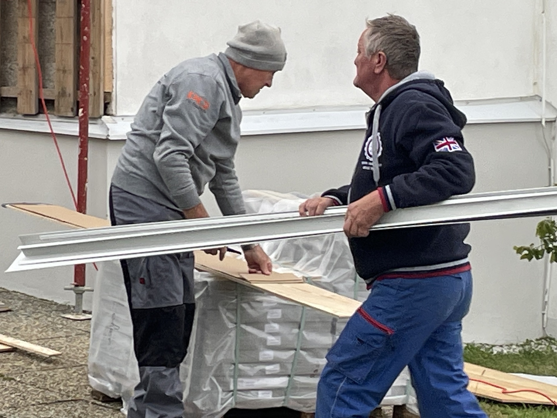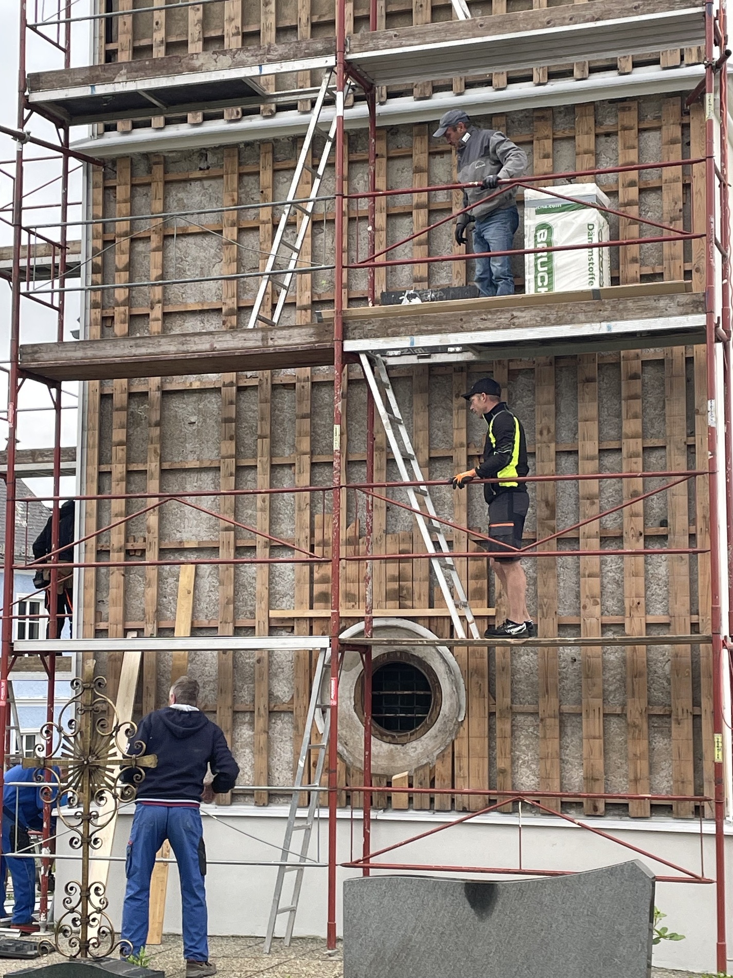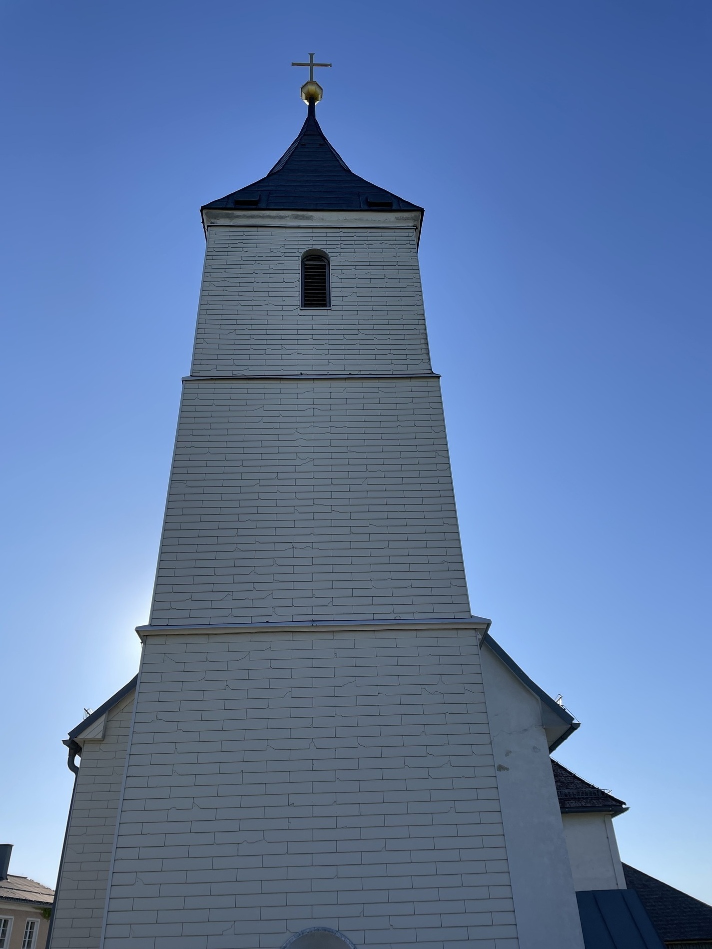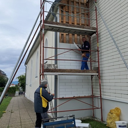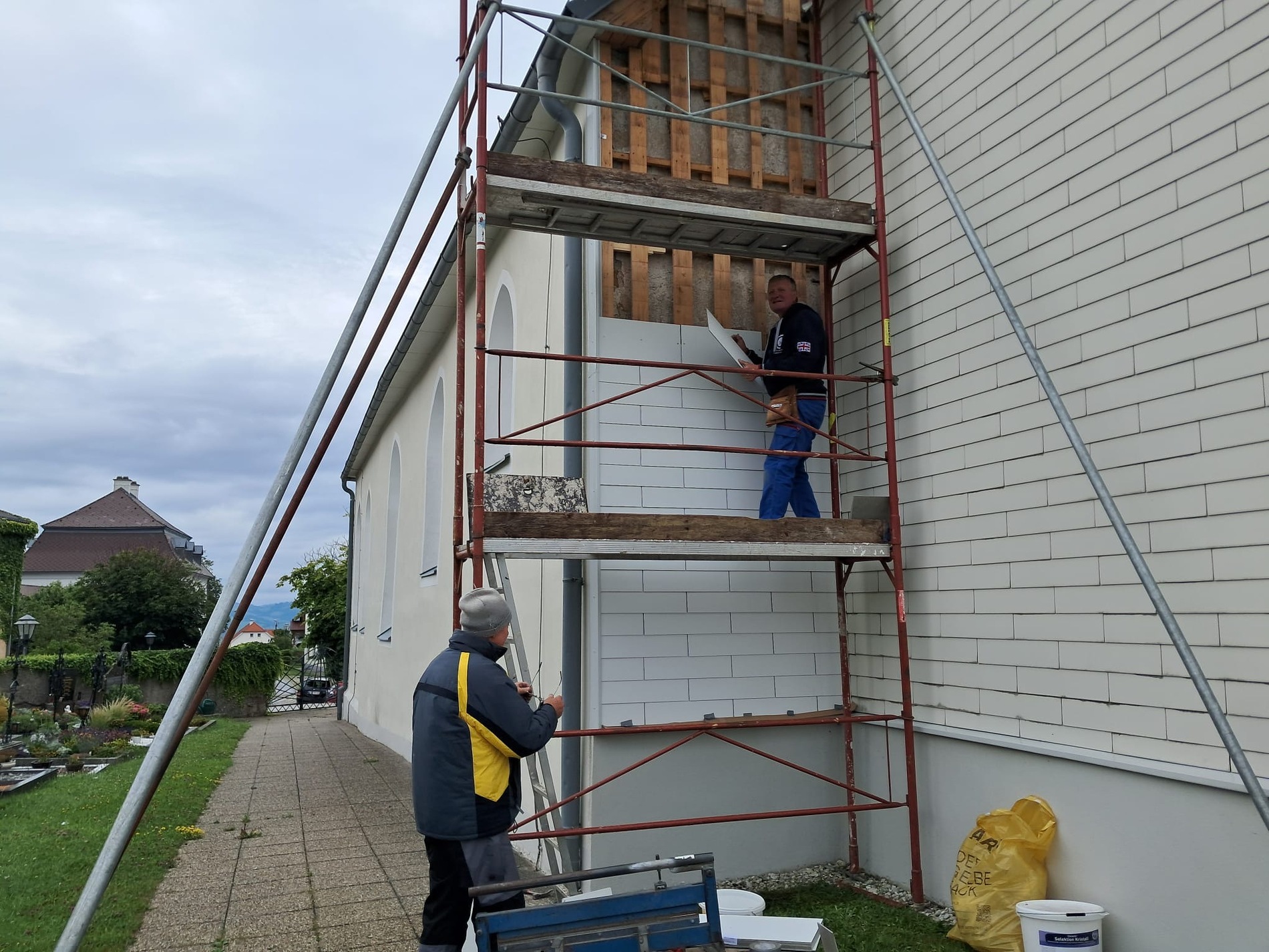 Wie es auf Baustellen so üblich ist, gab es auch diverse Nebenarbeiten (z. B. Streichen Gesims und Fensterumrahmung, Turmfenster reparieren und streichen). Dafür ein großes Dankeschön an Peter Gassner und Johannes Nefischer.