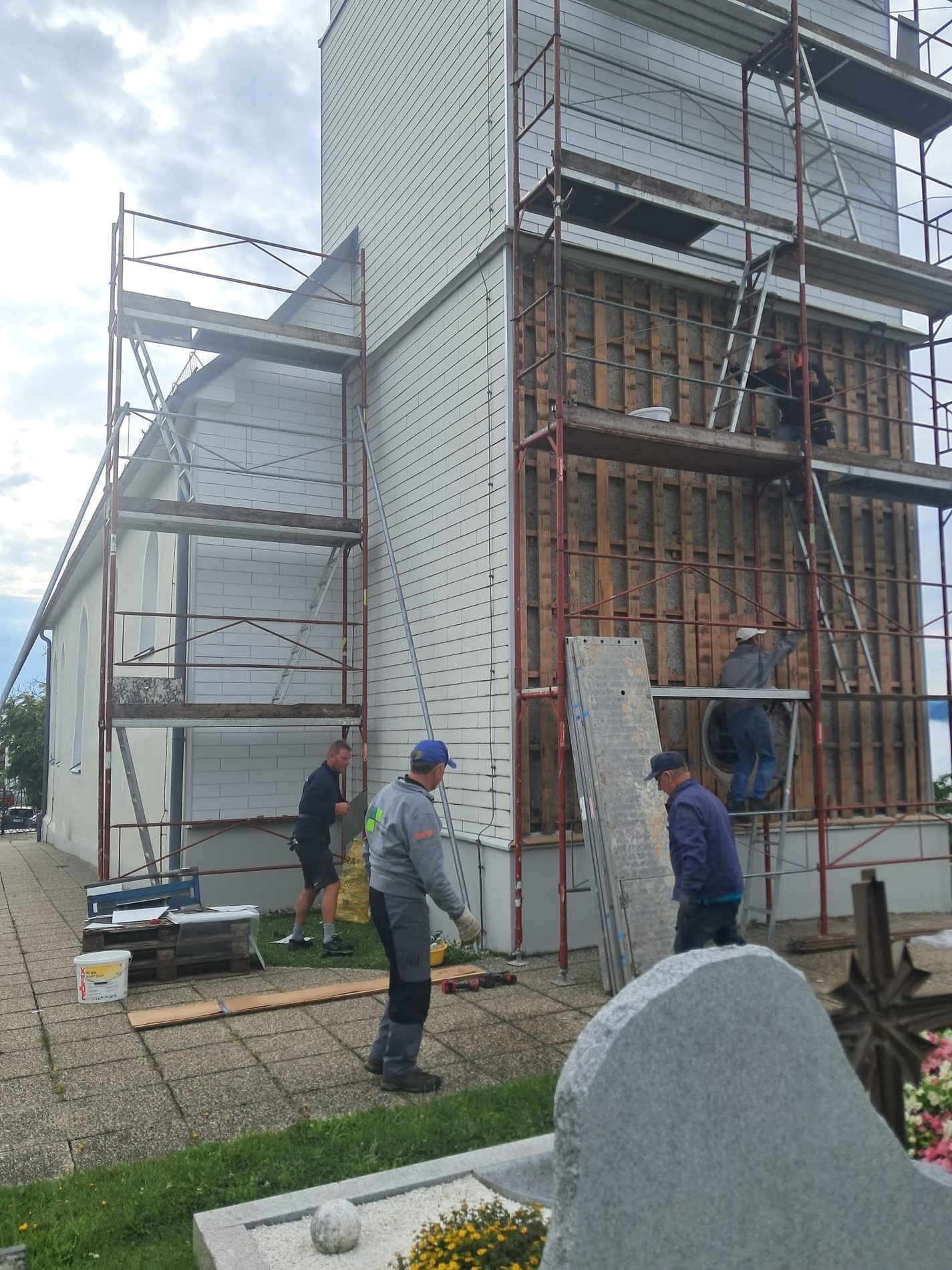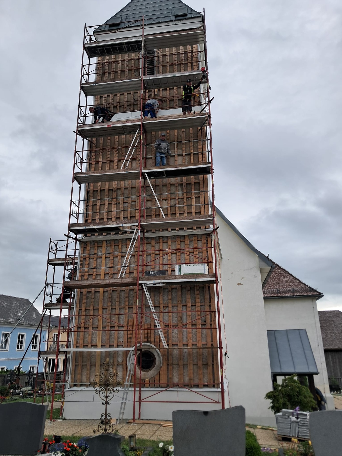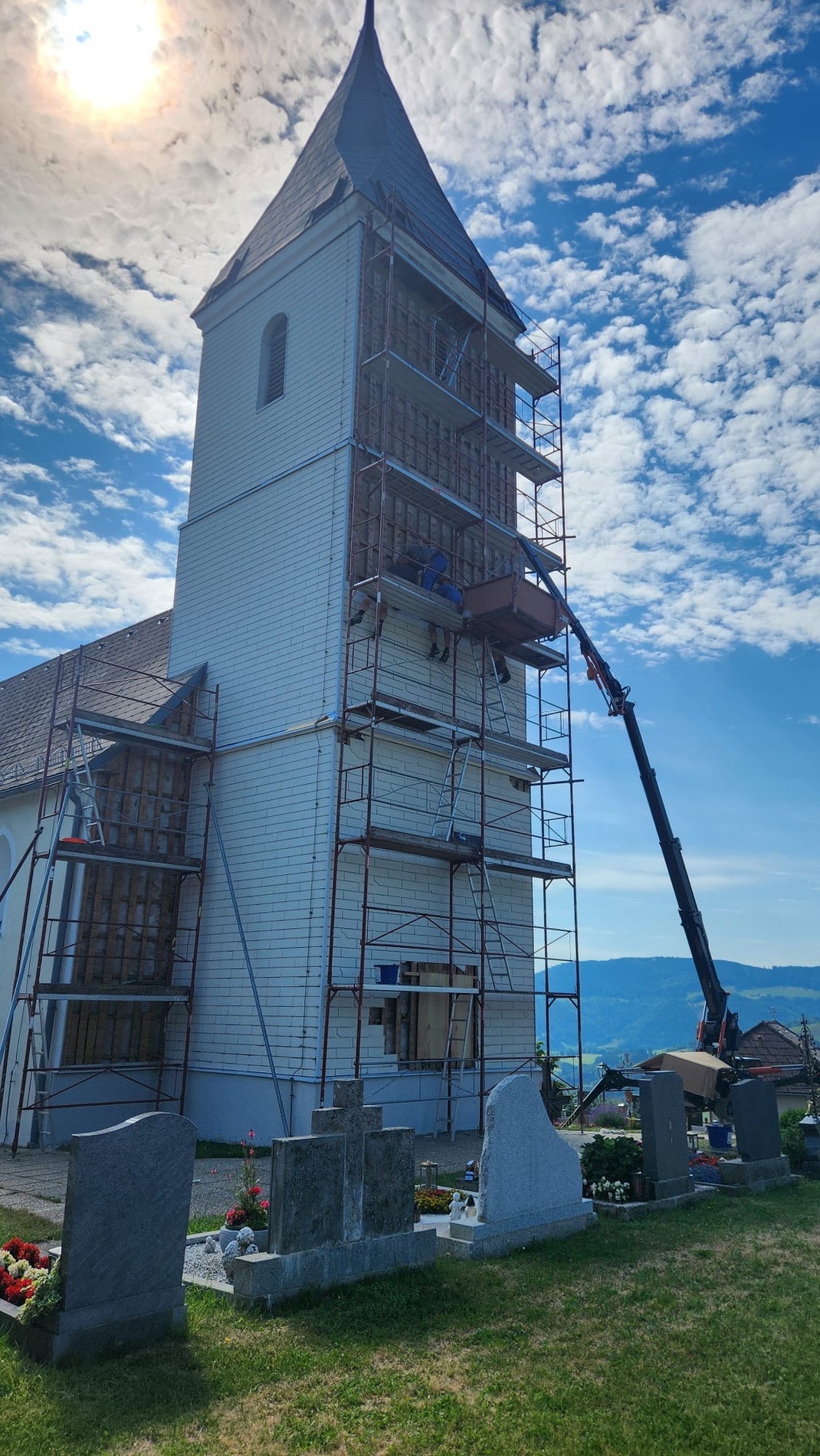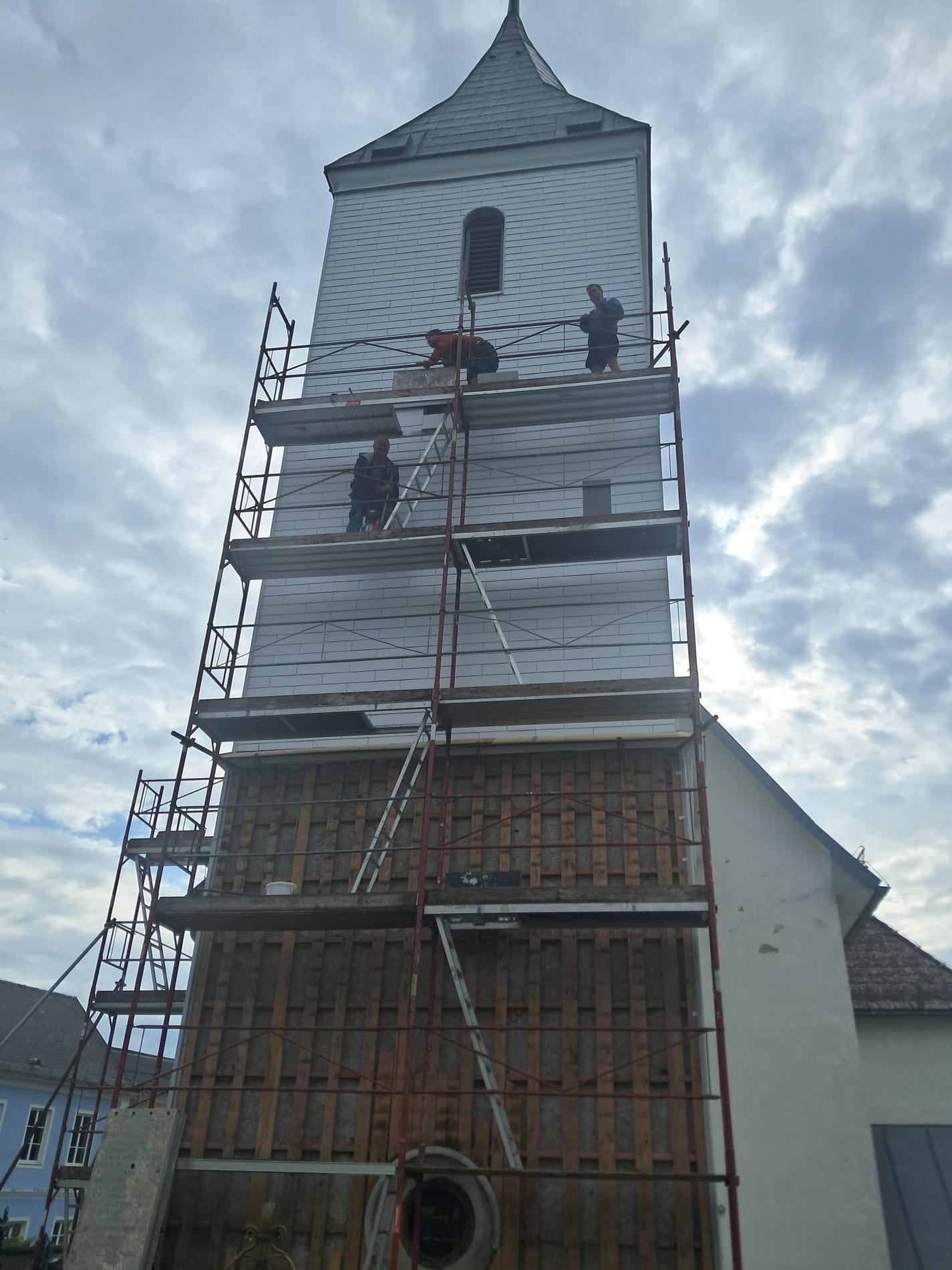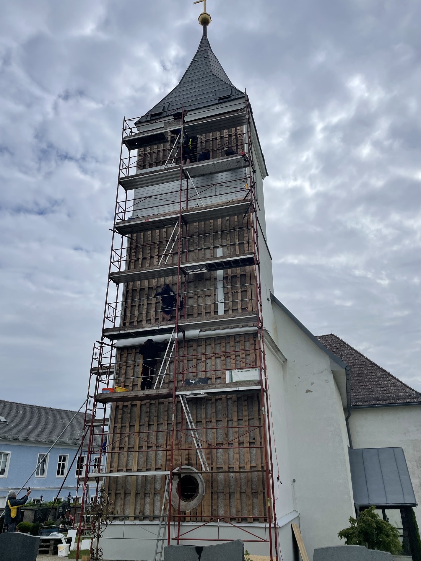 Am Donnerstag, den 3. Juli 2025 wurde der Kirchturm von der Firma Robert Weitz mit Hilfe engagierter Pfarrangehöriger eingerüstet und die Eternitplatten abgetragen. Der Unterbau war zum Glück intakt und brauchte nicht erneuert werden.