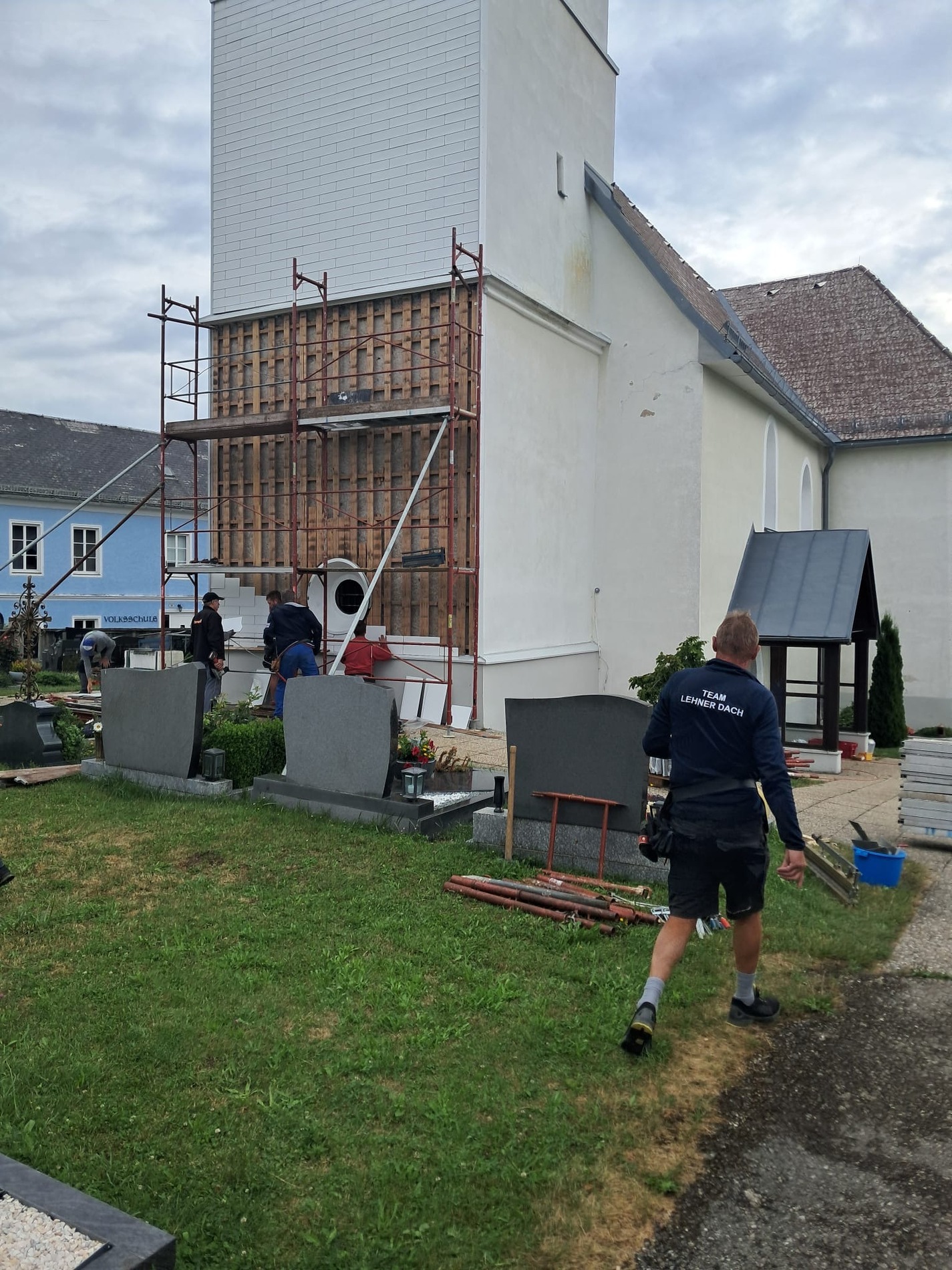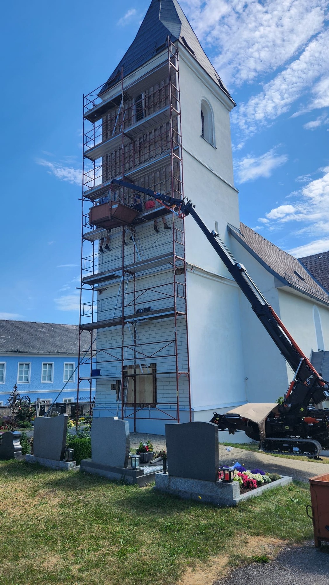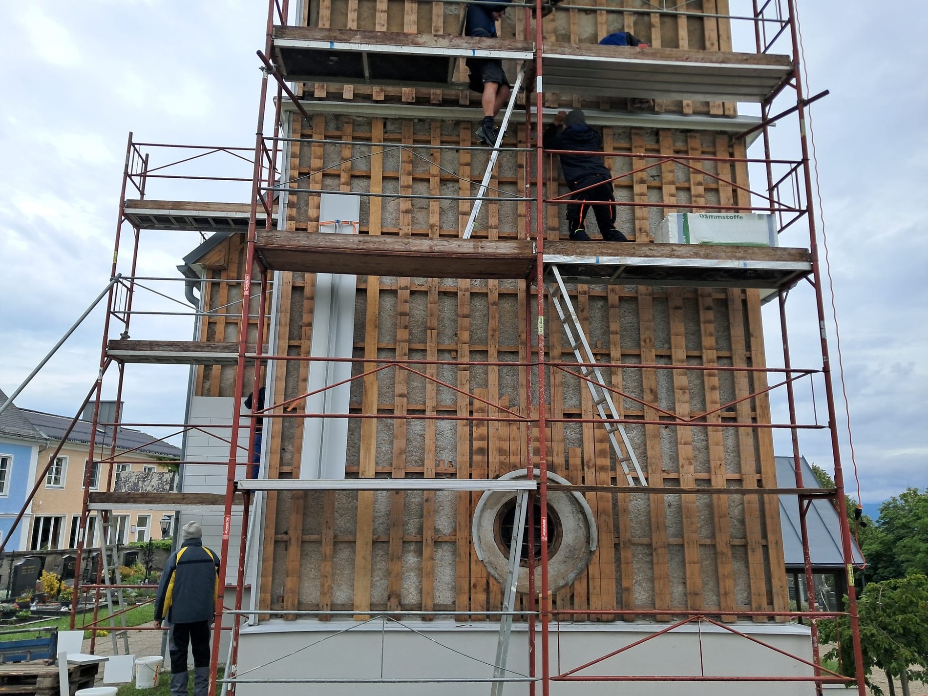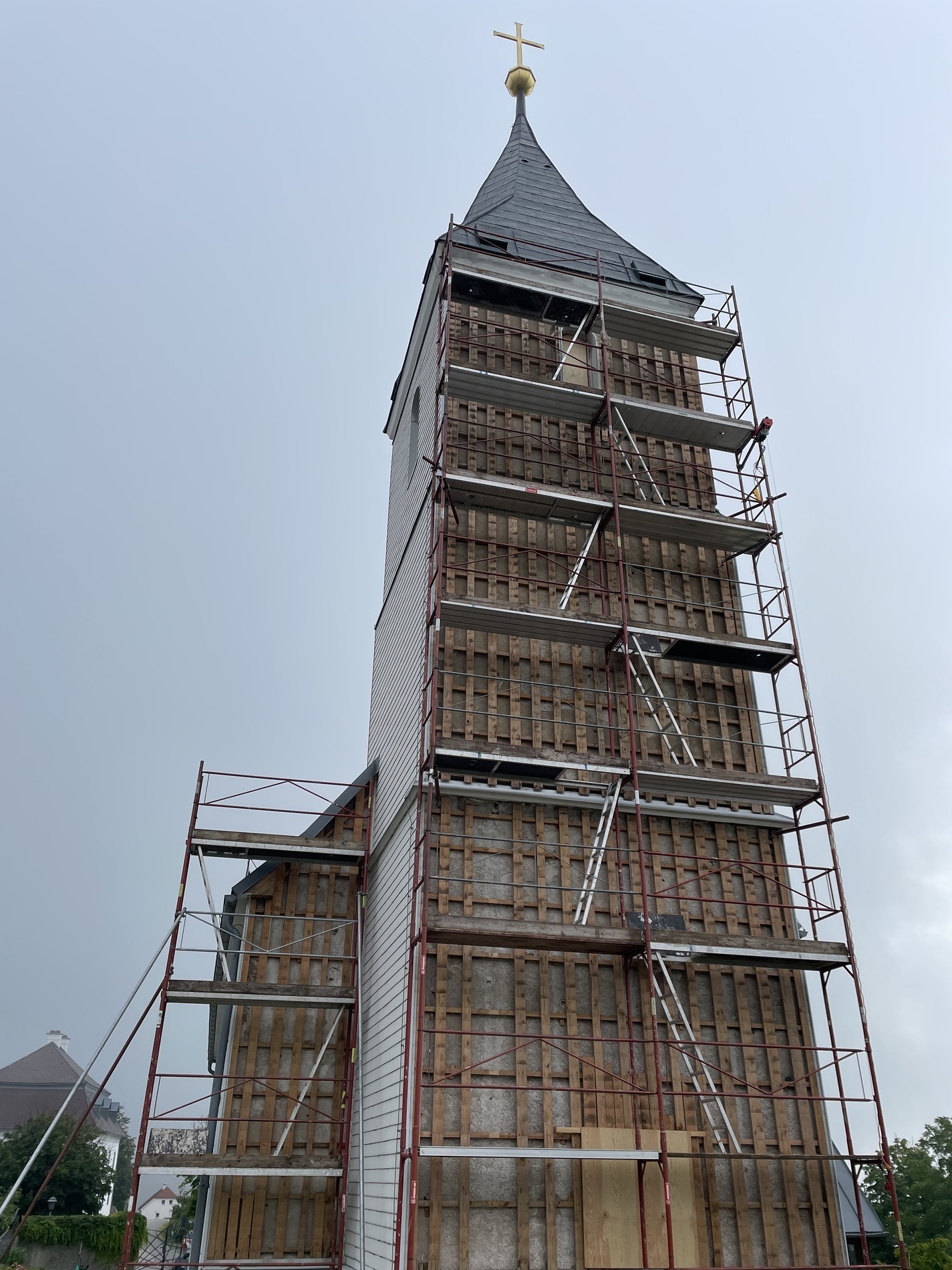 Am Donnerstag, den 3. Juli 2025 wurde der Kirchturm von der Firma Robert Weitz mit Hilfe engagierter Pfarrangehöriger eingerüstet und die Eternitplatten abgetragen. Der Unterbau war zum Glück intakt und brauchte nicht erneuert werden.