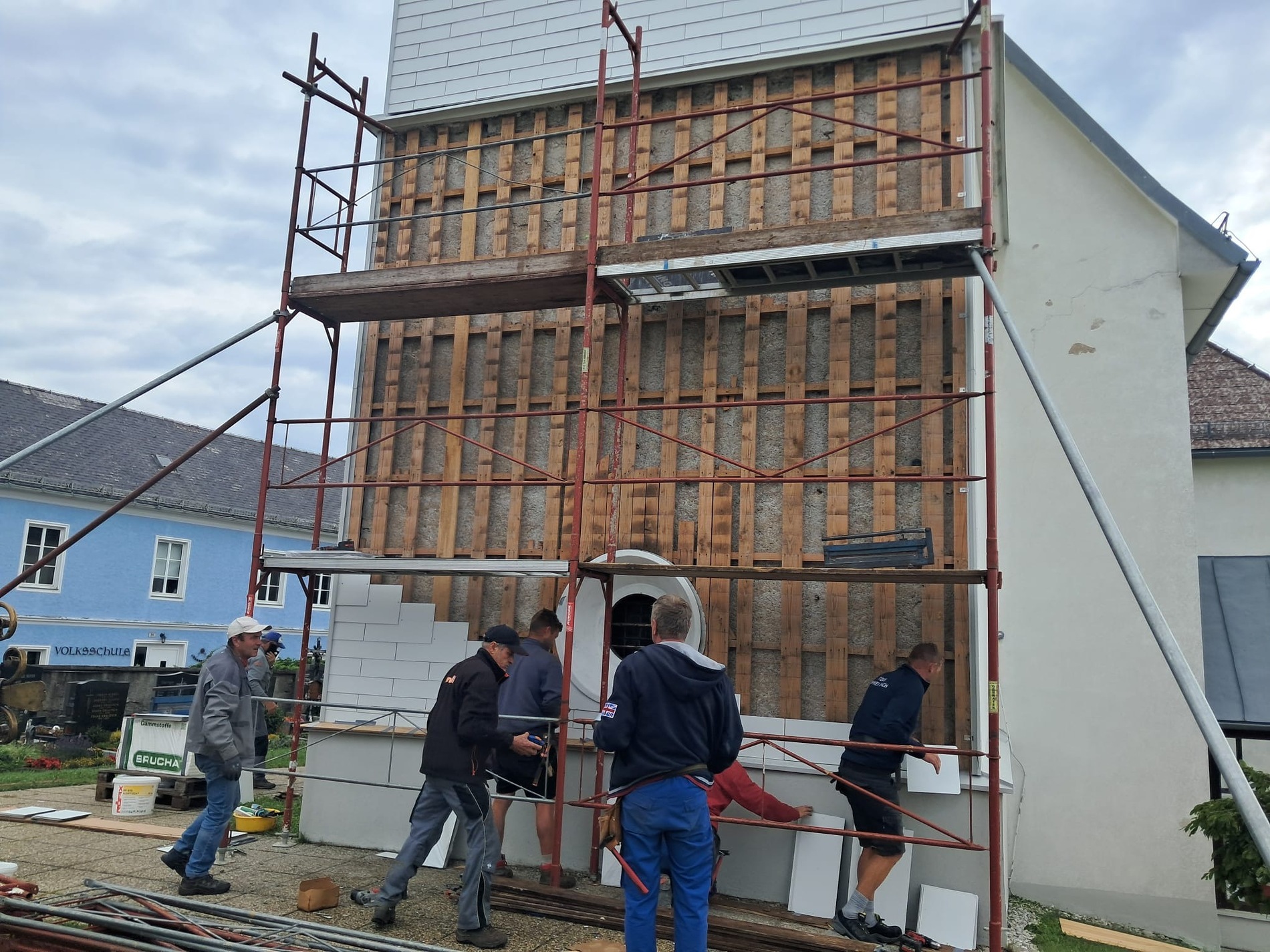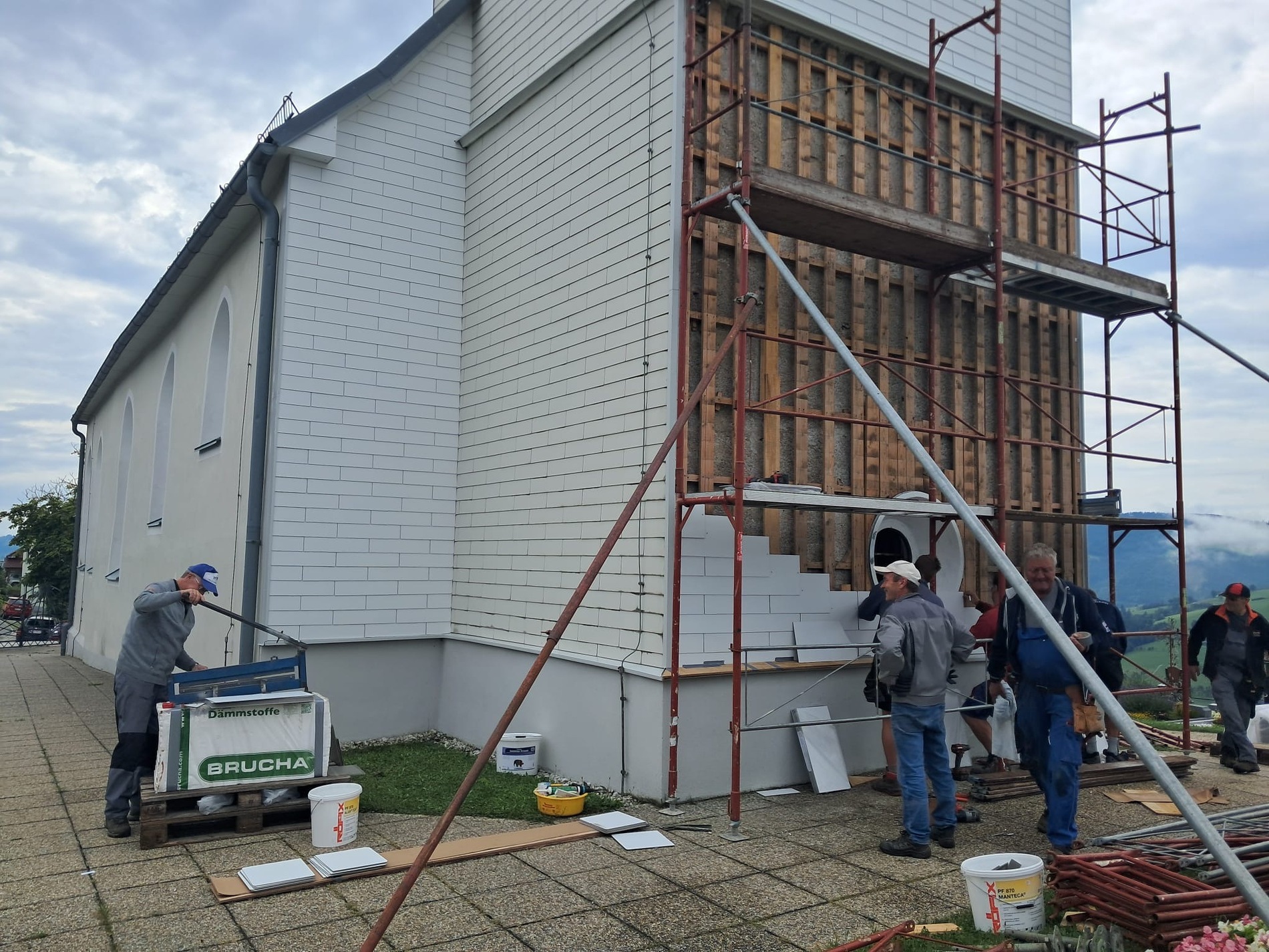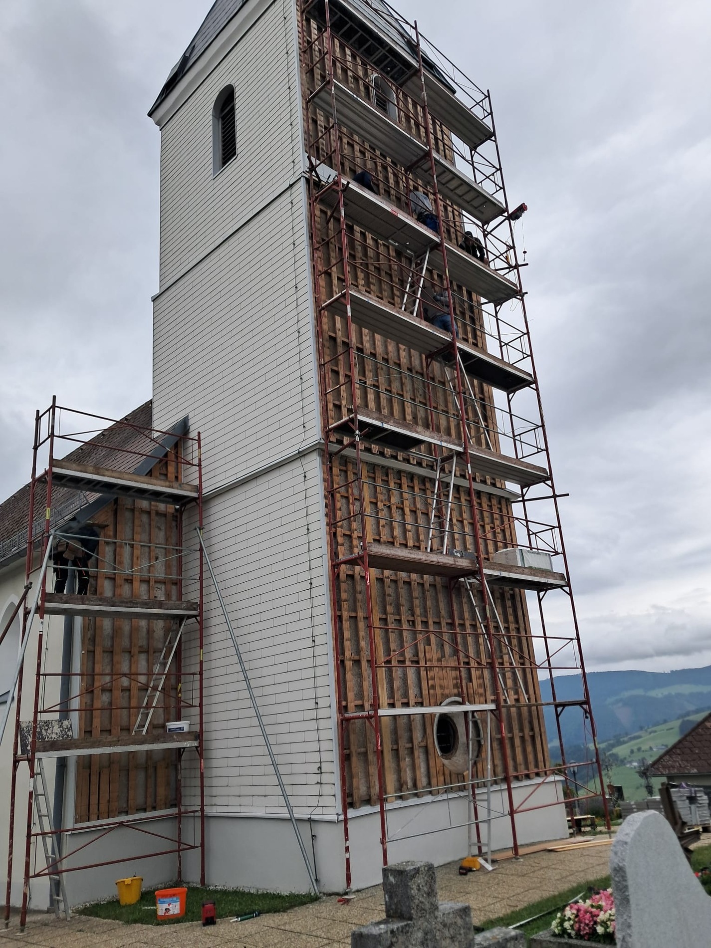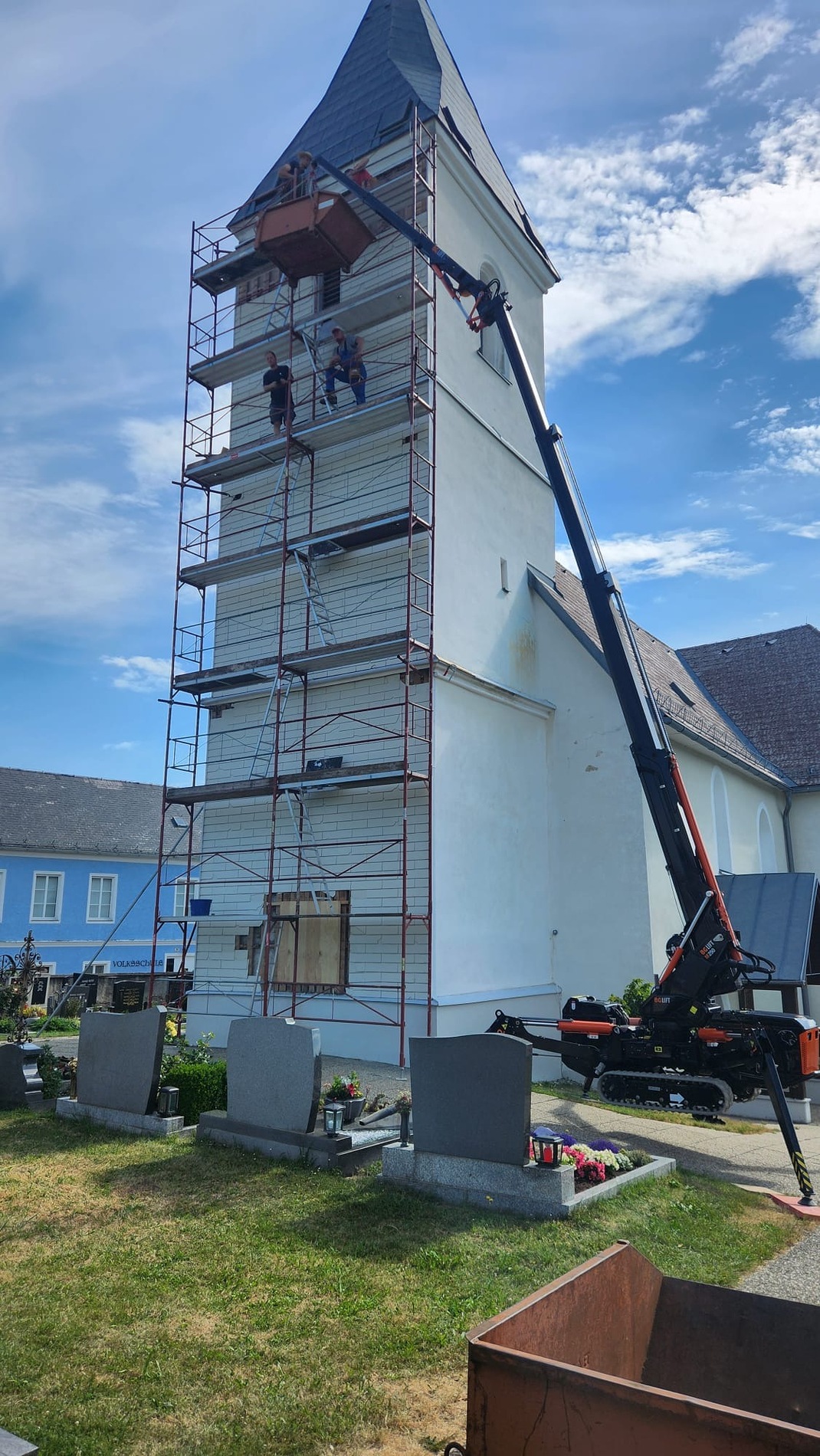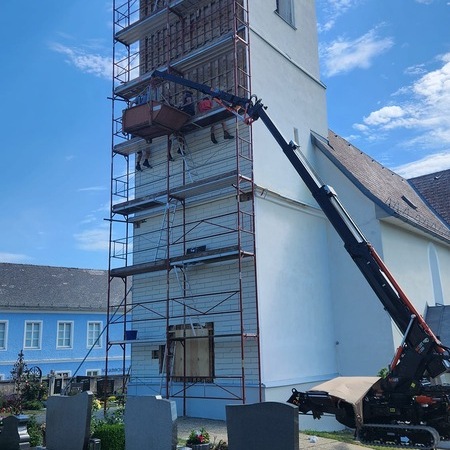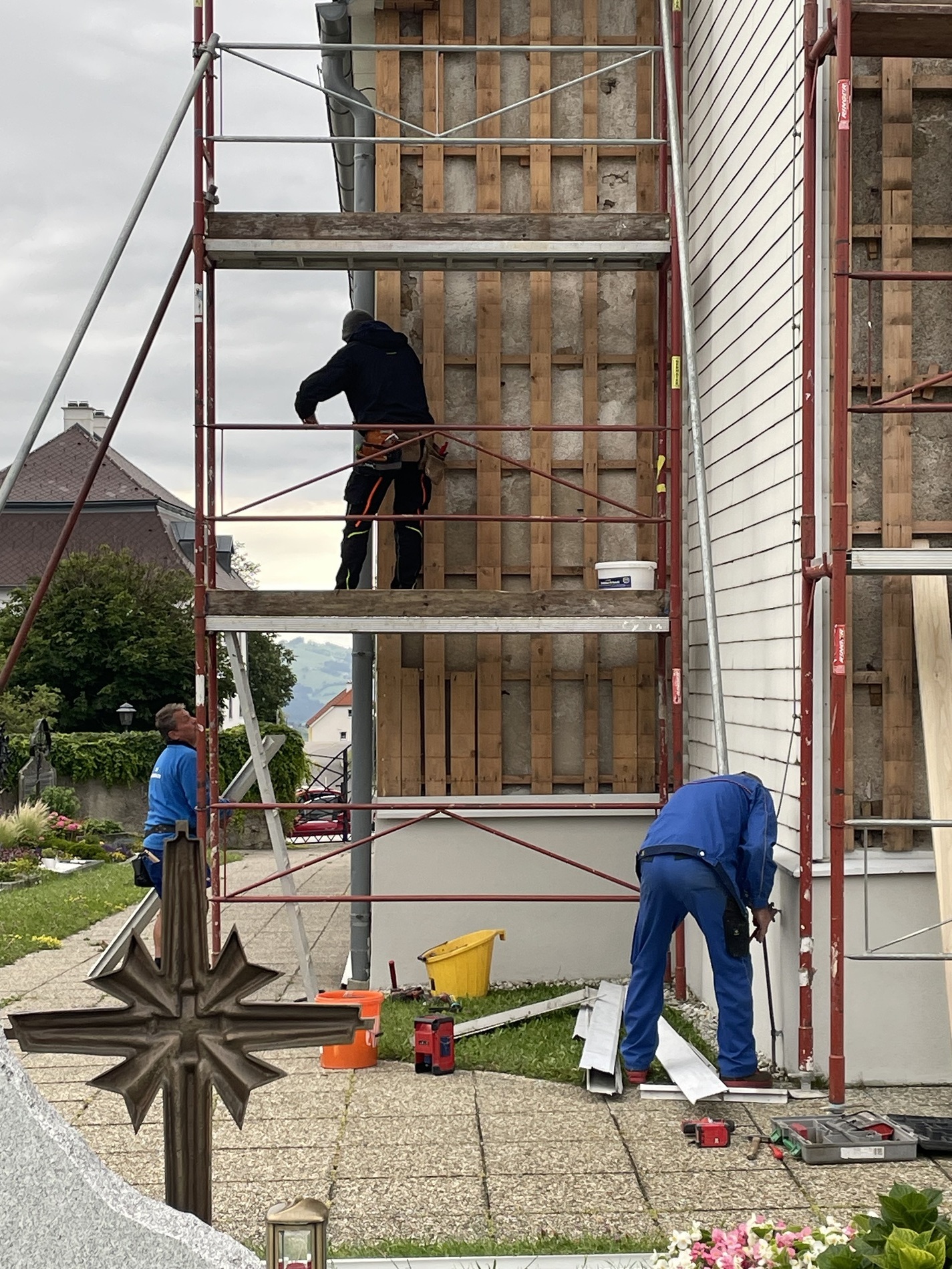 Am Donnerstag, den 3. Juli 2025 wurde der Kirchturm von der Firma Robert Weitz mit Hilfe engagierter Pfarrangehöriger eingerüstet und die Eternitplatten abgetragen. Der Unterbau war zum Glück intakt und brauchte nicht erneuert werden.