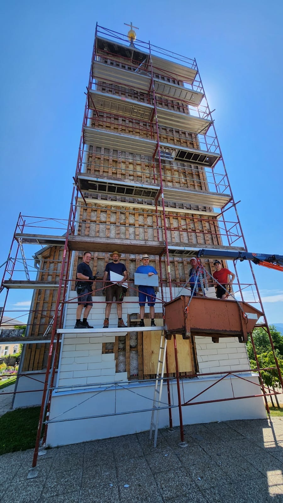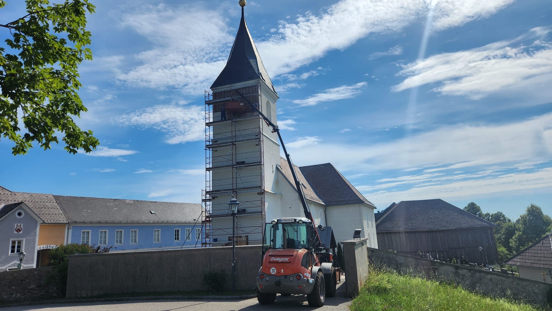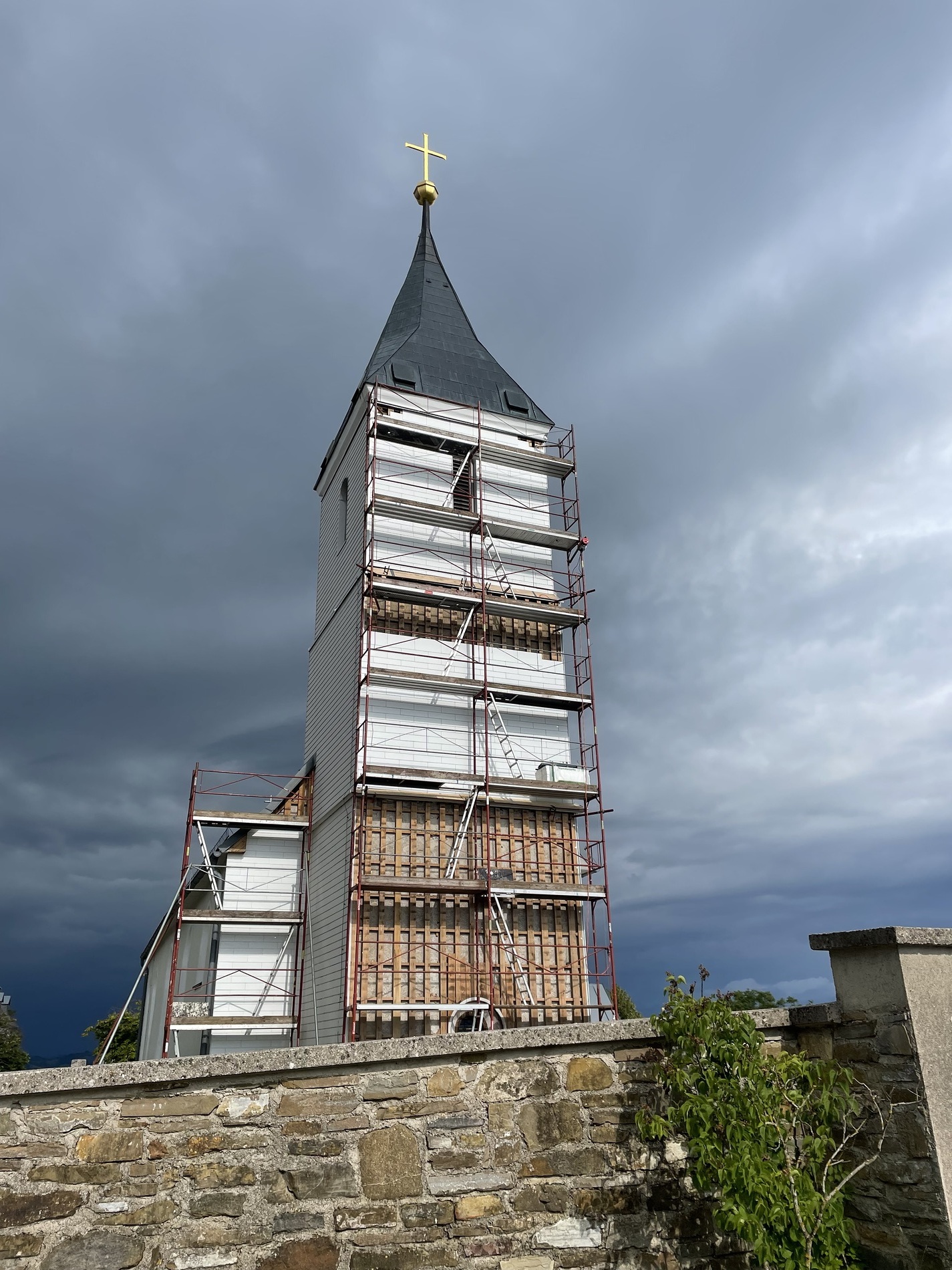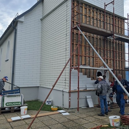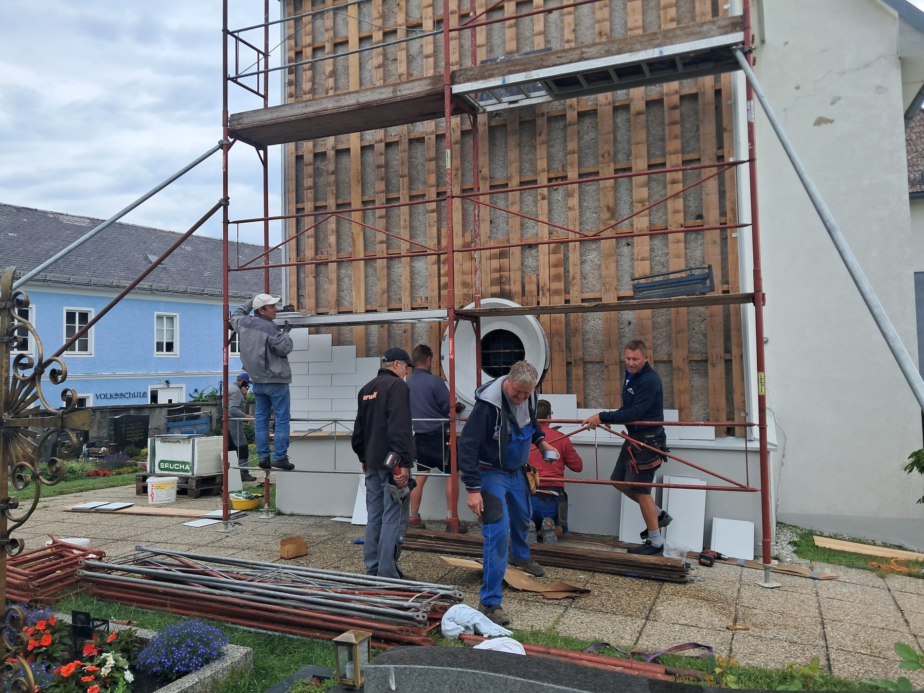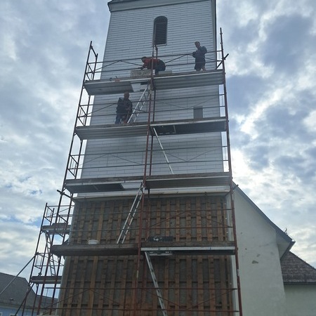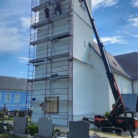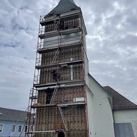 Am Donnerstag, den 3. Juli 2025 wurde der Kirchturm von der Firma Robert Weitz mit Hilfe engagierter Pfarrangehöriger eingerüstet und die Eternitplatten abgetragen. Der Unterbau war zum Glück intakt und brauchte nicht erneuert werden.