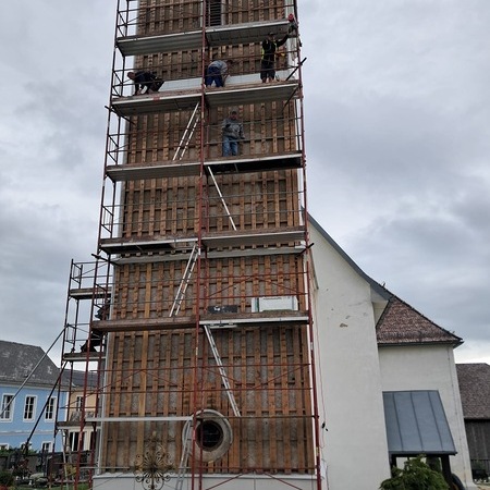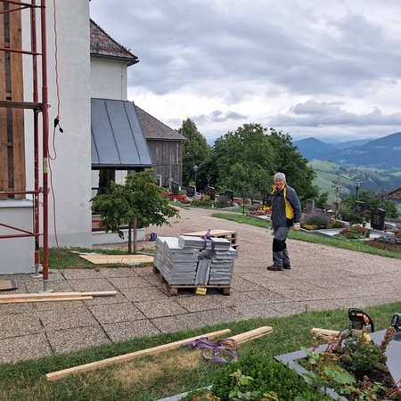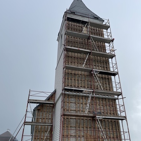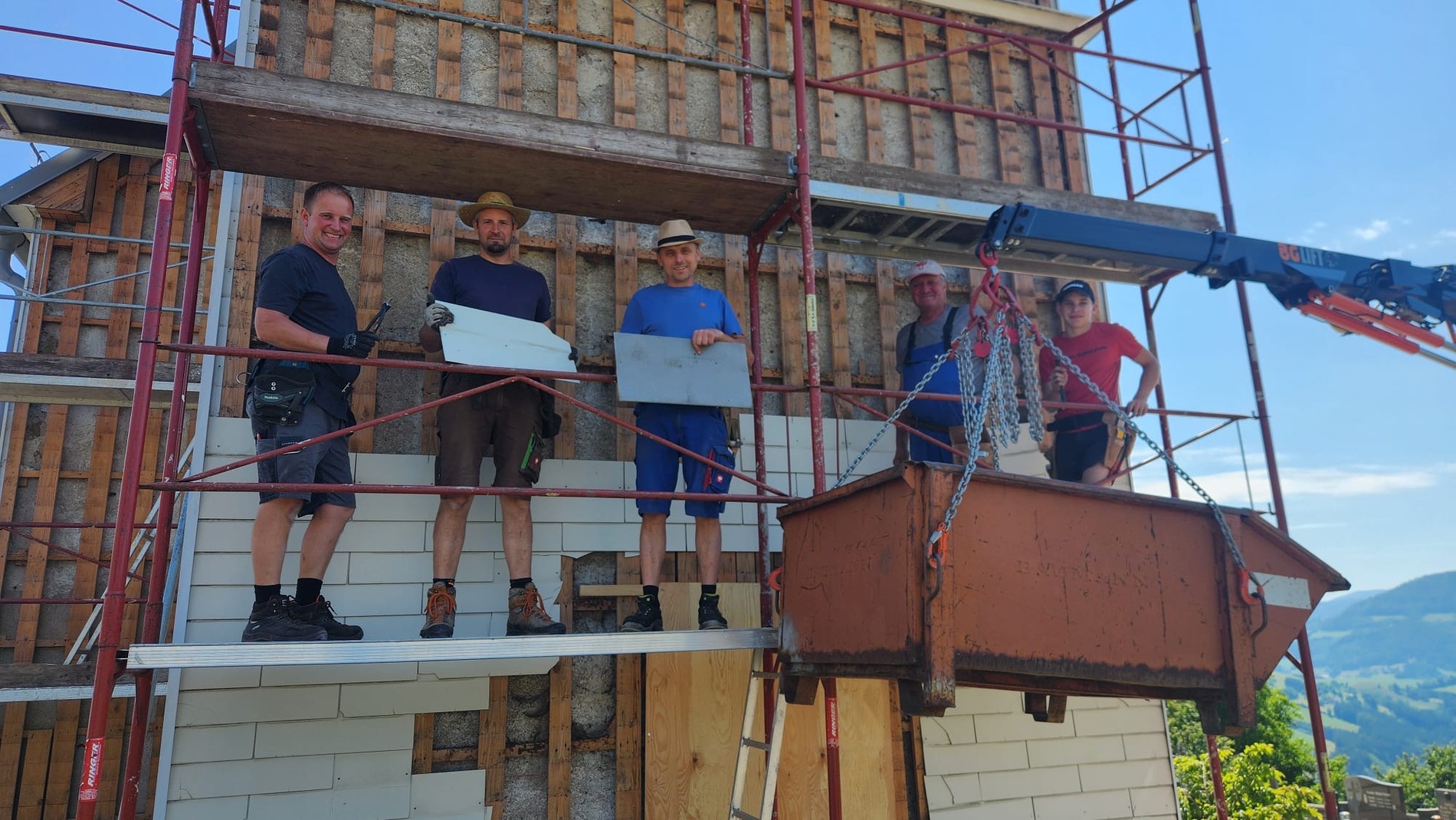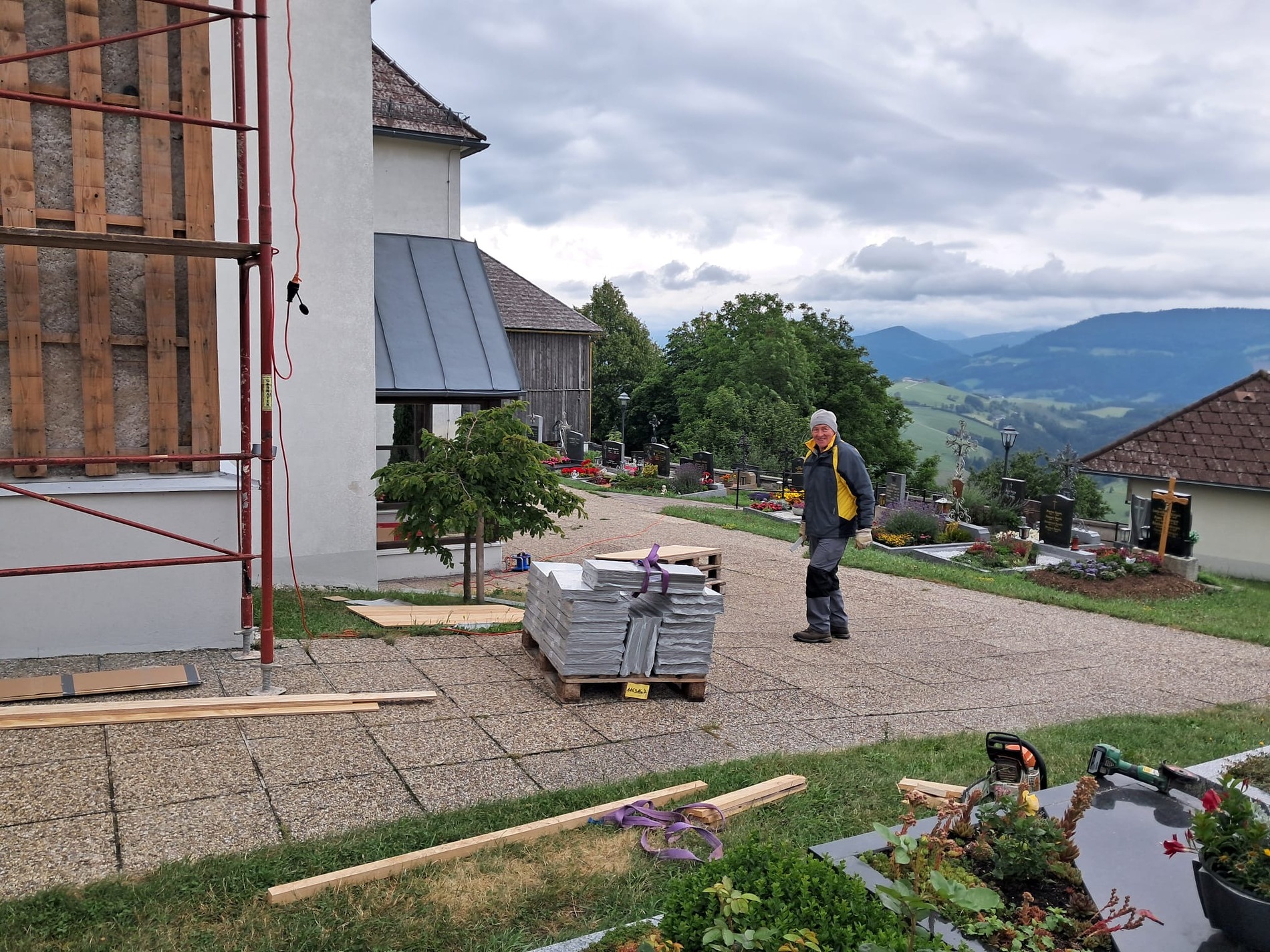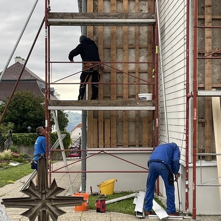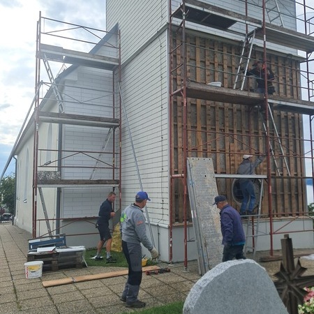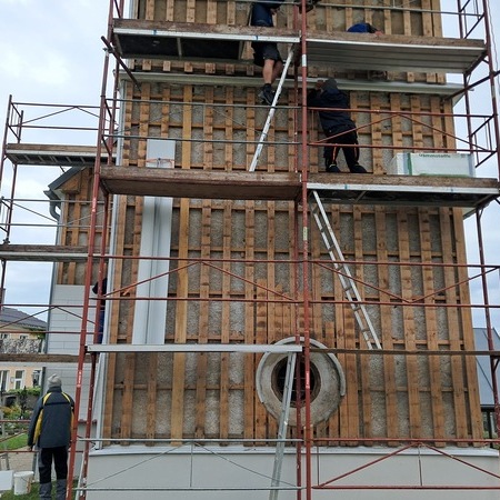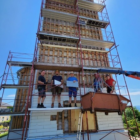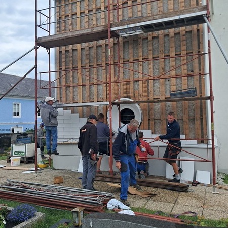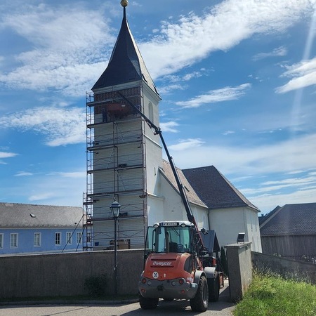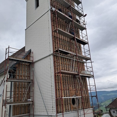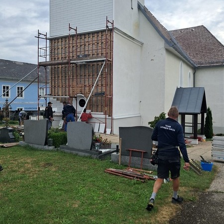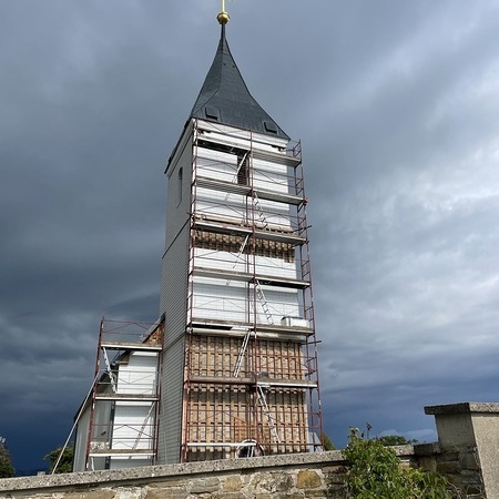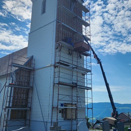 Am Donnerstag, den 3. Juli 2025 wurde der Kirchturm von der Firma Robert Weitz mit Hilfe engagierter Pfarrangehöriger eingerüstet und die Eternitplatten abgetragen. Der Unterbau war zum Glück intakt und brauchte nicht erneuert werden.