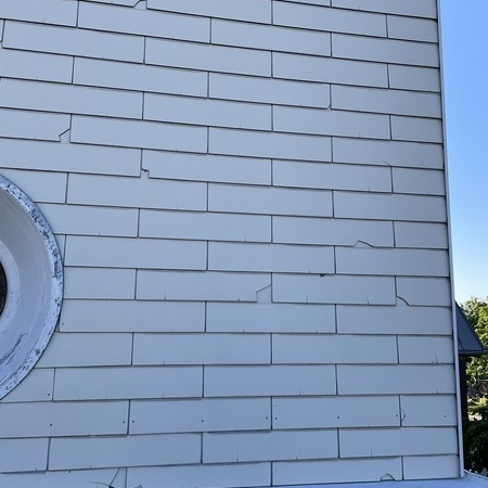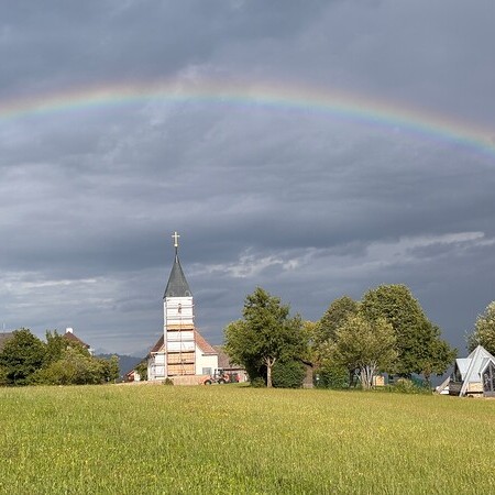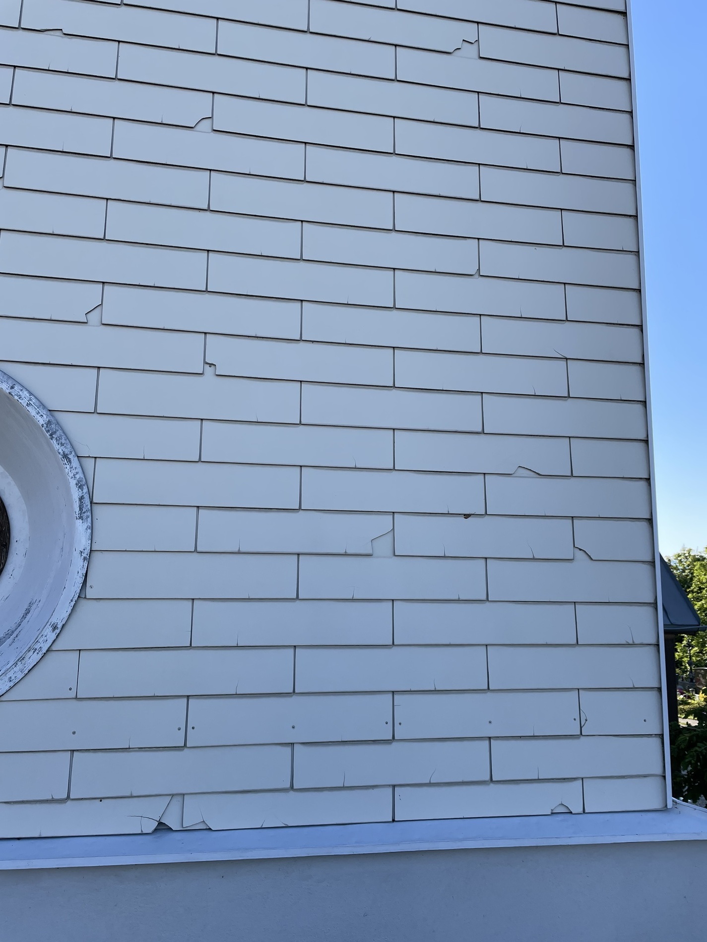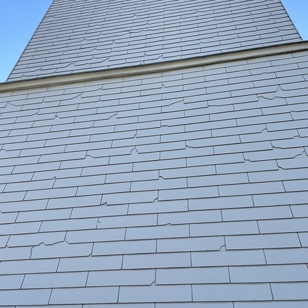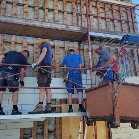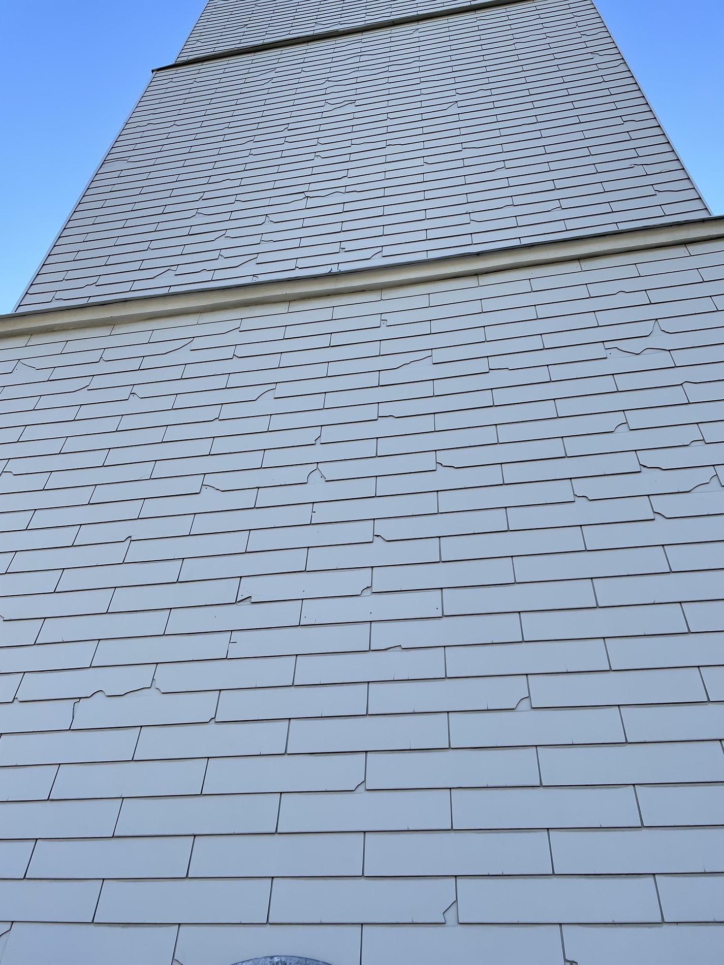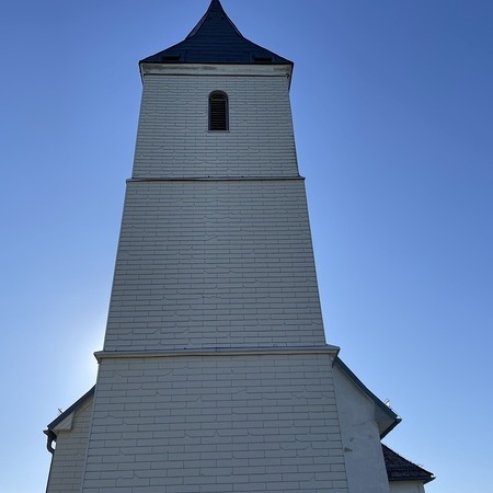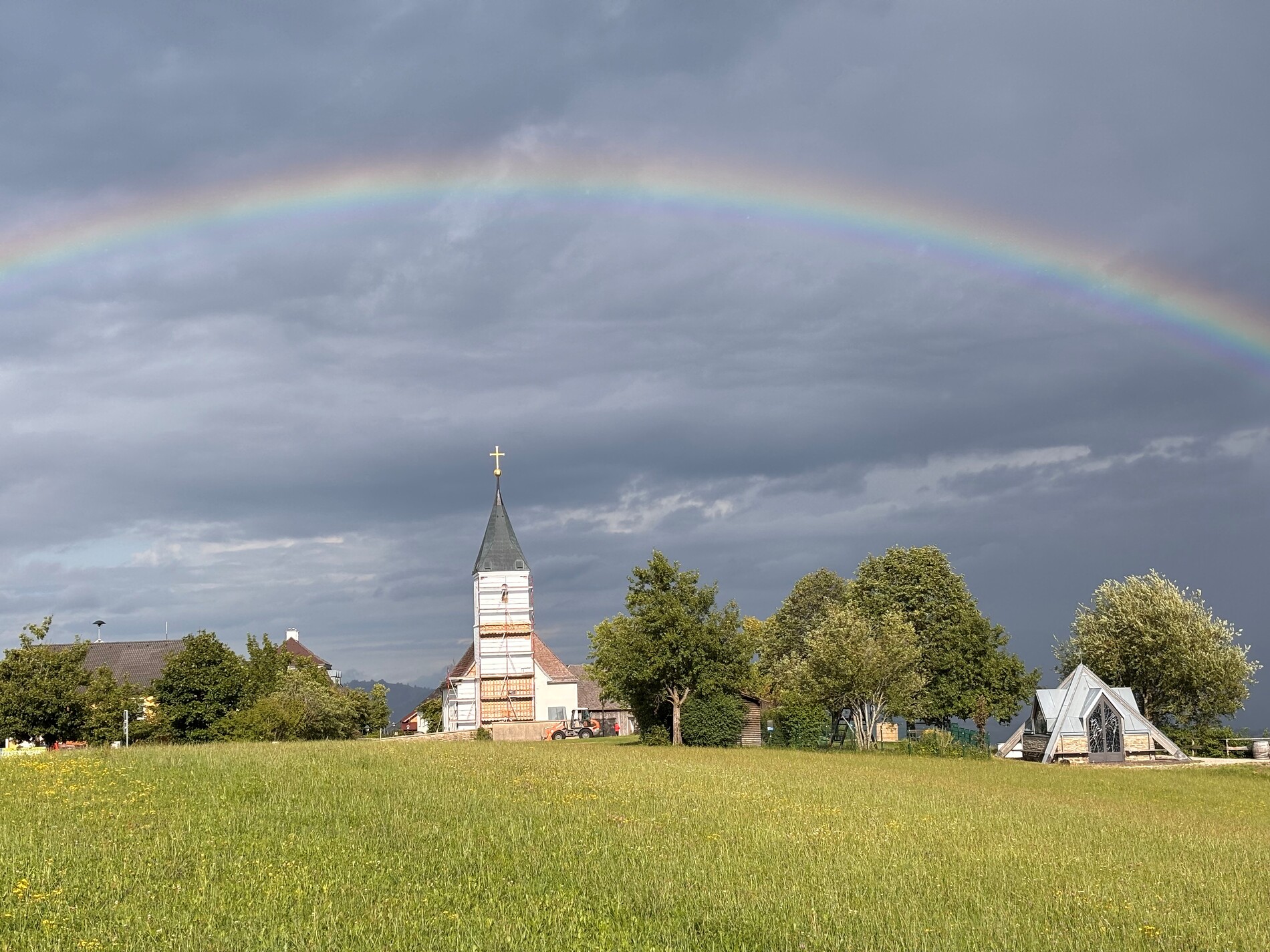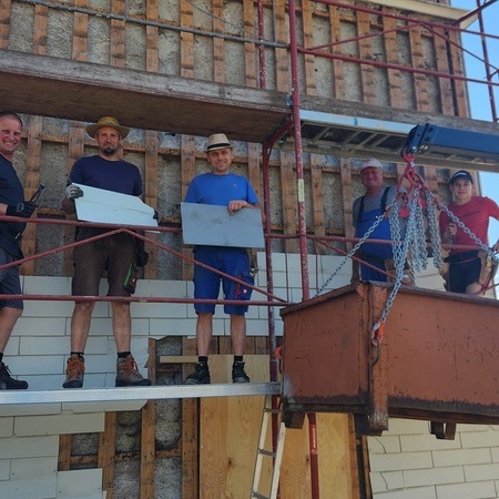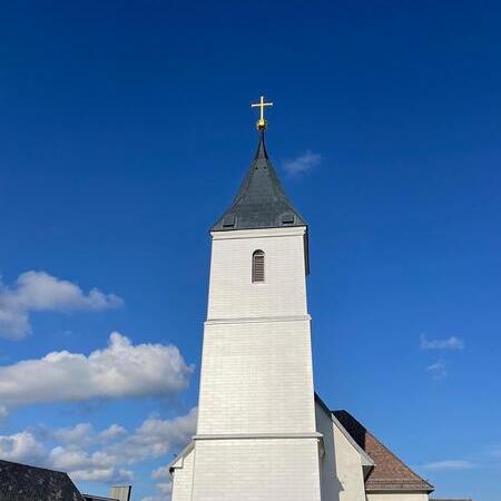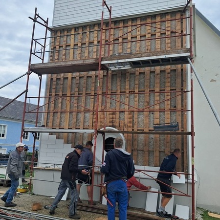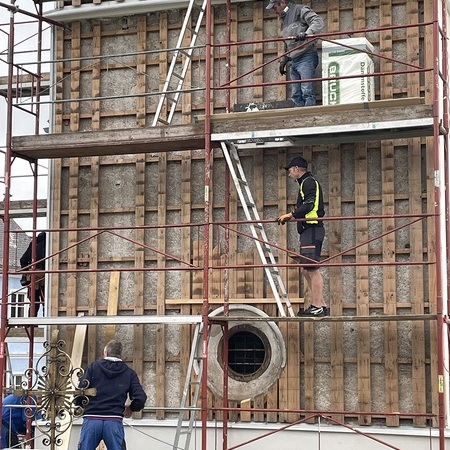 Am Donnerstag, den 3. Juli 2025 wurde der Kirchturm von der Firma Robert Weitz mit Hilfe engagierter Pfarrangehöriger eingerüstet und die Eternitplatten abgetragen. Der Unterbau war zum Glück intakt und brauchte nicht erneuert werden.