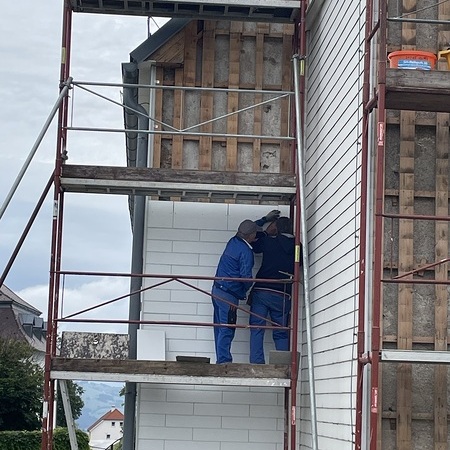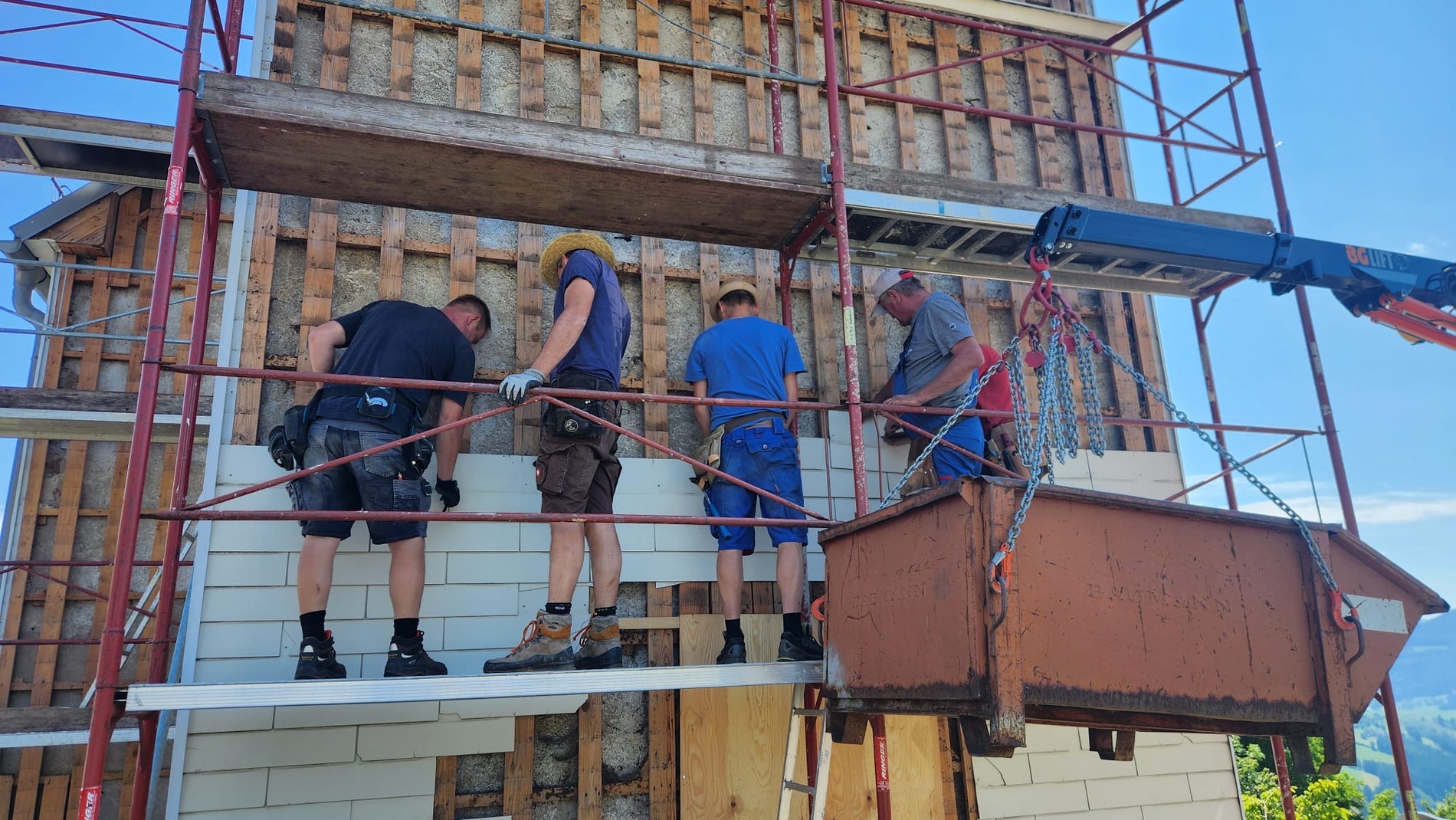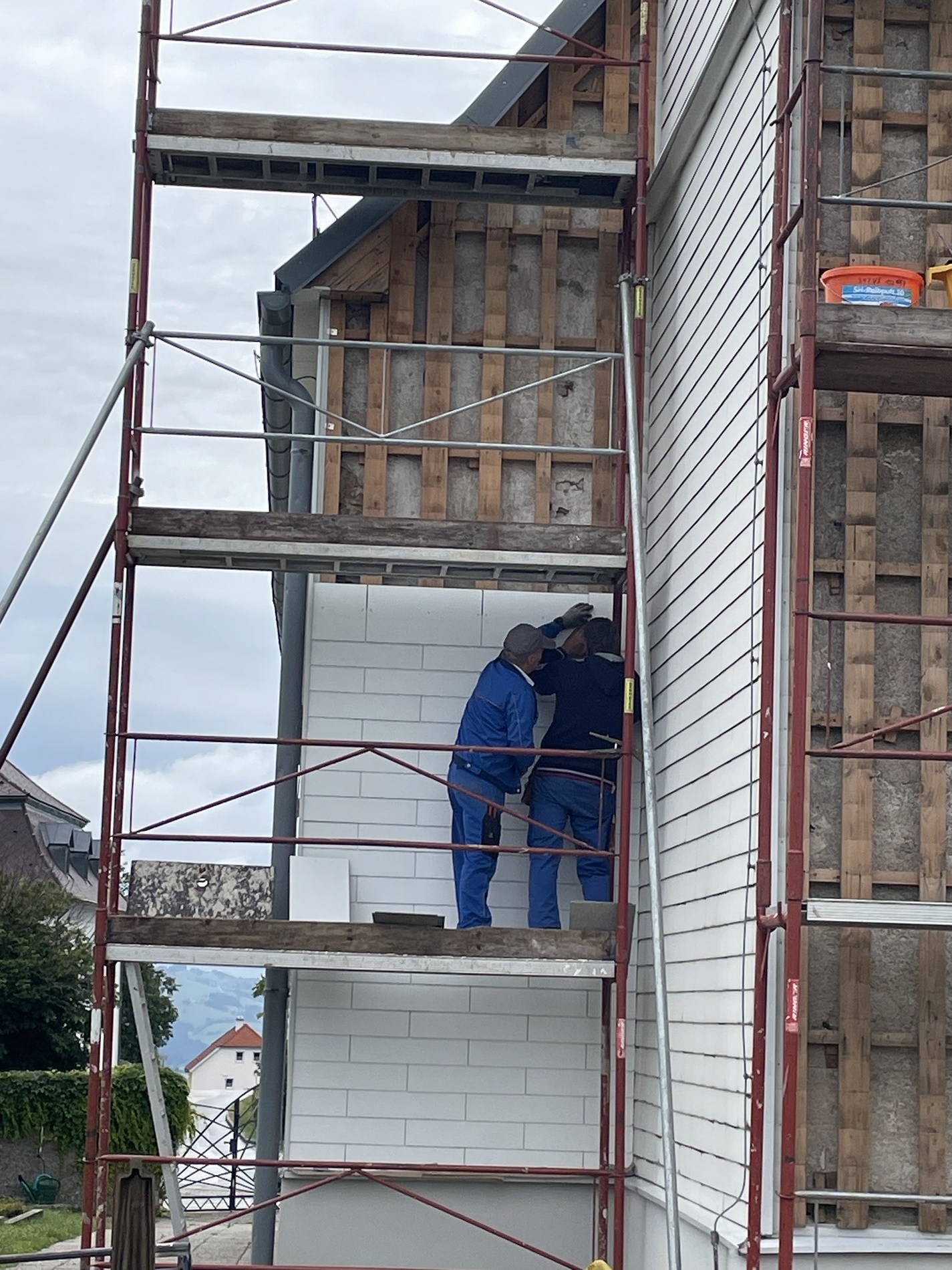 Am Freitag gab es dann die nicht so gute Nachricht, dass sich die Anlieferung der Eternitplatten um einige Tage verzögerte. Im Nachhinein betrachtet war die Verzögerung von Vorteil, da das Wetter zu Beginn der neuen Woche sehr verregnet war. Am Mittwoch und Donnerstag wurden die Spenglerarbeiten erledigt und am Donnerstag konnte dann auch mit dem Nageln der Eternitplatten begonnen werden. Freitag Nachmittags konnte das Gerüst bereits wieder entfernt werden.