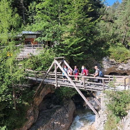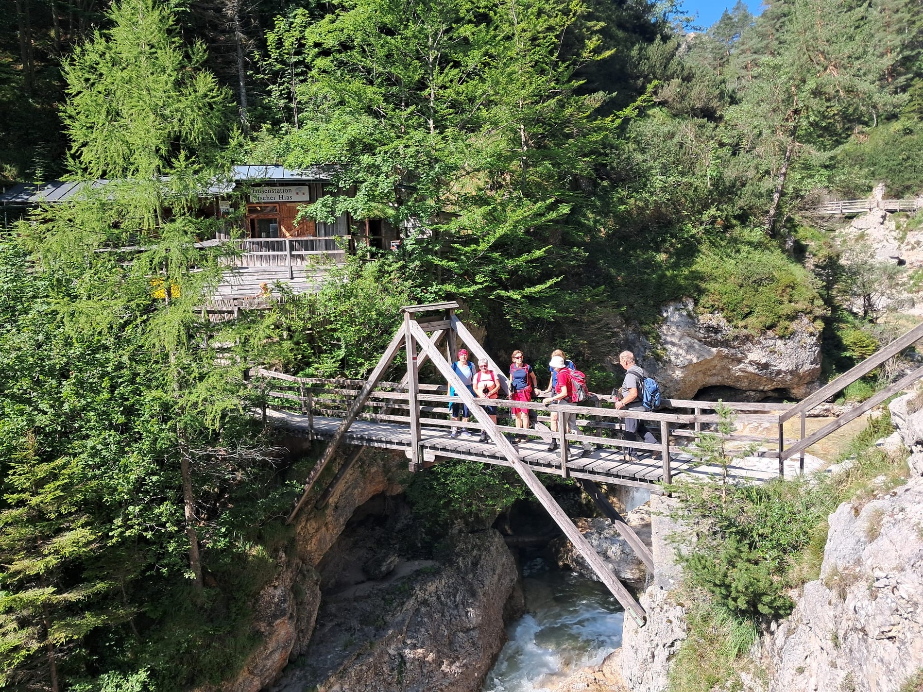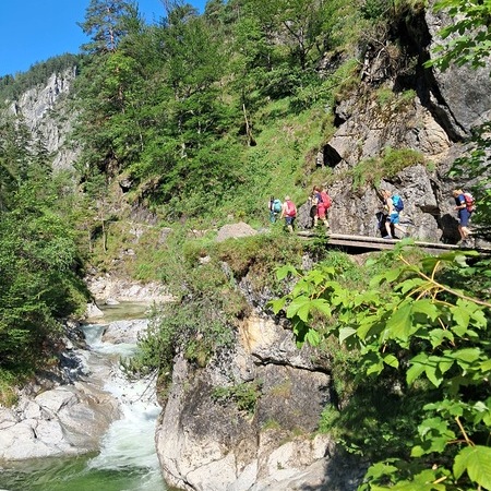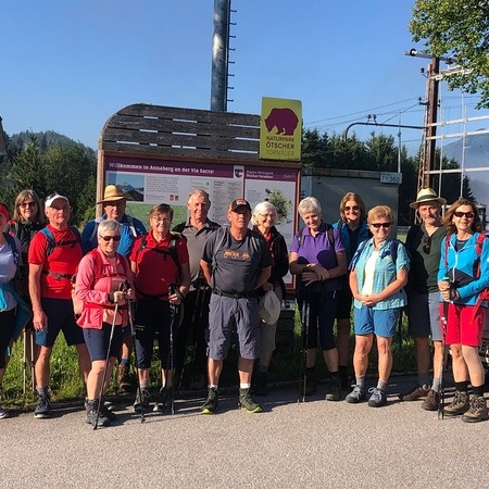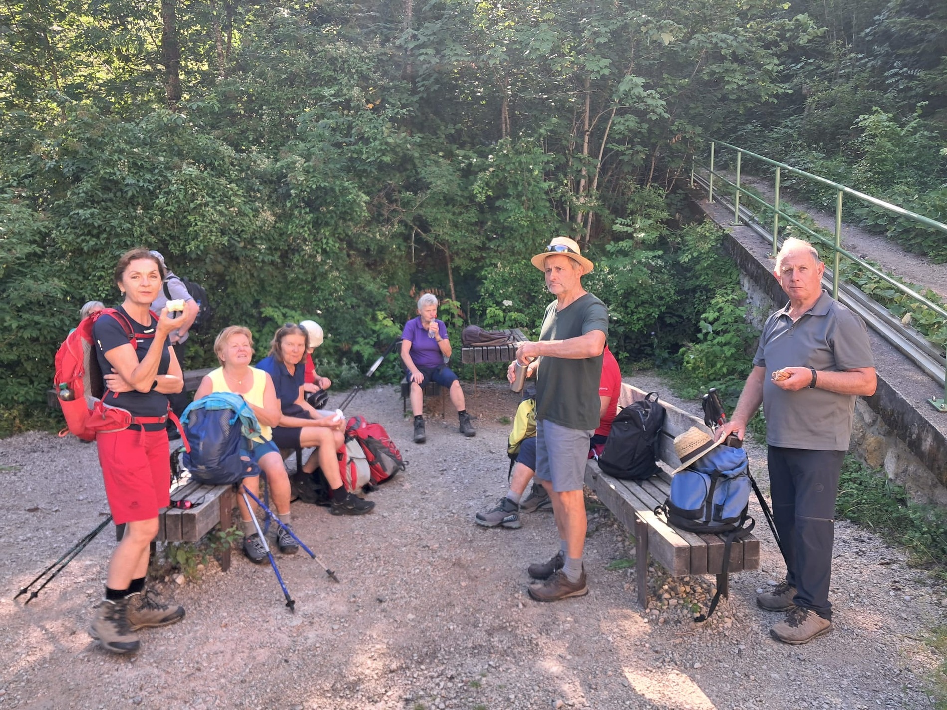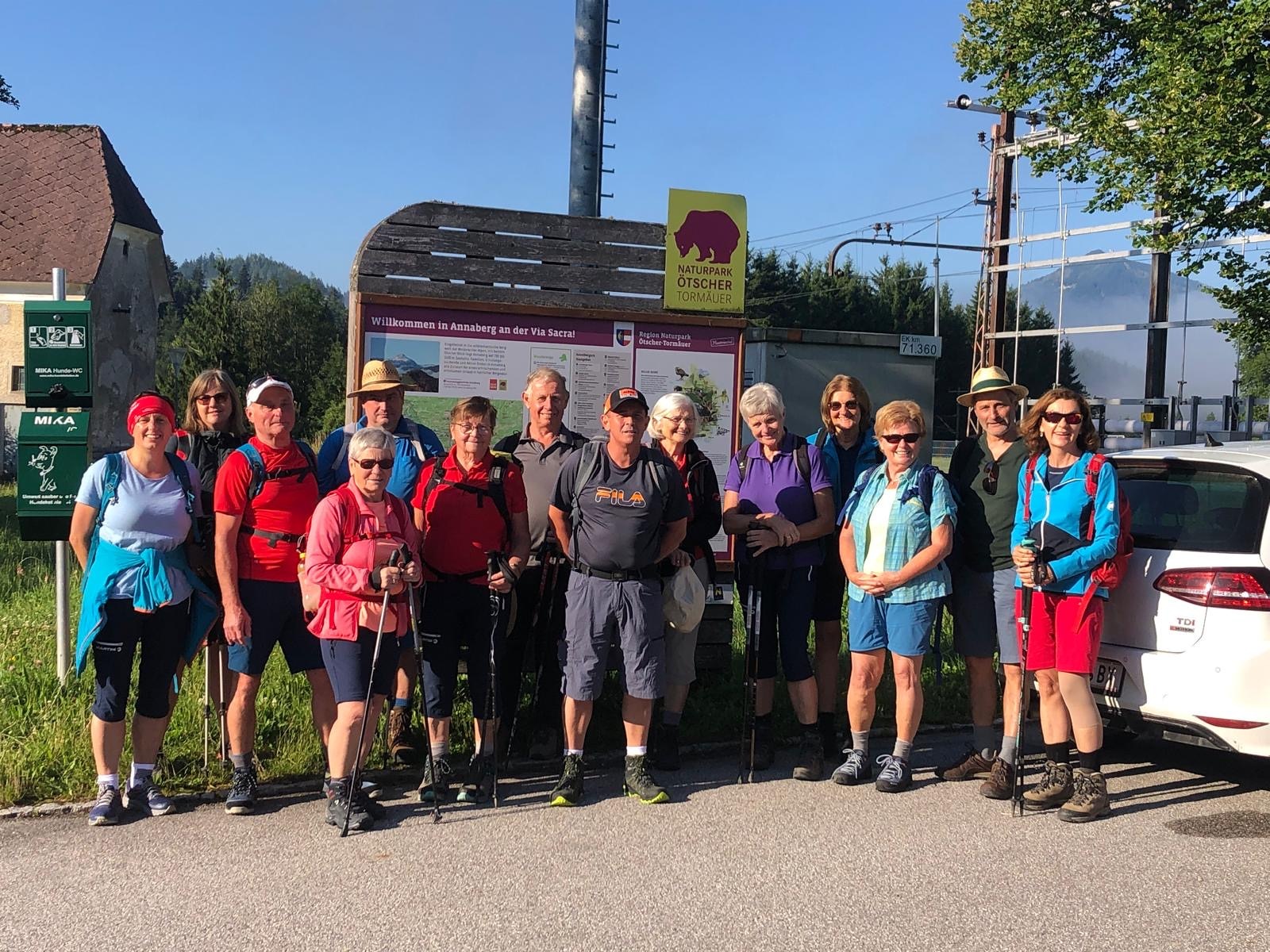 In aller Herrgottsfrühe trafen sich die Teilnehmer bei der Weger Kapelle und mit den Privatautos ging es zunächst nach Annaberg-Reith. Das Wetter hätte nicht besser sein können, den ganzen Tag Sonnenschein und angenehme Temperaturen. Natürlich trug auch die gewählte Route zur guten Stimmung bei. Die Ötschergräben zu durchwandern hat ja immer etwas Besonderes: tosendes Wasser, schroffe Felsen, dazu liebevoll angelegte schmale Wege mit vielen Stufen und Brücken - ein herrliches Naturschauspiel, bei dem keine Müdigkeit aufkommen kann. Die kurze Rast beim Ötscherhias gehörte natürlich auch dazu und verhalf zu neuer Energie für den folgenden Aufstieg zum Hagengut. Dort steht eine kleine Kapelle und in der Gruppe entstand das Bedürfnis, hier eine kurze Andacht abzuhalten. Schließlich war man ja unterwegs nach Mariazell, dem bekanntesten und beliebtesten Wallfahrtsort Österreichs - jeder mit seinen Gedanken und Anliegen.
