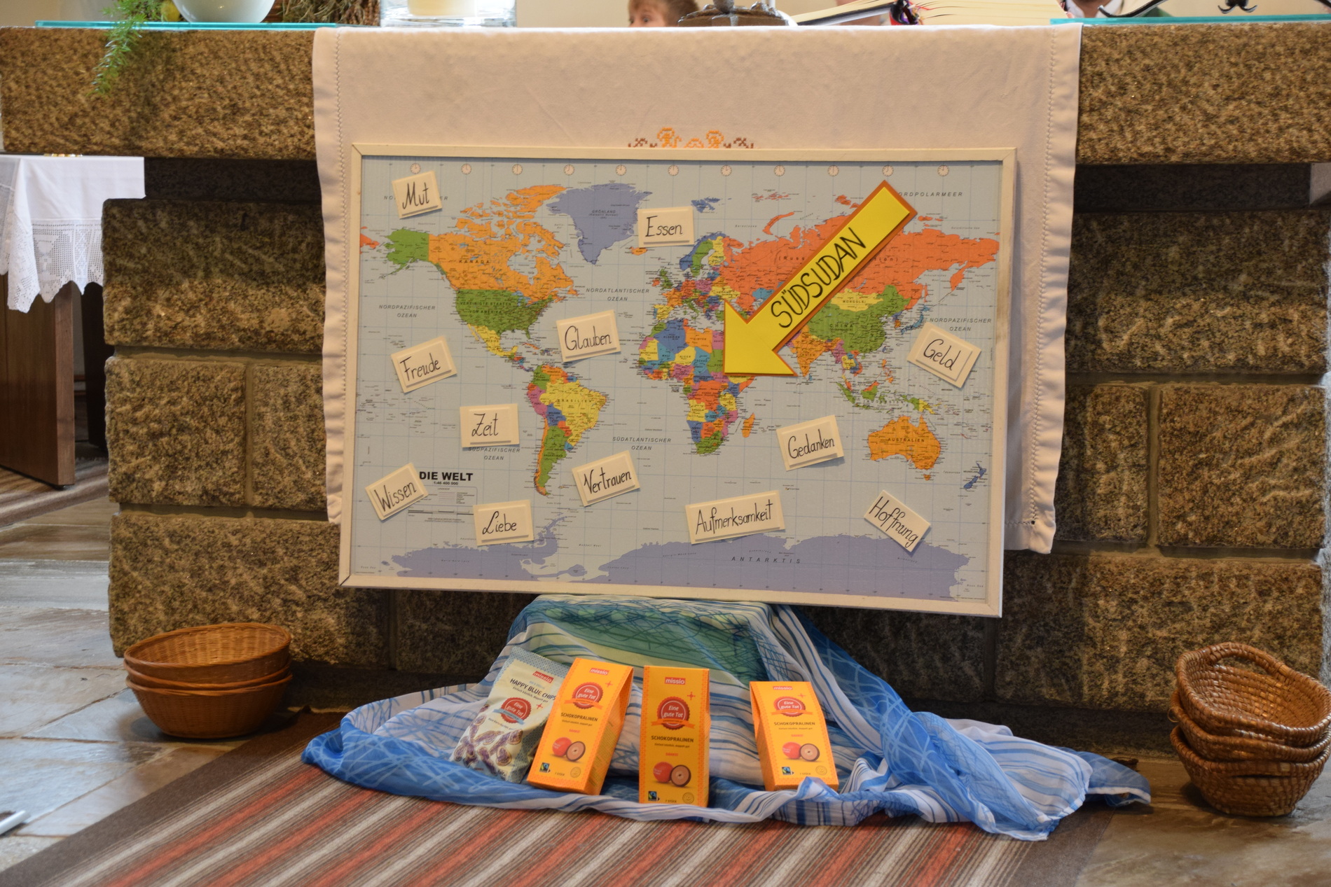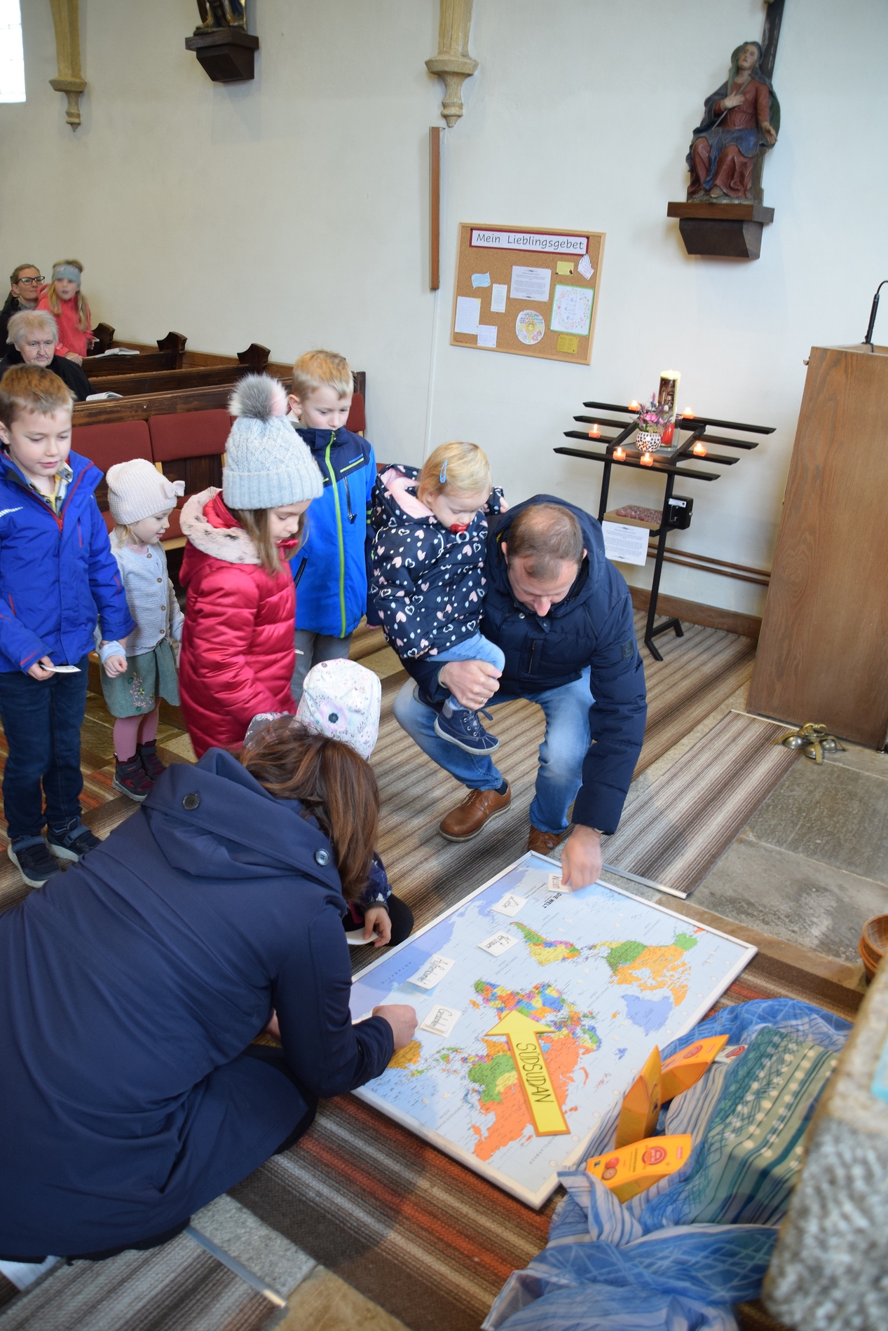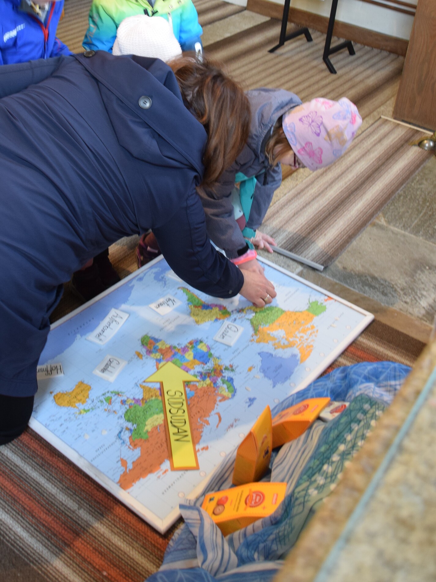 Franziska Bleiner (Familienmessteam) stellte das Land vor und die Kinder durften dann nach vorne kommen und Zetteln mit Gedanken auf die Weltkarte kleben - Gedanken, die man teilen oder weitergeben kann - Liebe, Freude, Essen, Geld, Gedanken, Aufmerksamkeit, Wissen, Zeit, Hoffnung, Glaube.