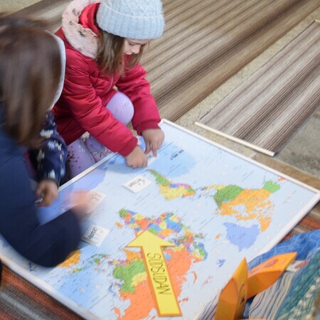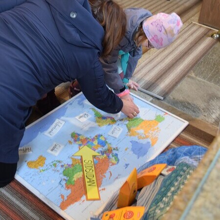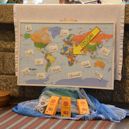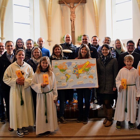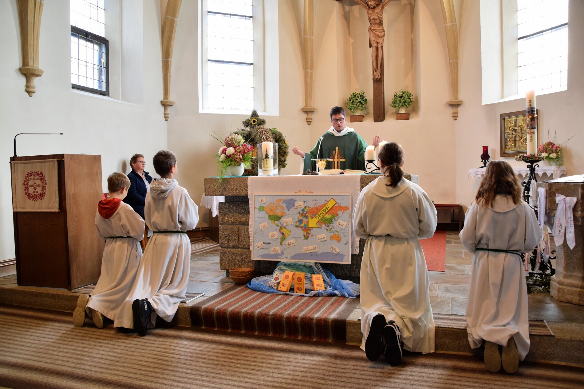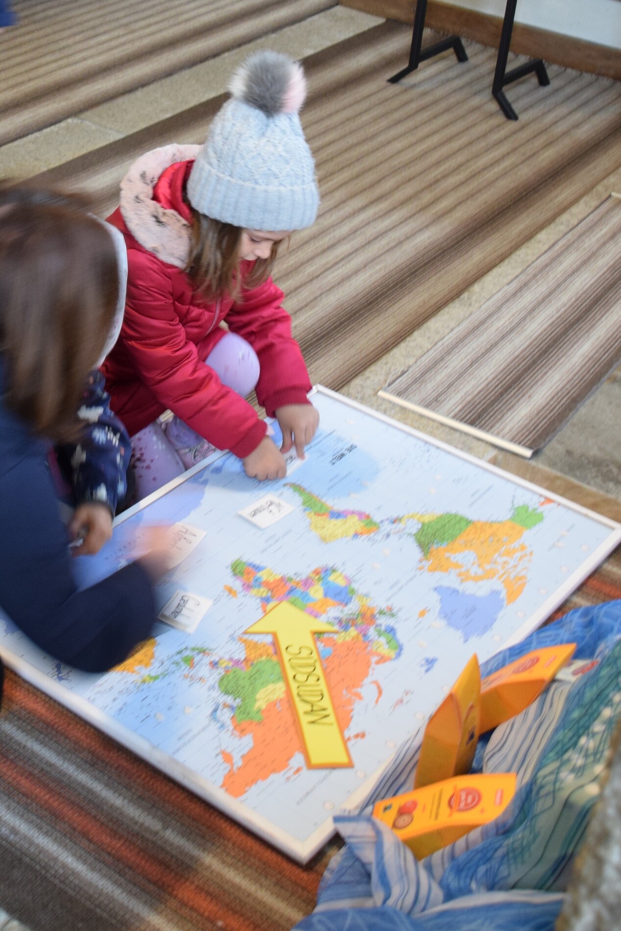 Franziska Bleiner (Familienmessteam) stellte das Land vor und die Kinder durften dann nach vorne kommen und Zetteln mit Gedanken auf die Weltkarte kleben - Gedanken, die man teilen oder weitergeben kann - Liebe, Freude, Essen, Geld, Gedanken, Aufmerksamkeit, Wissen, Zeit, Hoffnung, Glaube.