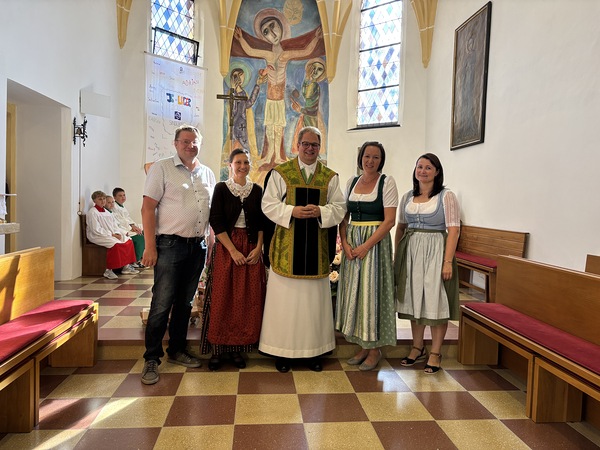 Anlässlich des 40. Geburtstags von Vikar P. Benedikt Resch feierte die Pfarrgemeinde St. Johann in Engstetten am Sonntag, den 31. August 2025, eine Festmesse. Im Anschluss gratulierte der Pfarrgemeinderatsvorstand in dreigliedriger Form- angelehnt an die stets in drei Punkten gegliederten Predigten von Pater Benedikt. Ein Gemeinschaftsgeschenk der Johannser:innen mit persönlichen Glückwünschen aus den verschiedensten Häusern bereitete dem Jubilar große Freude. Im Anschluss gratulierten Bürgermeister Johannes Heuras, Feuerwehr, Kirchenchor, Dorfmusik und zahlreiche Gäste während der Agape im Pfarrhof. In bayrischer Feierkultur und mit musikalischer Darbietung klang der Vormittag mit Bier und Brezen aus.