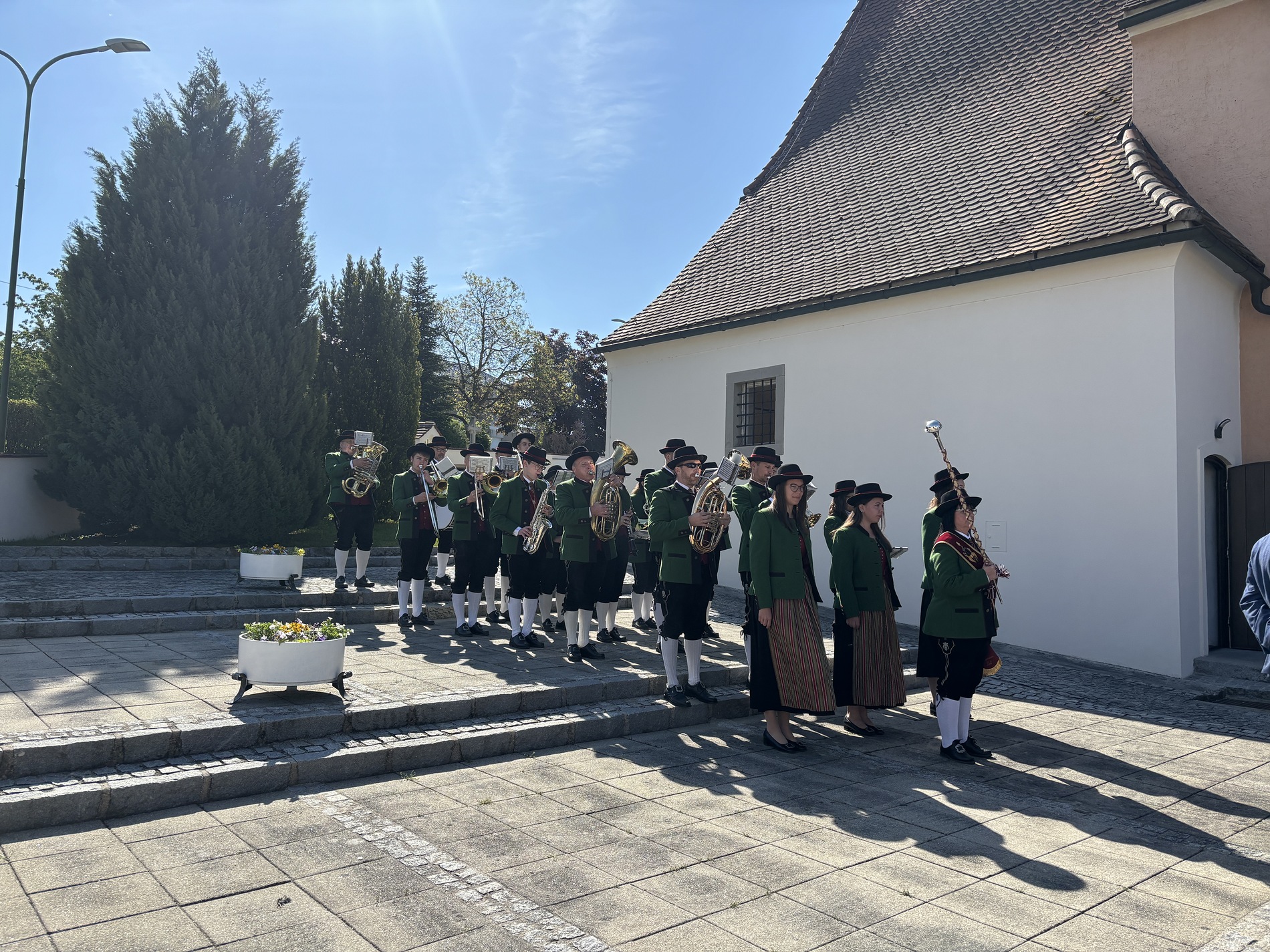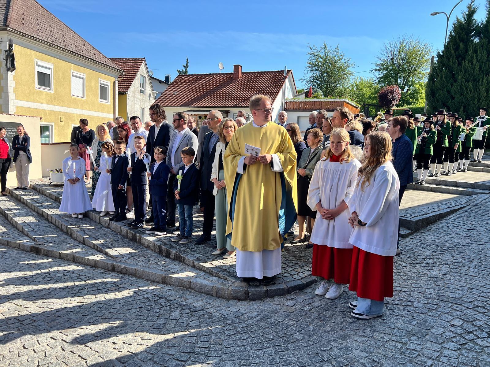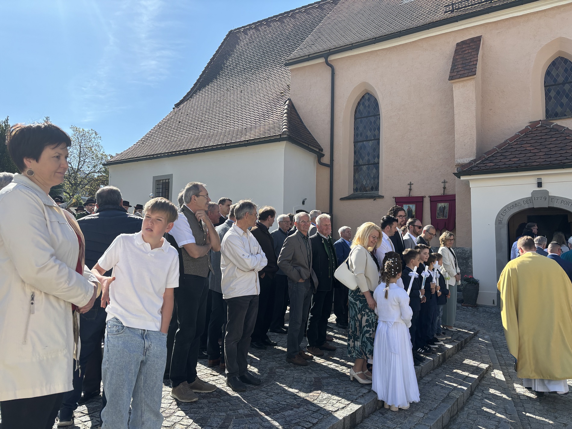 Nach dem Gottesdienst wurden die Erstkommunionkinder im Pfarrhof mit Zuckerkipferl und Kakao bewirtet. Währenddessen verbrachten die Familien draußen eine sonnige Zeit bei kühlen Getränken.