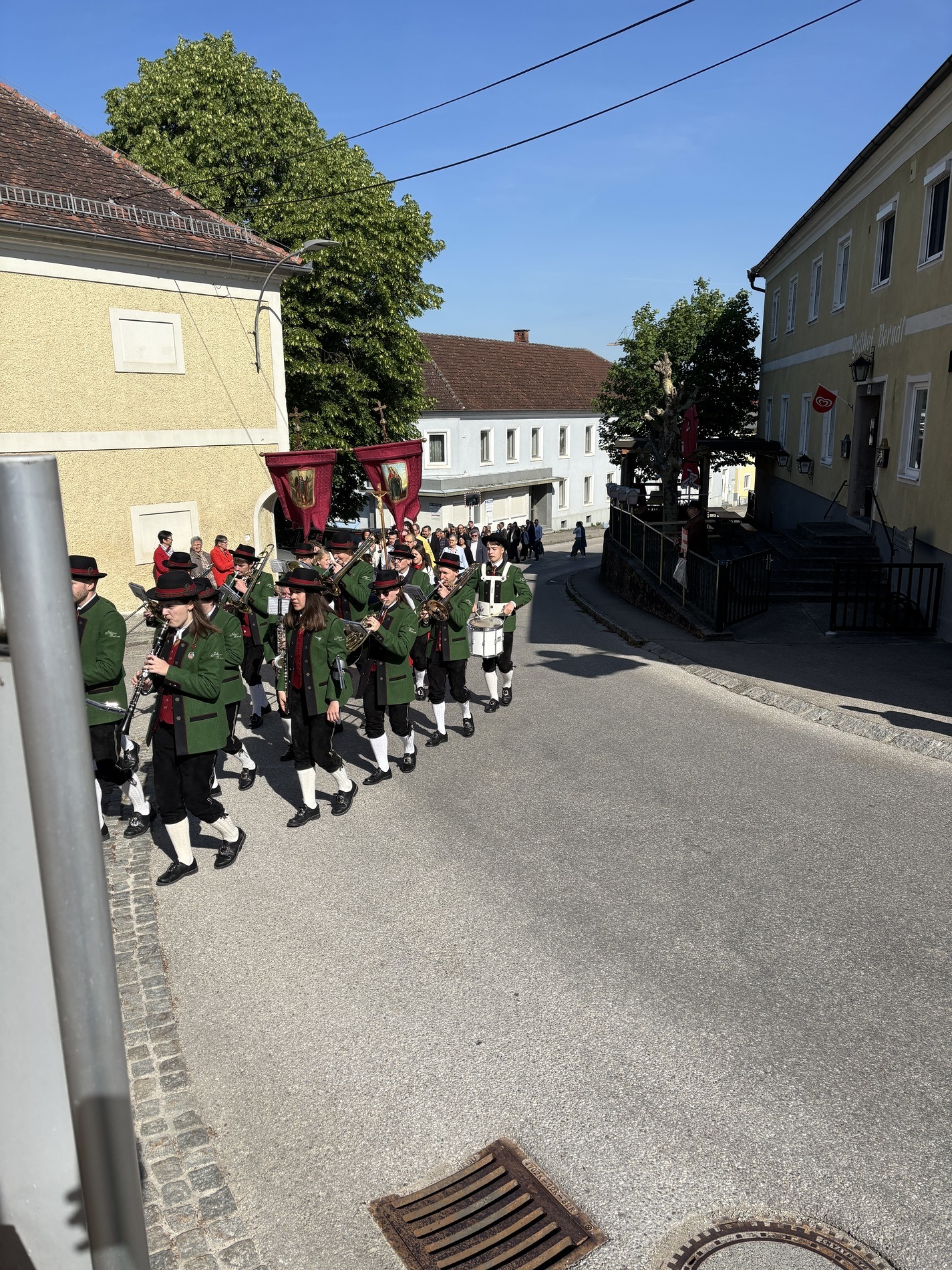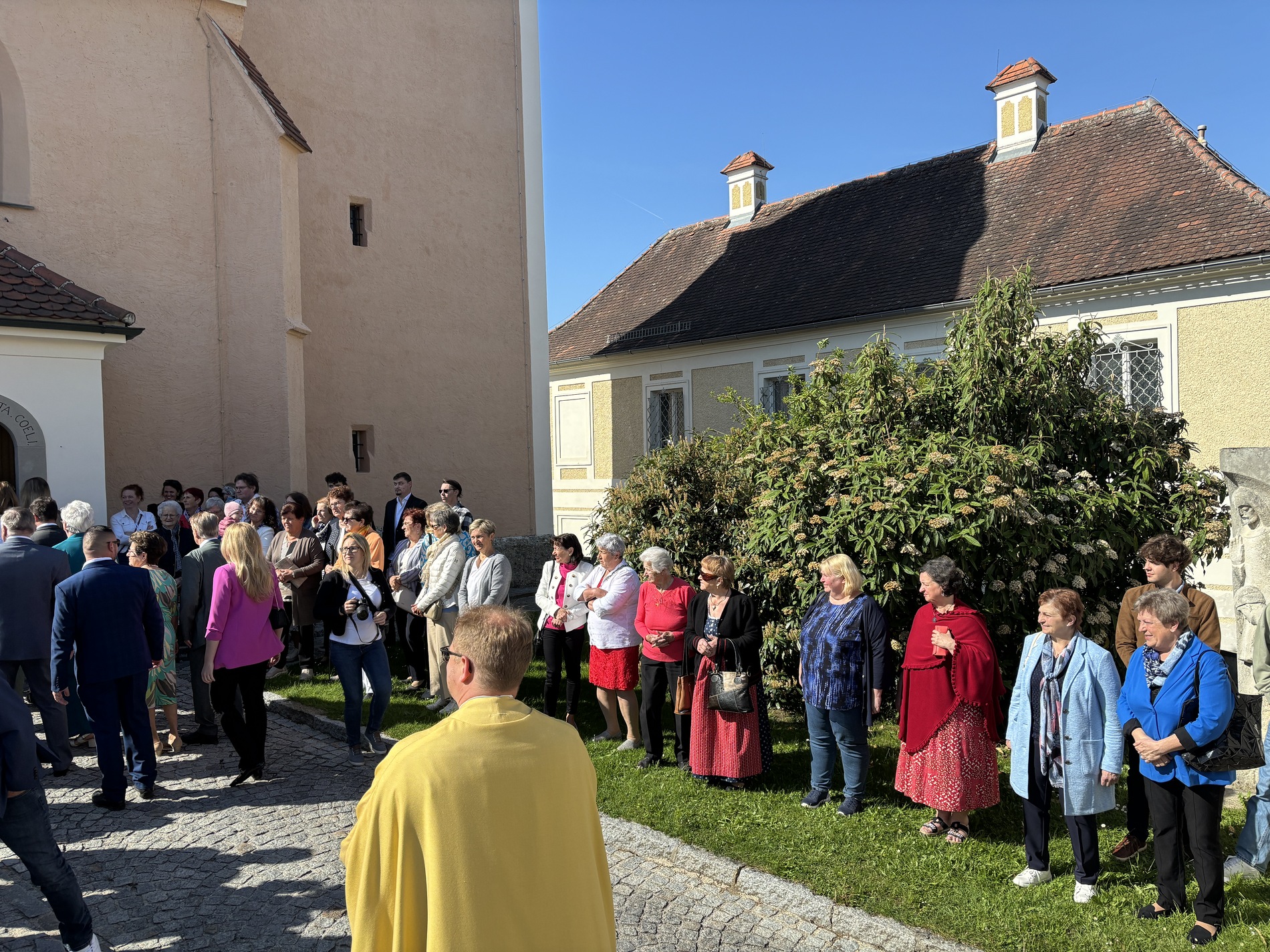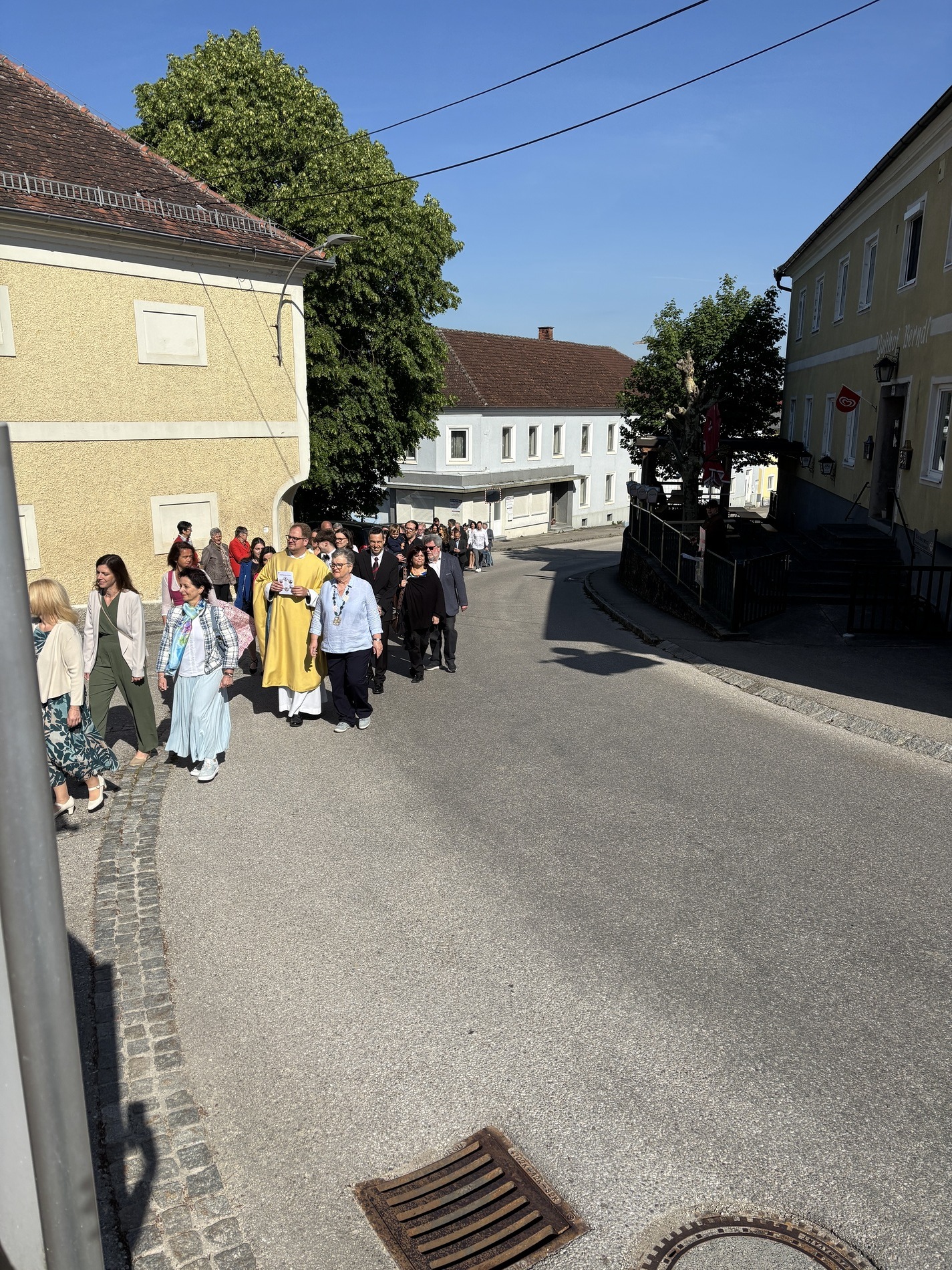 Nach dem Gottesdienst wurden die Erstkommunionkinder im Pfarrhof mit Zuckerkipferl und Kakao bewirtet. Währenddessen verbrachten die Familien draußen eine sonnige Zeit bei kühlen Getränken.
