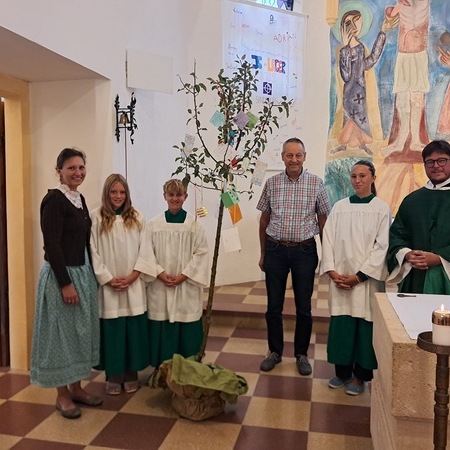 Am Sonntag, den 17. August 2025 durften sich Pater Florian Ehebruster, Marie-Isabelle Punzhuber (PGR) und die Ministranten im Anschluss der Heiligen Messe bei Ing. Johann Lahmer für seine langjährige Begleitung der Ministranten bedanken. Auf eigenen Wunsch legte Hans Lahmer diese pfarrliche Arbeit zurück. Ein Apfelbäumchen mit guten Wünschen wurde von den Minis als Dankeschön überreicht und möge reiche Ernte bringen.