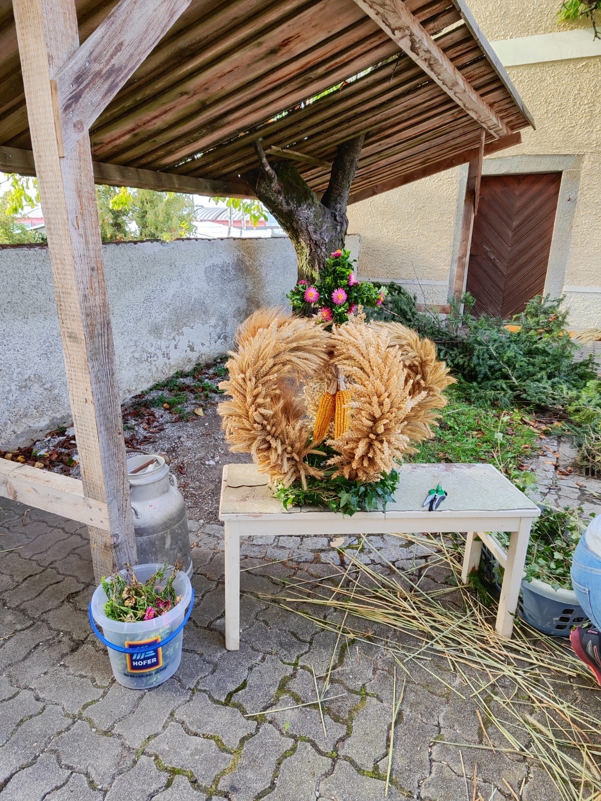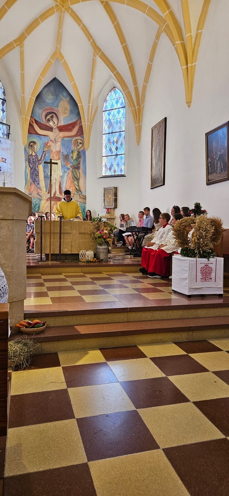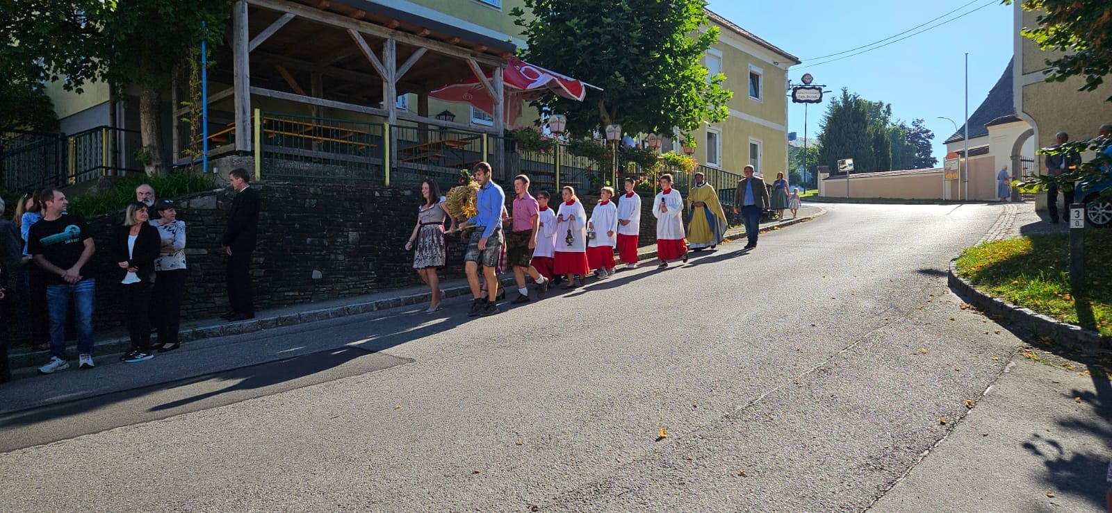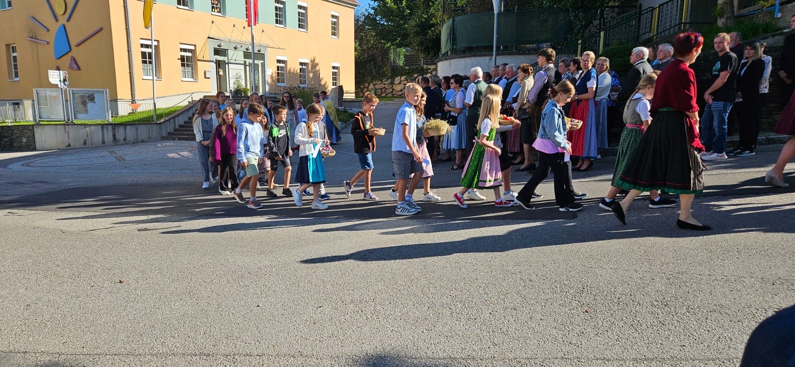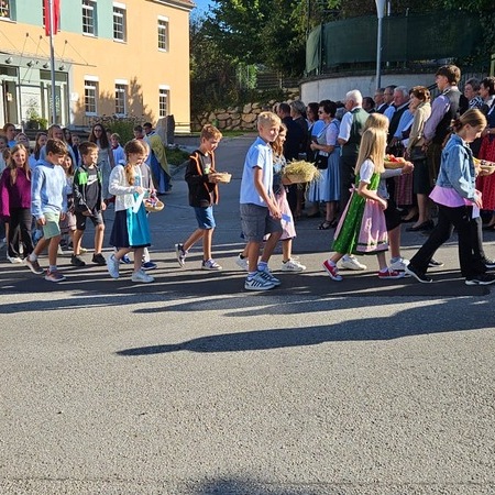 Pater Florian segnete die Gaben und die von den Bäuerinnen kunstvoll gebundene Erntedankkrone am Dorfplatz, bevor gemeinsam in die festlich geschmückte Kirche eingezogen wurde. Der rythmisch gestaltete Erntedankgottesdienst und Pater Florians Predigt luden zum Mitfeiern und persönlicher Reflektion ein.