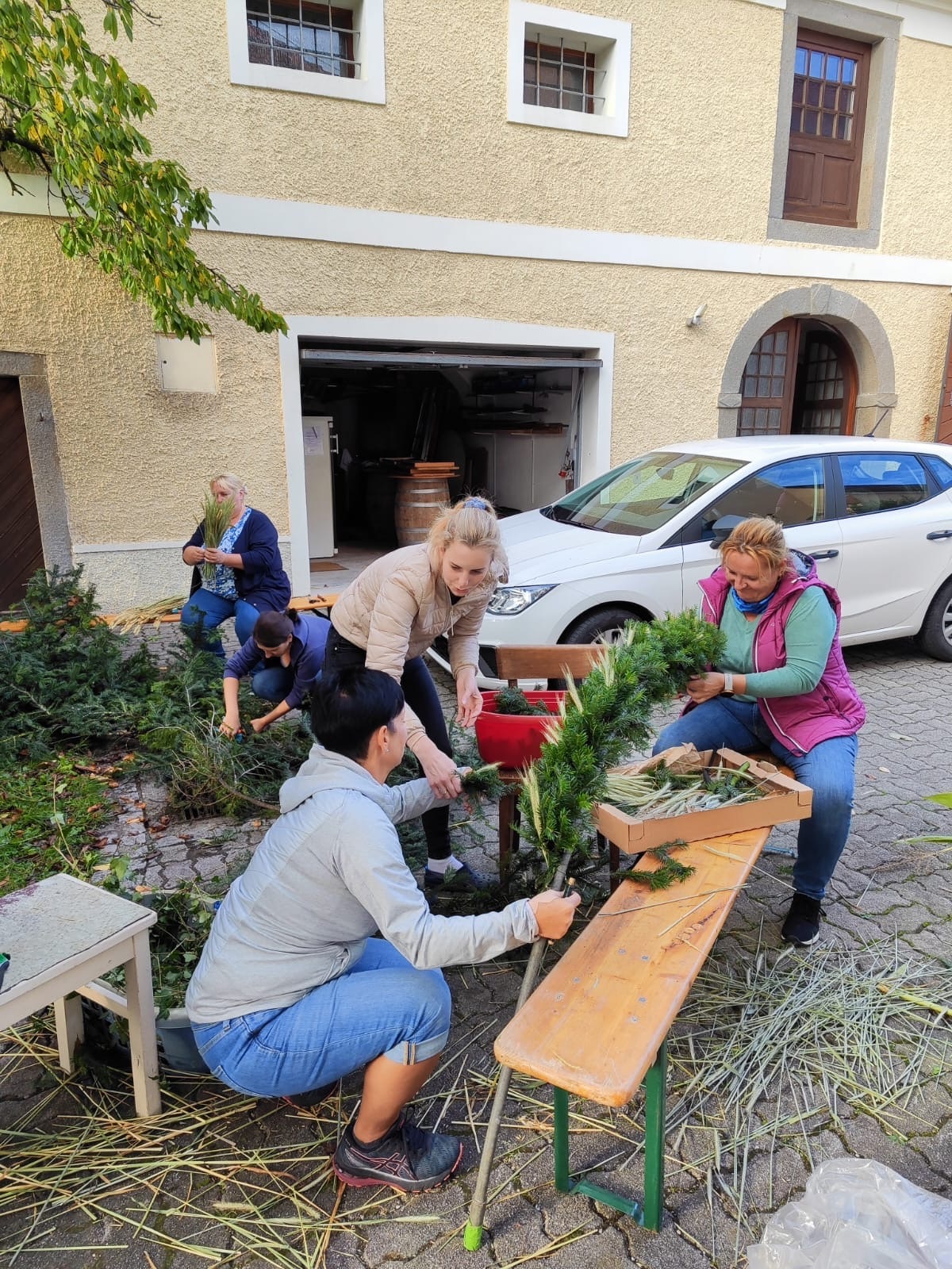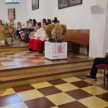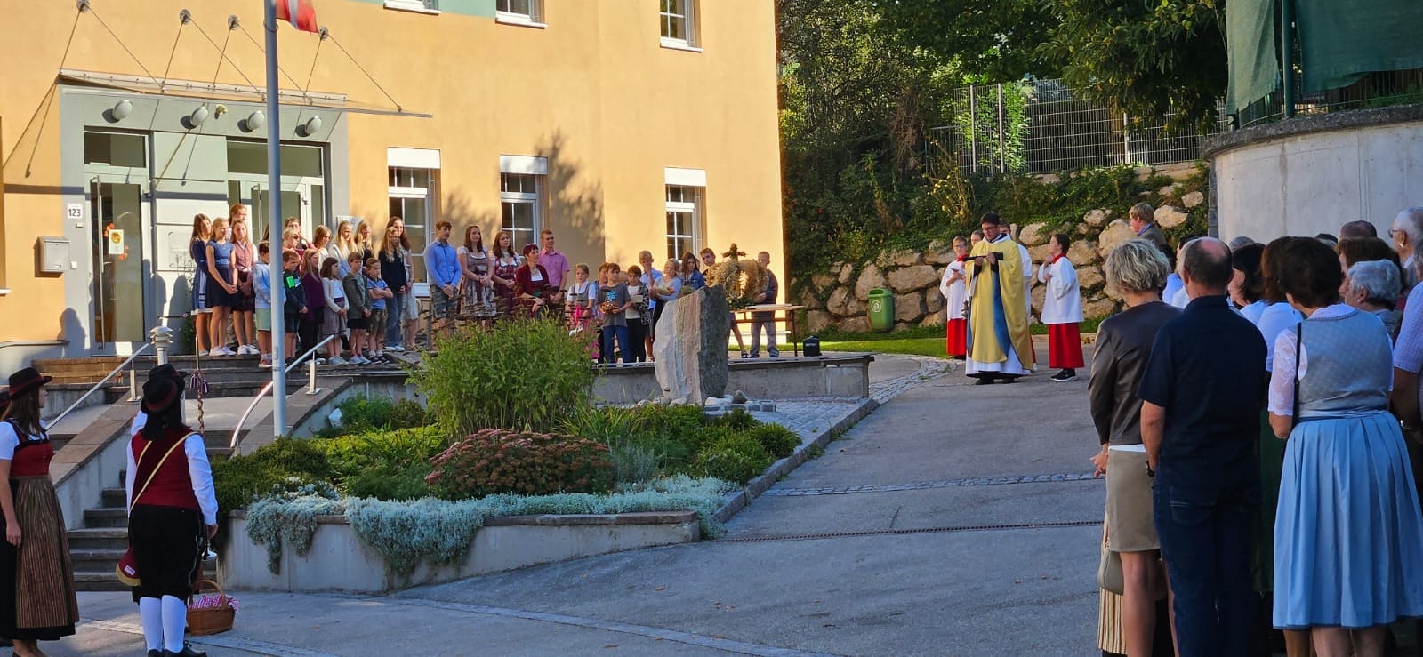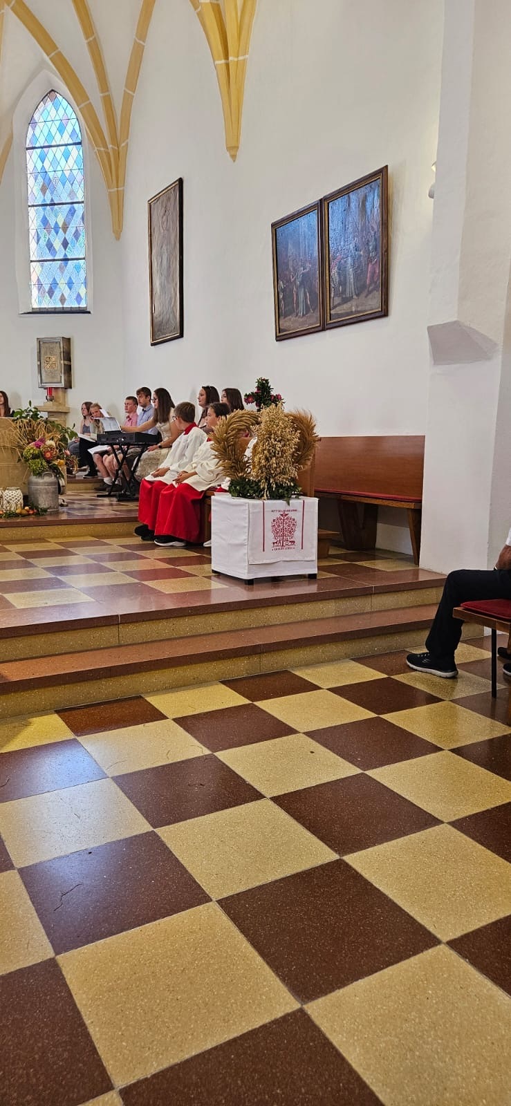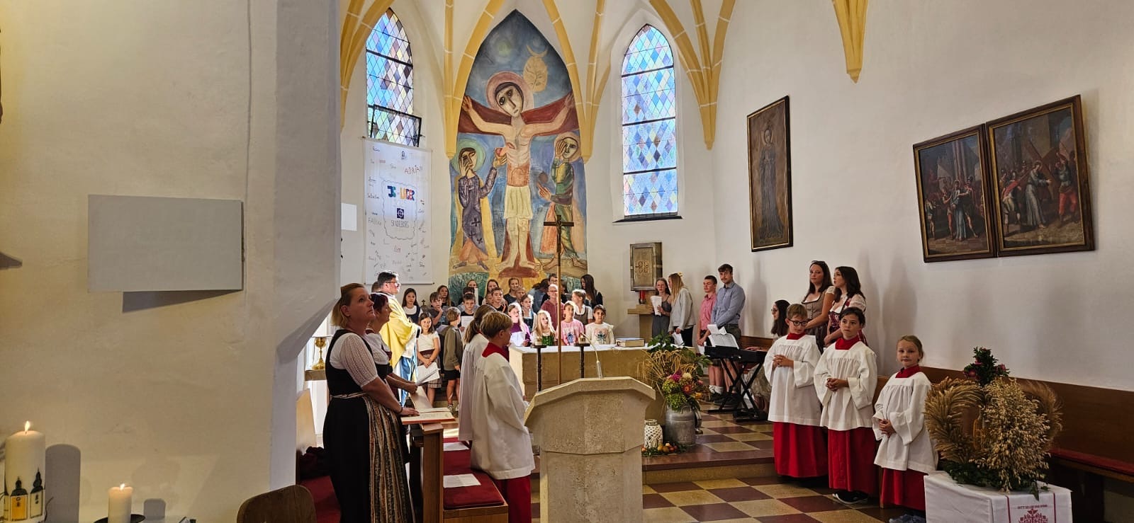 Pater Florian segnete die Gaben und die von den Bäuerinnen kunstvoll gebundene Erntedankkrone am Dorfplatz, bevor gemeinsam in die festlich geschmückte Kirche eingezogen wurde. Der rythmisch gestaltete Erntedankgottesdienst und Pater Florians Predigt luden zum Mitfeiern und persönlicher Reflektion ein.