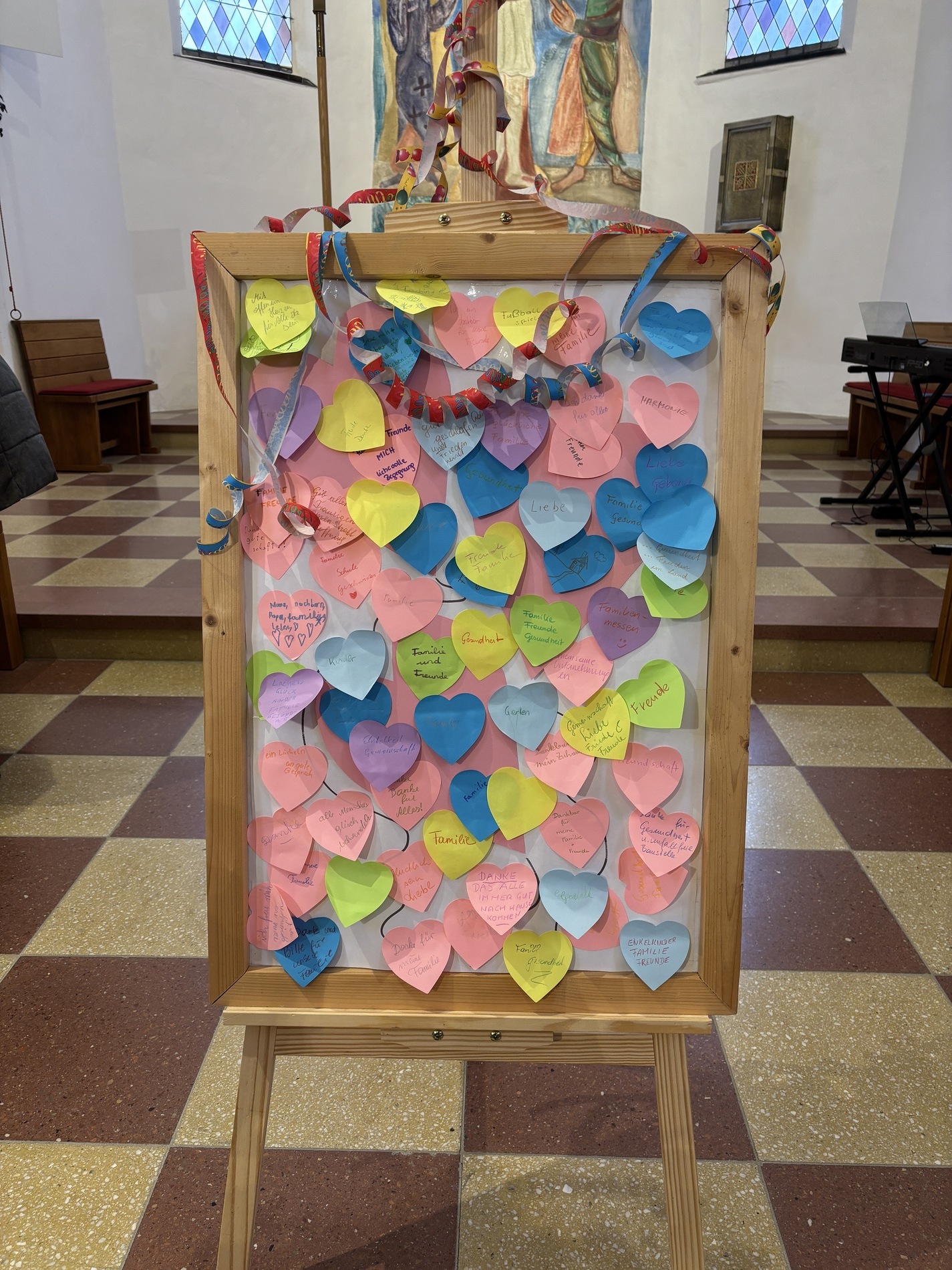 Ein besonderer Höhepunkt war das Rollenspiel zum Thema „Gott ist da – in traurigen und fröhlichen Tagen“. Die Kinder stellten eine eindrucksvolle Szene aus dem Alltag dar: Momente der Freude und des Lachens, aber auch Situation der Einsamkeit. In allem wurde deutlich: Gott geht mit, er lässt uns nicht allein. Auf Post-it-Herzen konnten die Gottesdienstbesucher ihre Freude und Dankbarkeit ausdrucken. Die Kinder sammelten diese Botschaften ein und klebten sie auf ein Plakat.