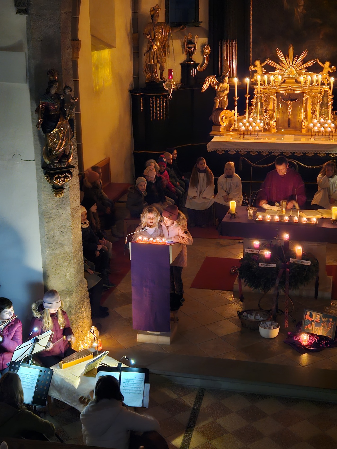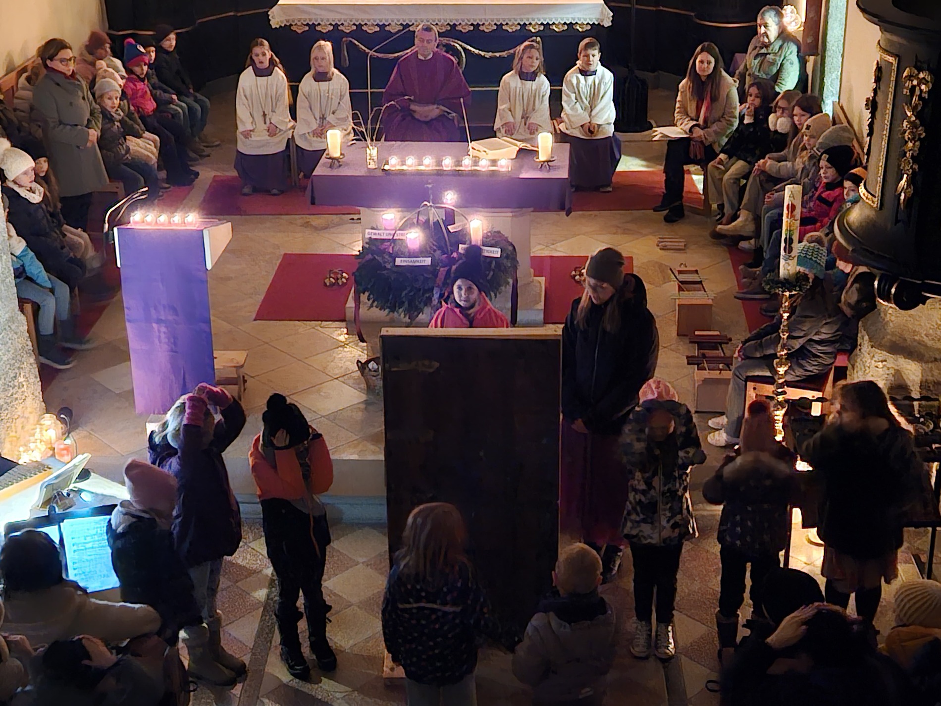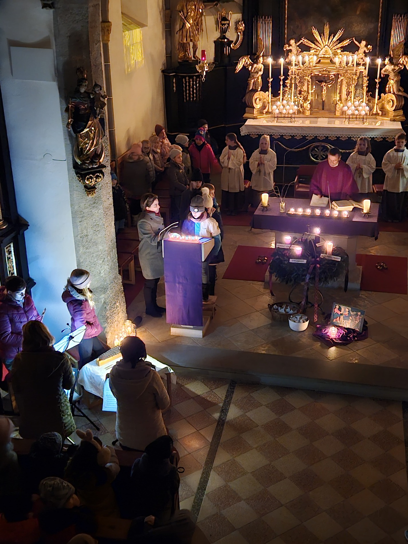 ... so sangen und musizierten die Kinder der Volksschule bei ihrem vorweihnachtlichen Gottesdienst am frühen Morgen, den P. Laurentius mit der Schulgemeinschaft feierte.