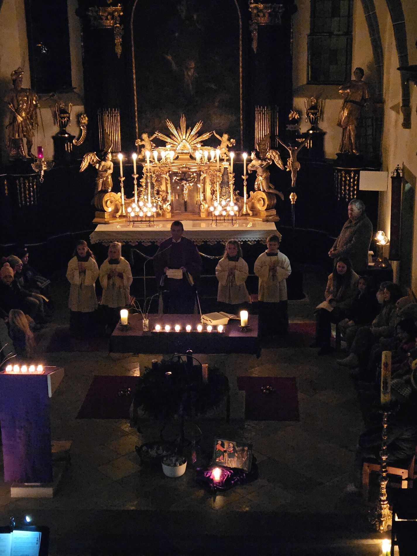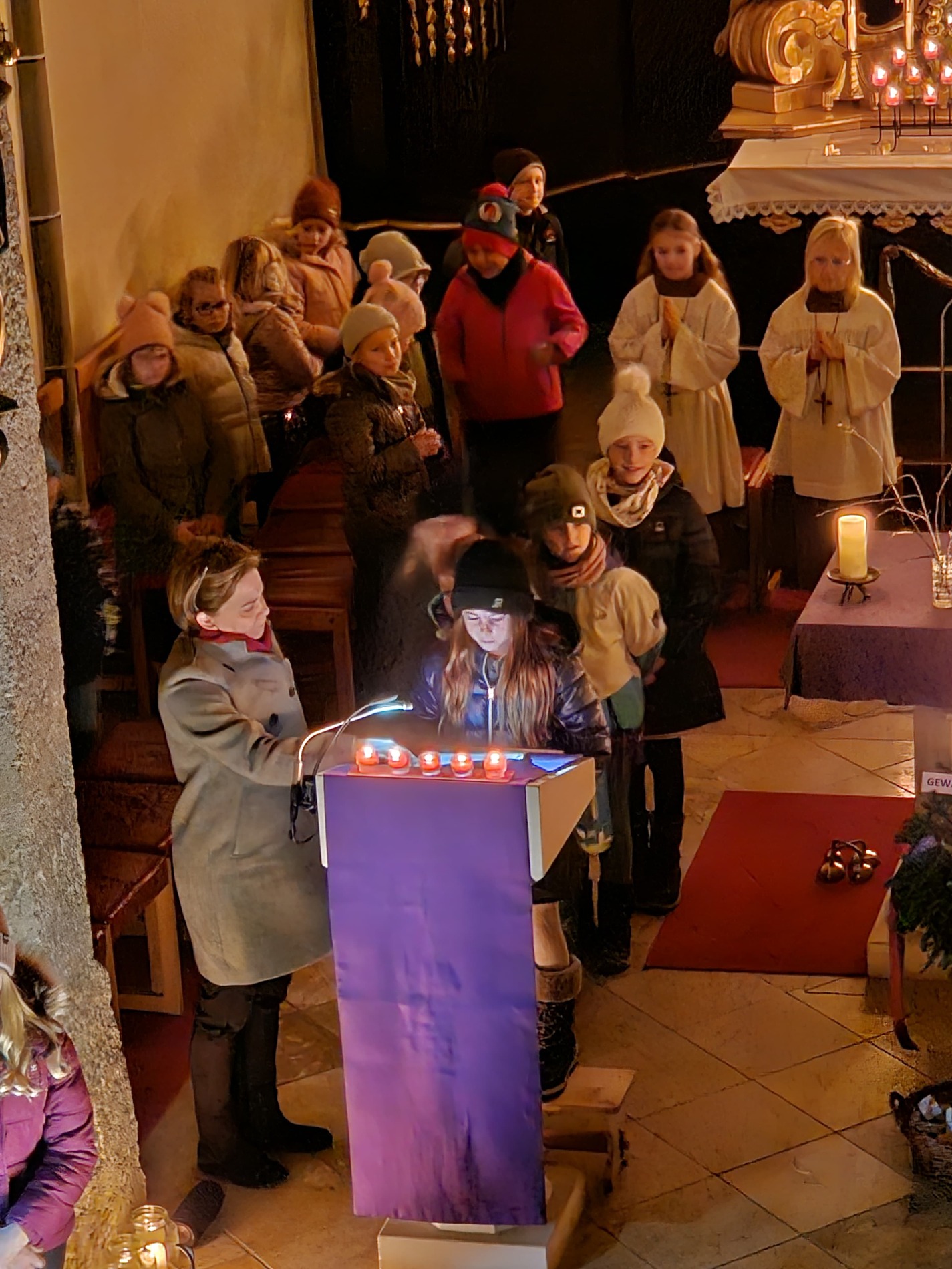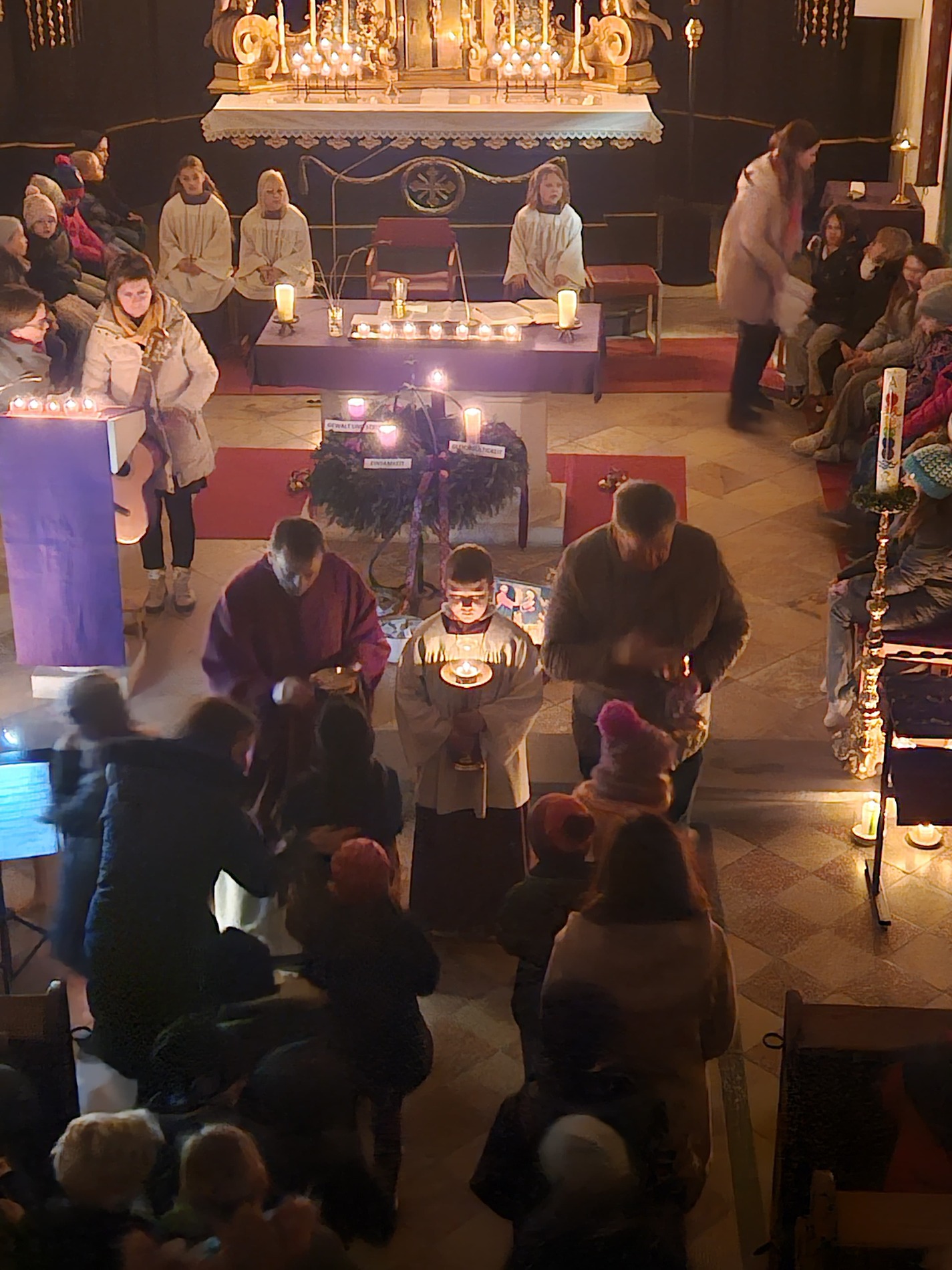 ... so sangen und musizierten die Kinder der Volksschule bei ihrem vorweihnachtlichen Gottesdienst am frühen Morgen, den P. Laurentius mit der Schulgemeinschaft feierte.