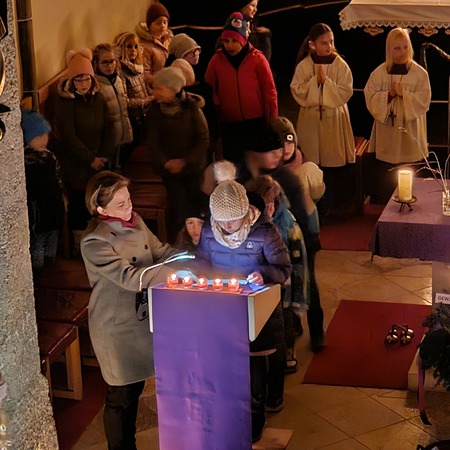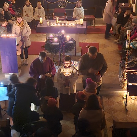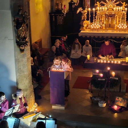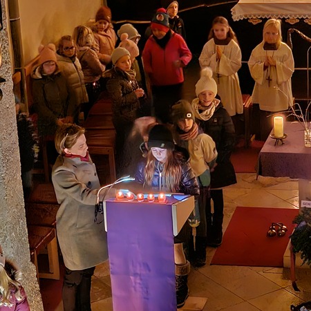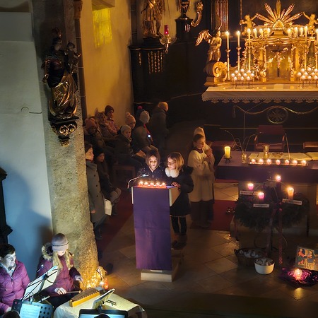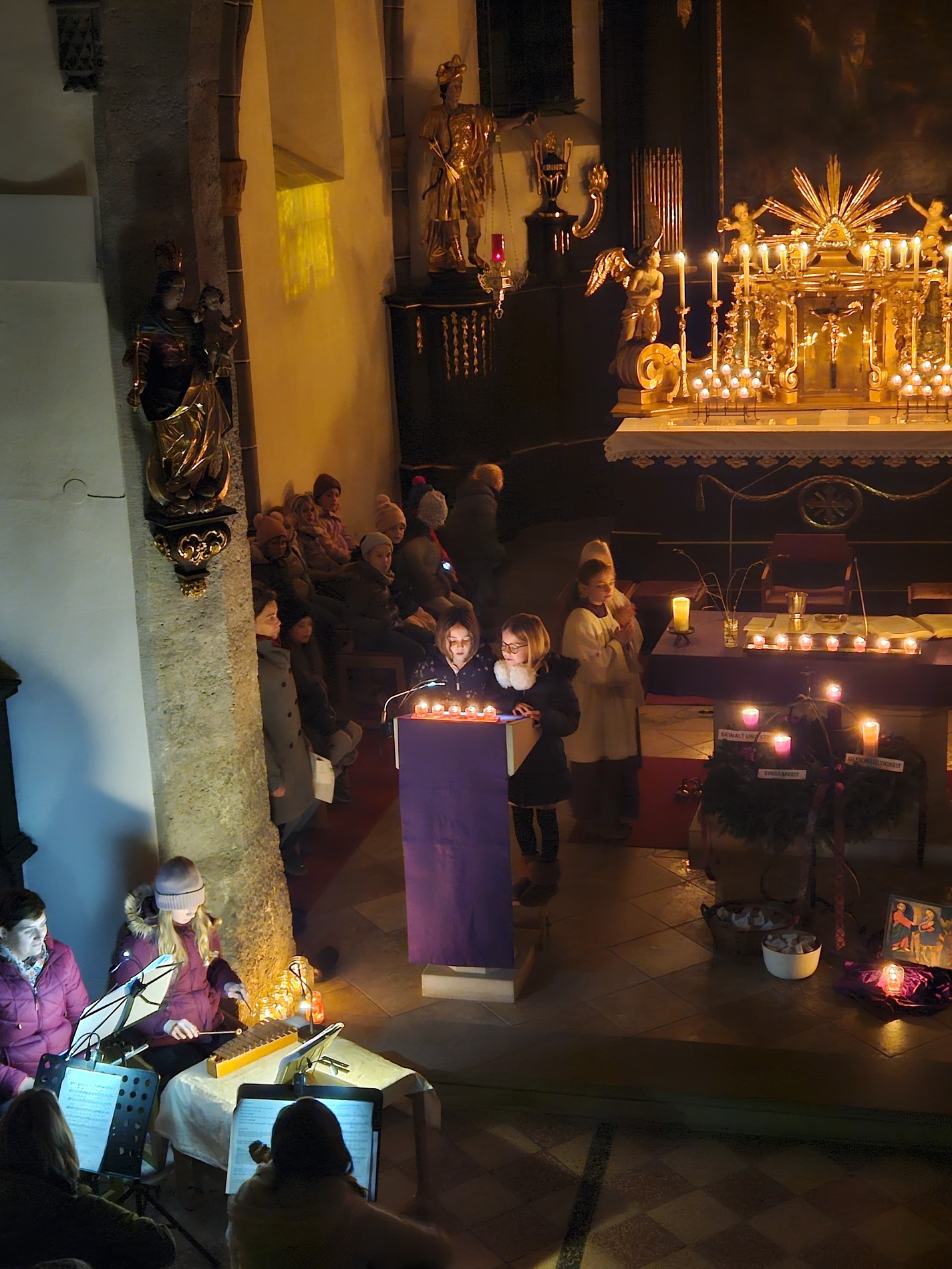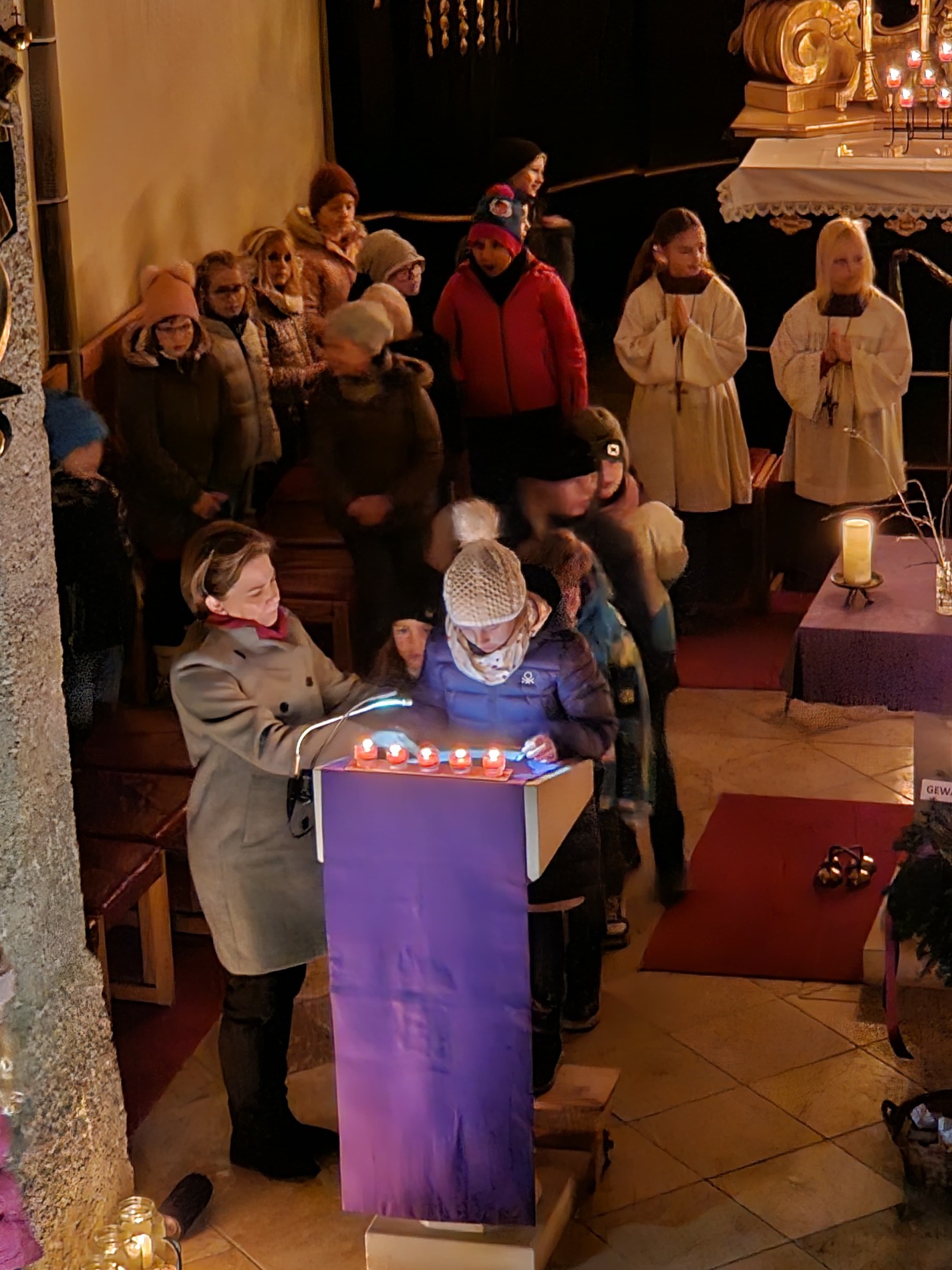 Mit Lichtern zogen die SchülerInnen der 4. Klasse in die dunkle Kirche ein und baten dabei mit dem afrikanischen Lied "Hambani kahle" um Frieden.