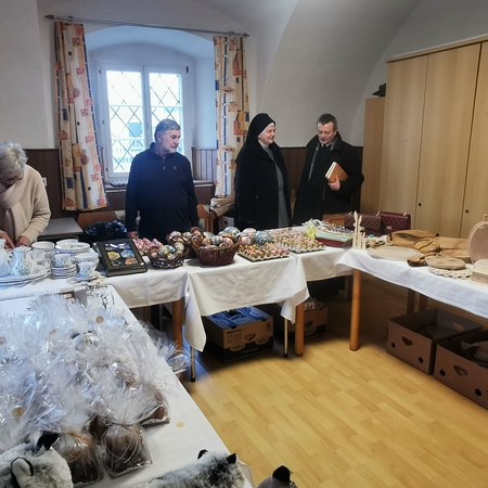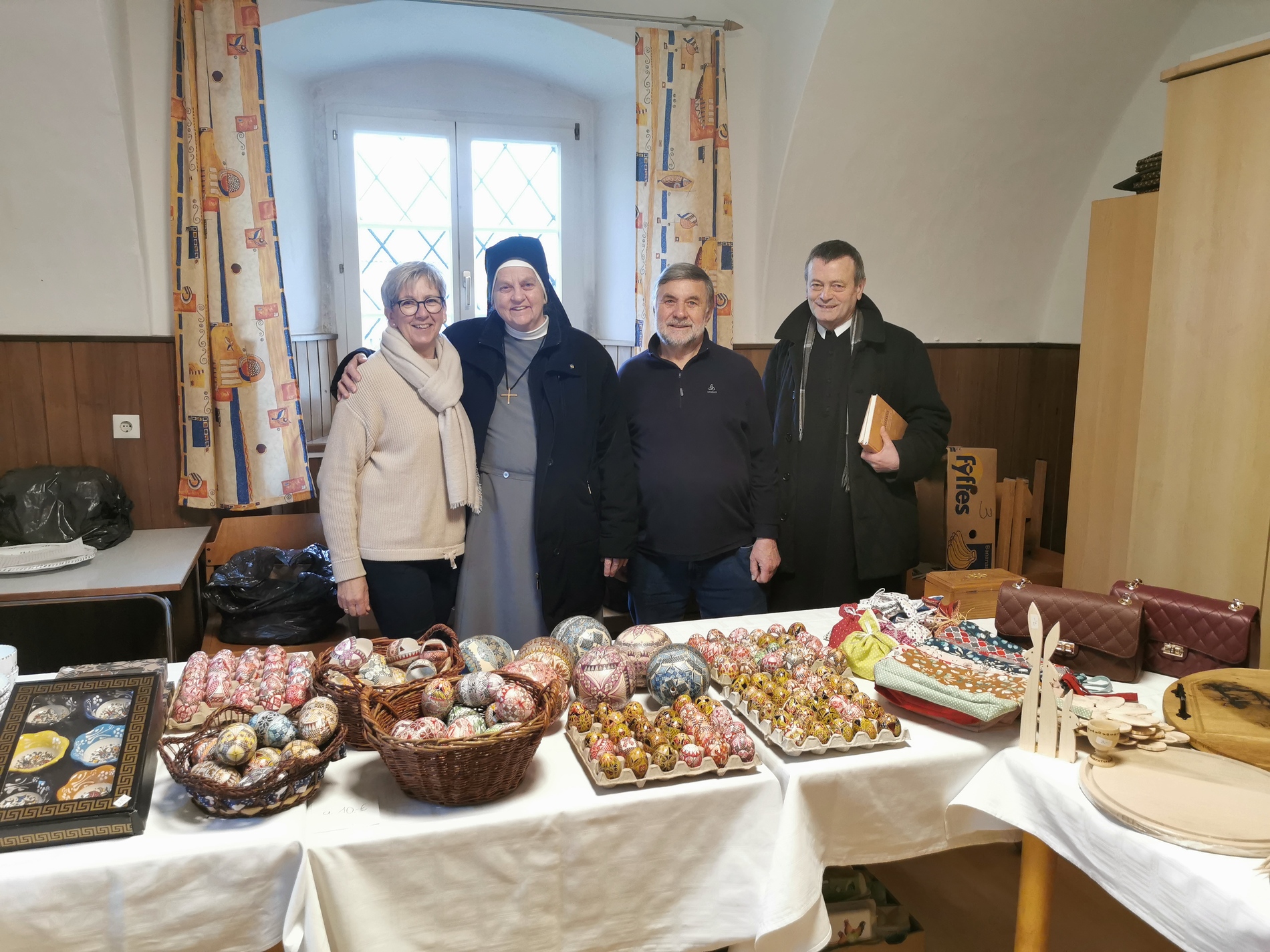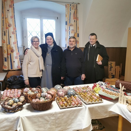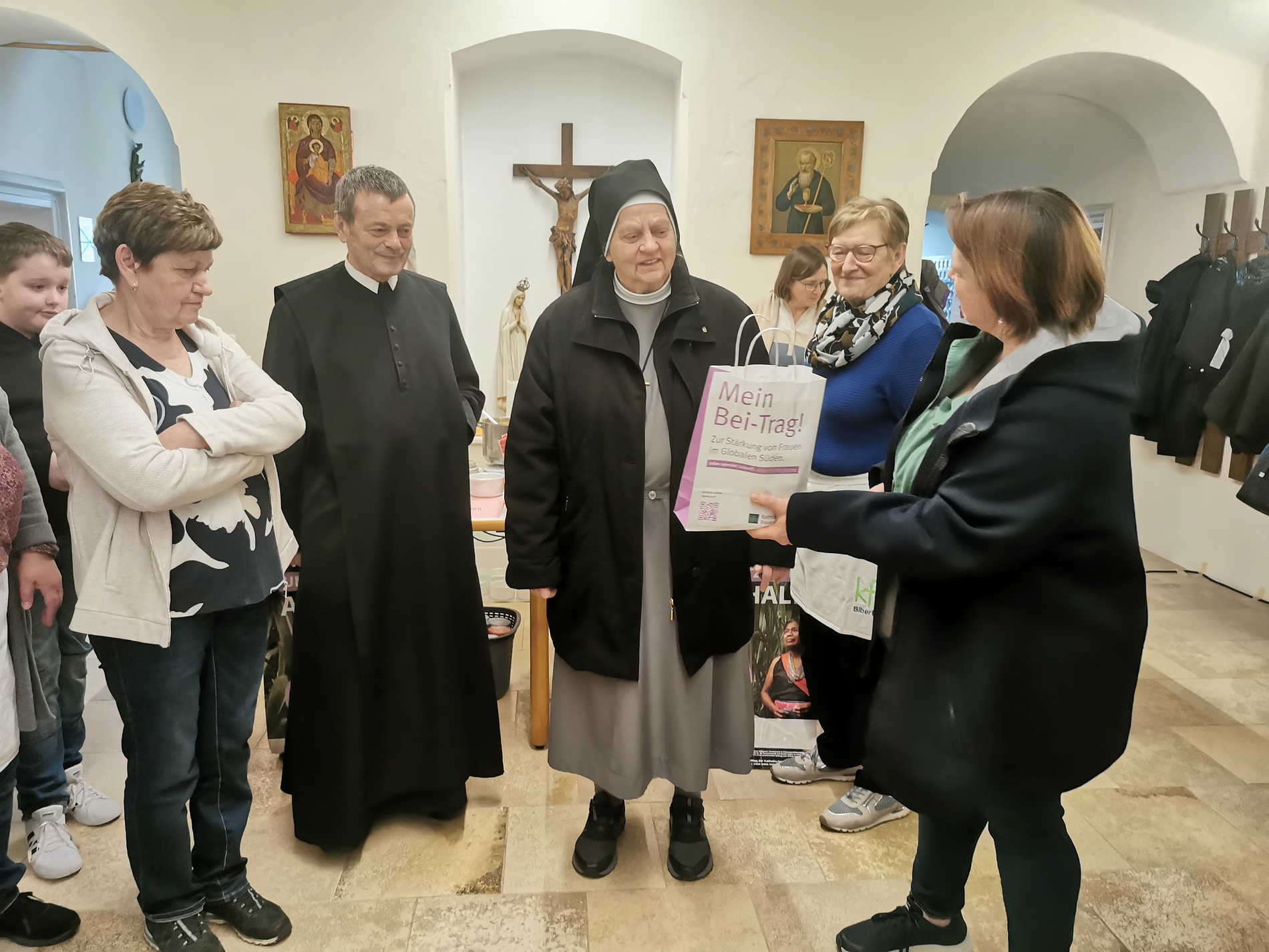 Und viele Gäste haben bei dieser Gelegenheit auch rumänische Handarbeiten eingekauft, die Sr. Ingrid mitgenommen hat. Der Erlös dieses Verkaufs kommt zur Gänze ihrer Rumänienhilfe zu Gute. Als weitere Unterstützung überreichte der Caritas Arbeitskreis der Pfarre den Inhalt des Spendenglases vom letzten Benefizcafé - rund EUR 330,00 - an Sr. Ingrid, worüber sie sich sichtlich freute.