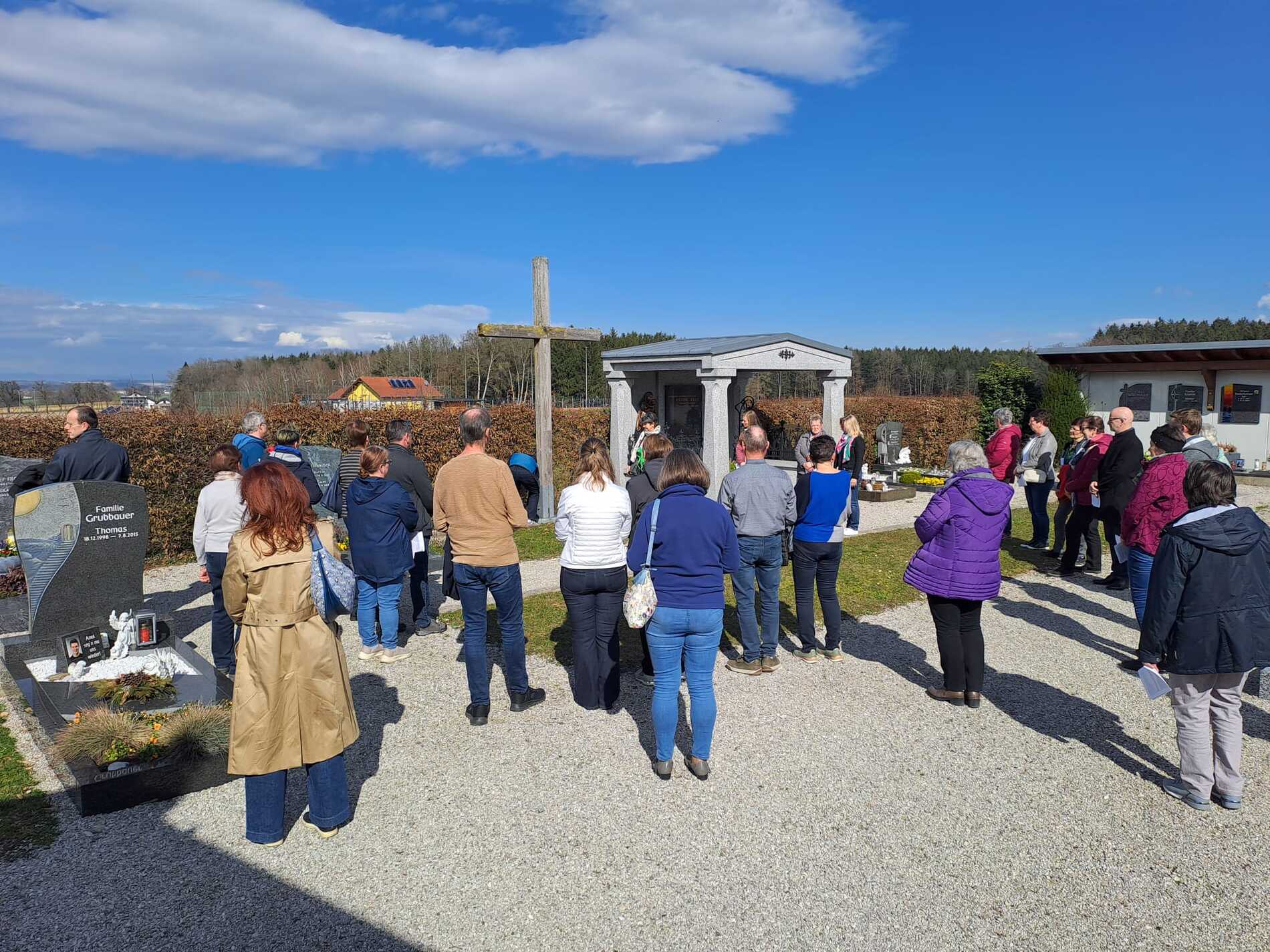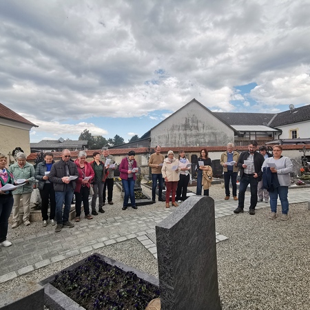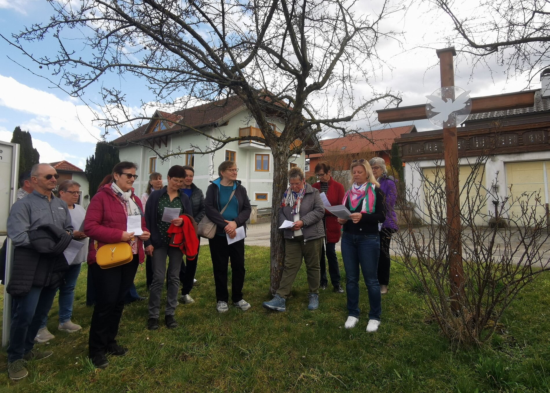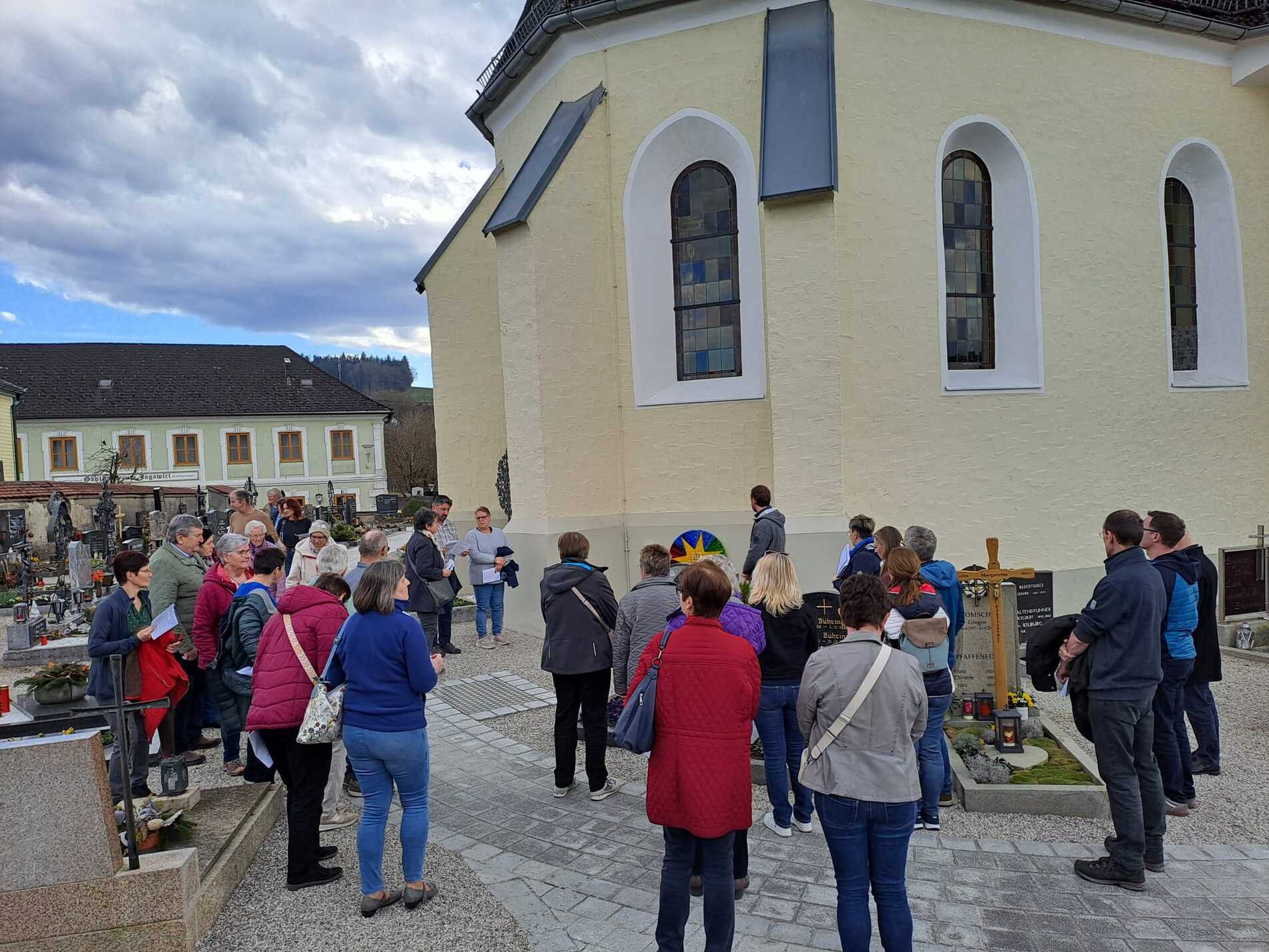 Beim Pfarrgartenkreuz schlossen wir liebe Menschen in unser Gebet ein. Bei der nächsten Station in der Kapelle am Gemeindefriedhof besuchten wir unsere Verstorbenen und entzündeten Kerzen für sie. Doch es ging auch um Besuch bei Menschen, die unserer Aufmerksamkeit bedürfen.