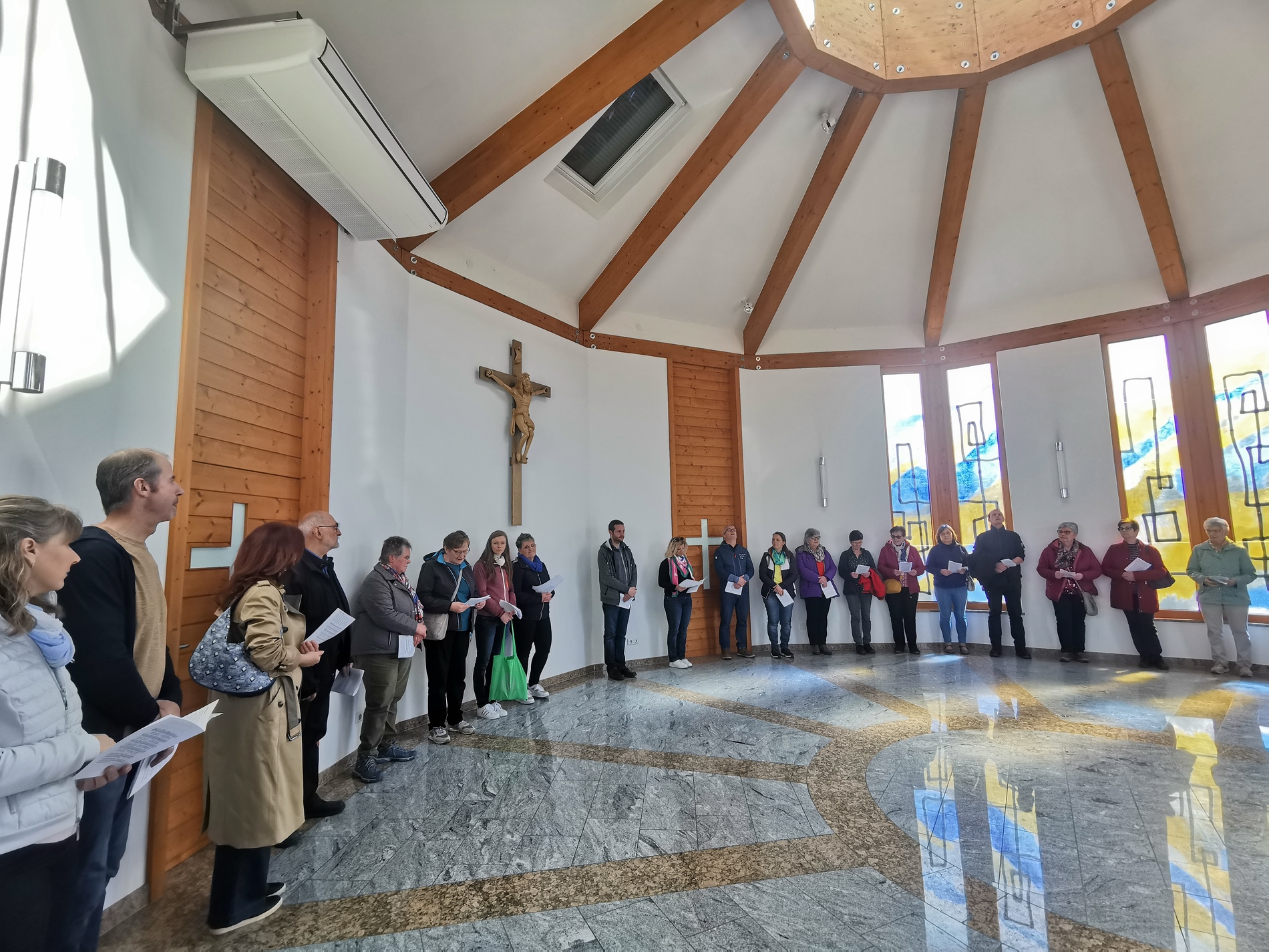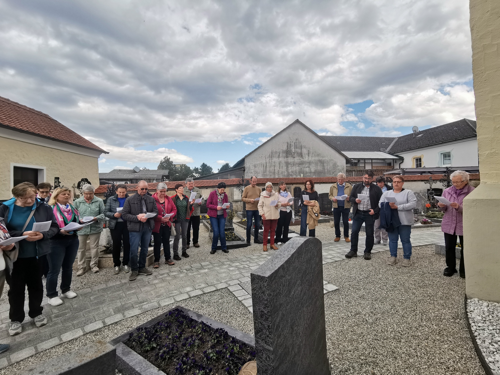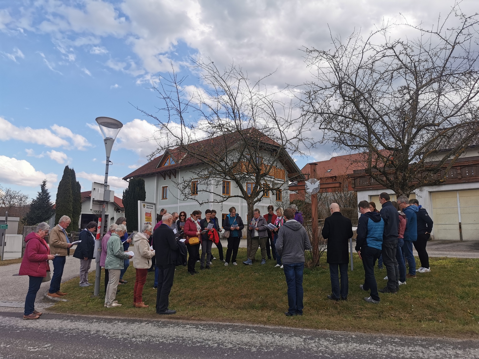 Beim Pfarrgartenkreuz schlossen wir liebe Menschen in unser Gebet ein. Bei der nächsten Station in der Kapelle am Gemeindefriedhof besuchten wir unsere Verstorbenen und entzündeten Kerzen für sie. Doch es ging auch um Besuch bei Menschen, die unserer Aufmerksamkeit bedürfen.