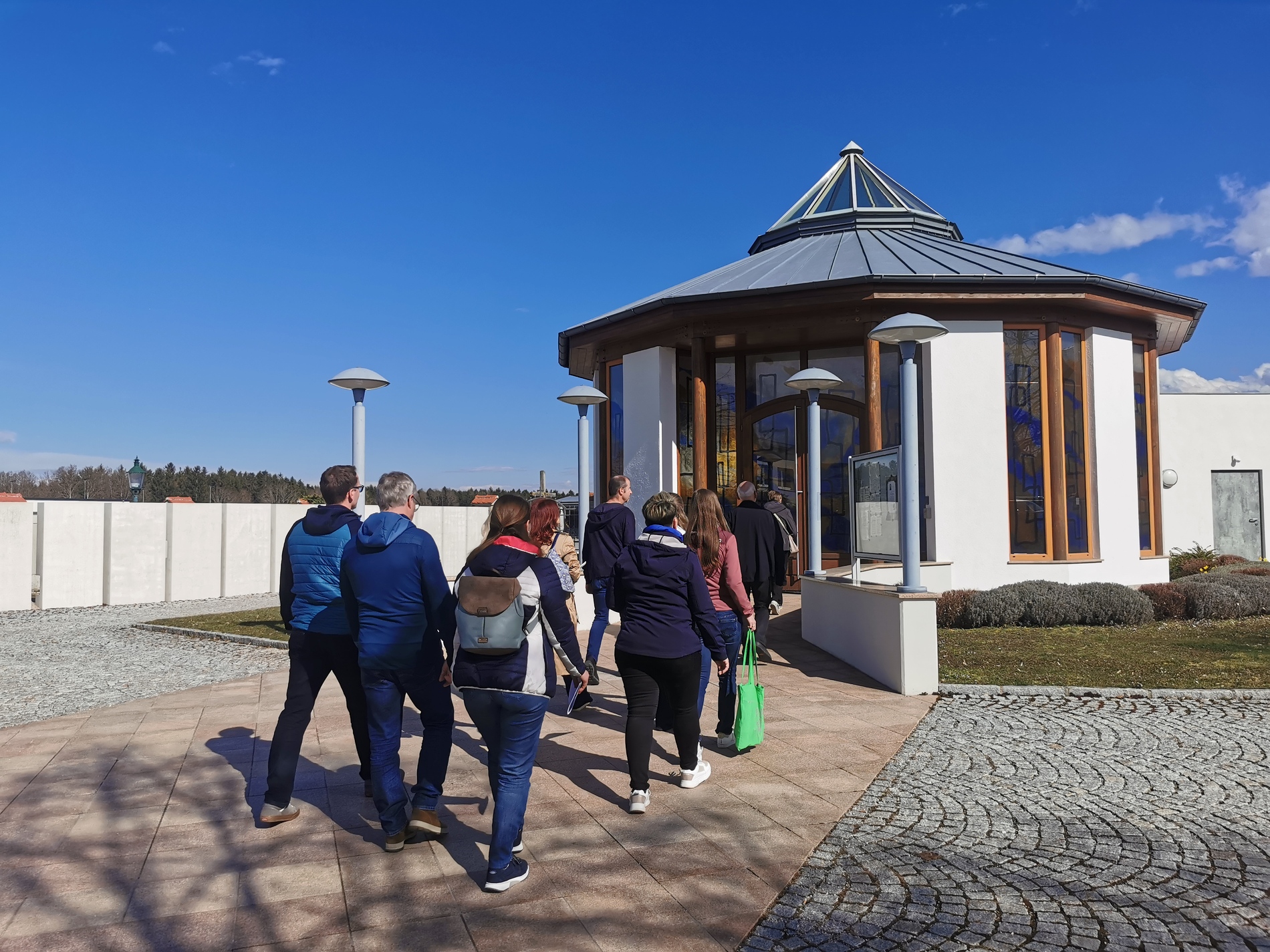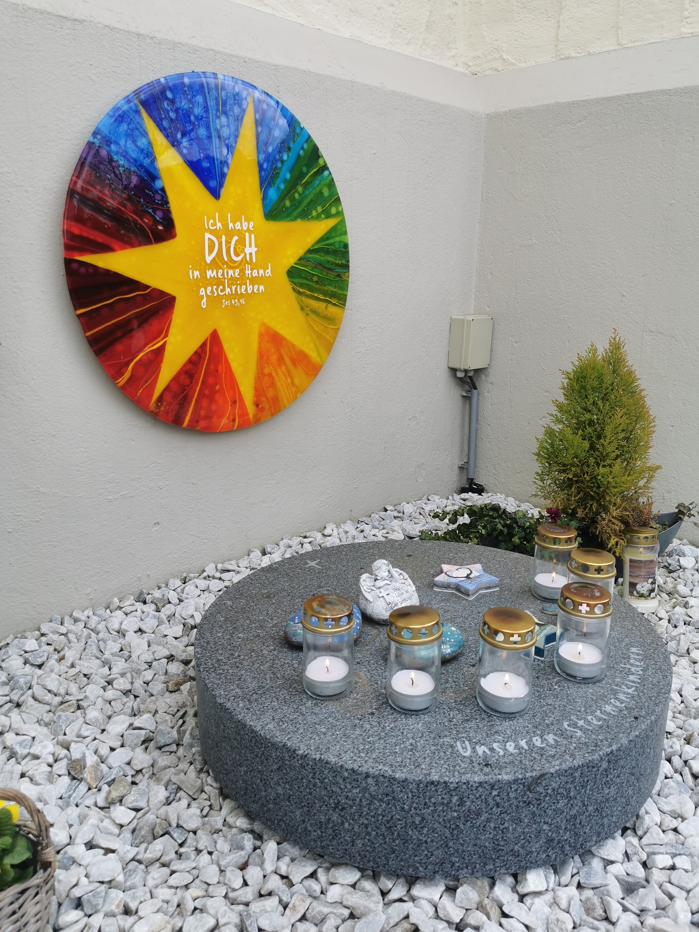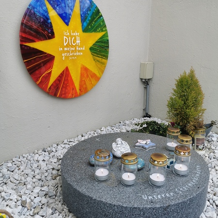 Nach einer kurzen Wanderung zur nächsten Station - dem Friedenskreuz - ging es um die Haltung: "Ich höre dir zu". Danach besuchten wir noch die Sternenkinder-Gedenkstätte am Pfarrfriedhof und hörten Texte zum Thema "Du gehörst genauso dazu". Im Anschluss entzündeten wir auch hier Lichter zur Erinnerung.