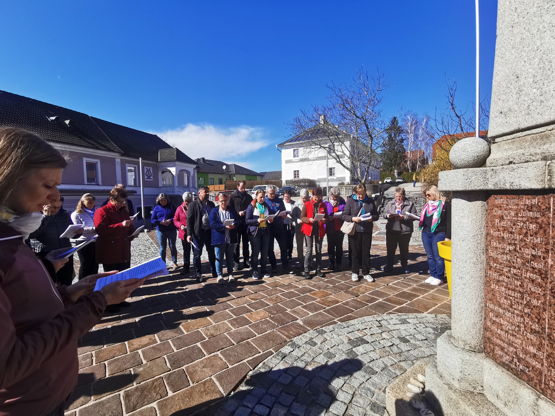 Beim Start in der Kirche teilten wir Brot und riefen dazu auf, Unterstützung zu teilen: materiell, körperlich oder seelisch. Beim Kriegerdenkmal am Dorfplatz erinnerten wir uns der Toten der Weltkriege und beteten für den Frieden - "reden wir gut übereinander" heißt: wertschätzend miteinander umzugehen.
