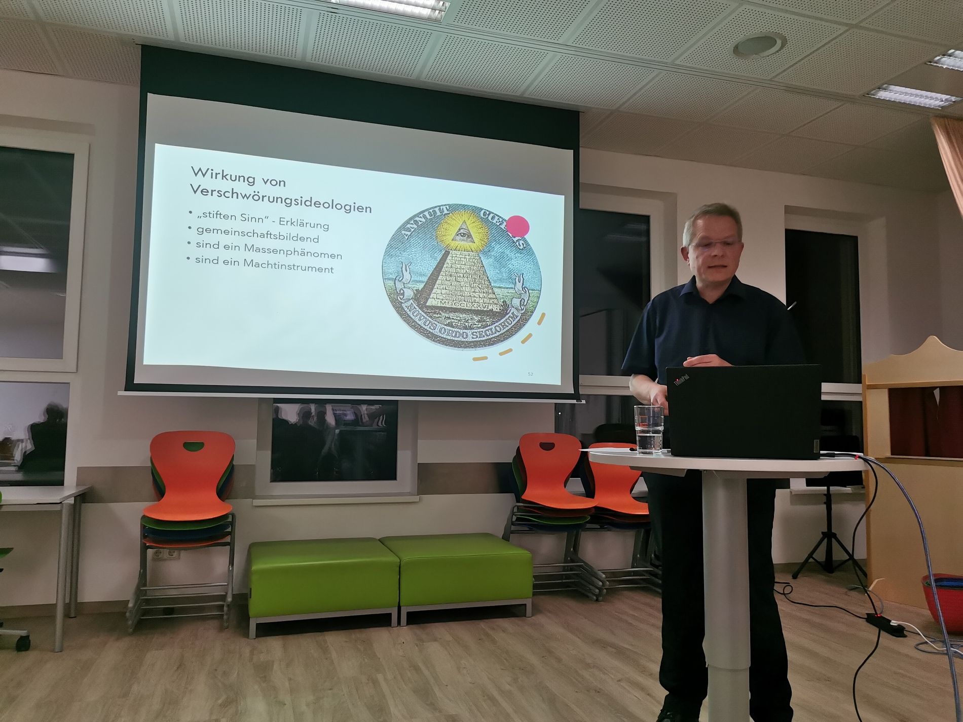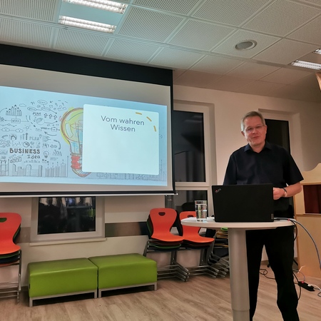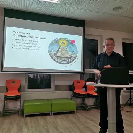 Josef Schmid erklärte die Verschwörungstheorie so: Ein soziales Phänomen tritt ein und ein Gruppe von Menschen tut sich zusammen, um dieses Phänomen mit einer Theorie zu erklären, die nicht auf Wahrheiten basiert. Schon seit 2000 Jahren haben diese Verschwörungstheorien antisemitischen Hintergrund und schüren den Hass auf jüdische Menschen. Der Vortrag gab Informationen dazu, wie dieser Hass durch die verschiedenen Legenden entstanden ist und noch weiter geschürt wird und erklärte auch die Unterschiede zwischen Verschwörung und Verschwörungstheorie.