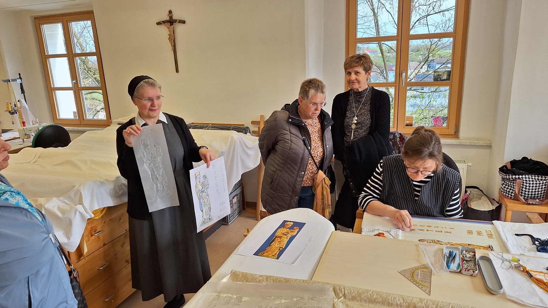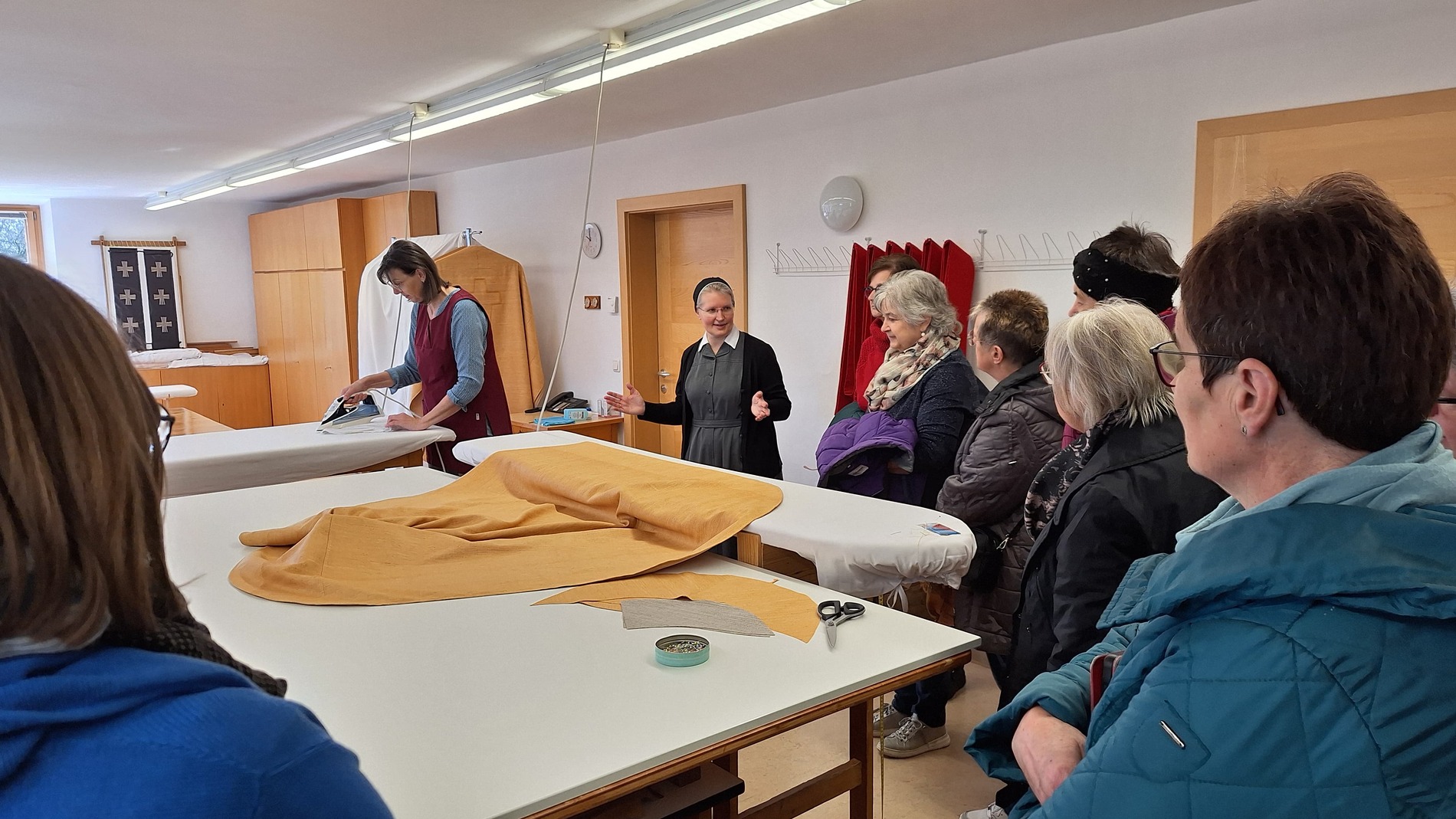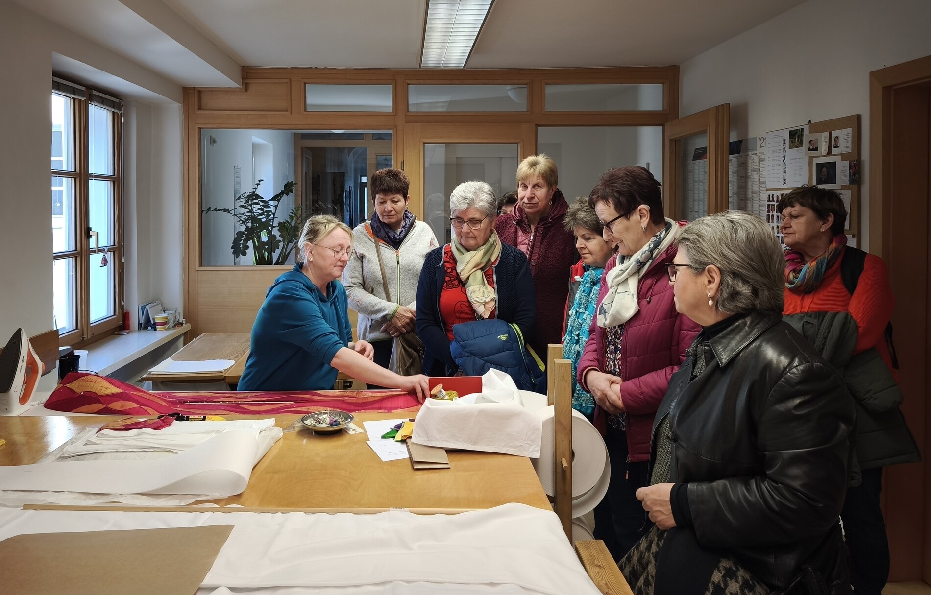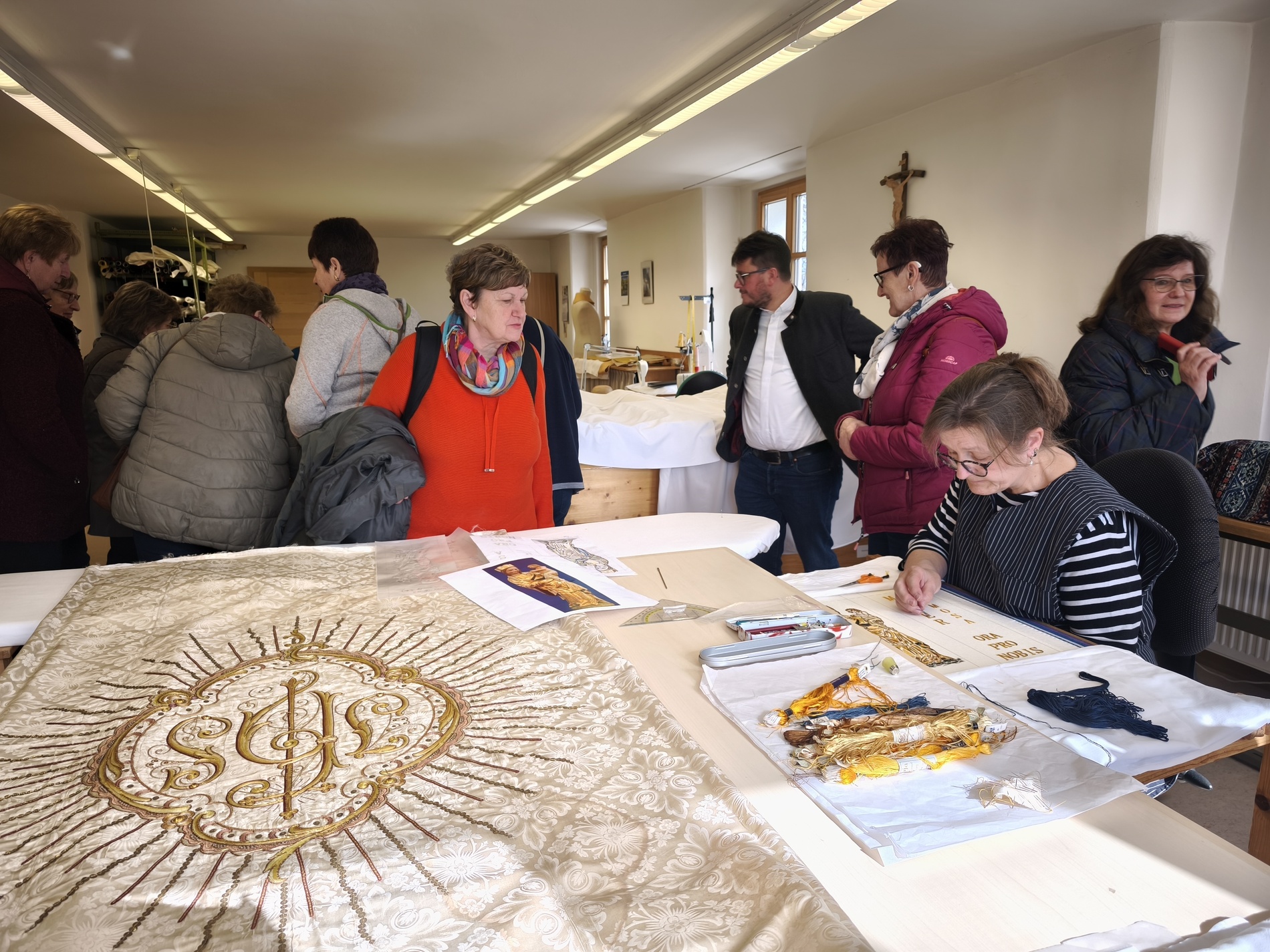 Da zur Zeit der Biberbacher Fronleichnams-Himmel im Kloster der Benediktinerinnen in Steinerkirchen zur Restaurierung ist kam der Wunsch auf, die dortige Paramentik einmal zu besuchen und mehr über dieses Handwerk zu erfahren. Viel zu Bestaunen gab es dann auch bei der Führung durch die Paramenten-Stickerei und die Batik-Abteilung: Das ganze handwerkliche Geschick ruht in den Händen von nur mehr wenigen weltlichen MitarbeiterInnen oder Klosterschwestern.