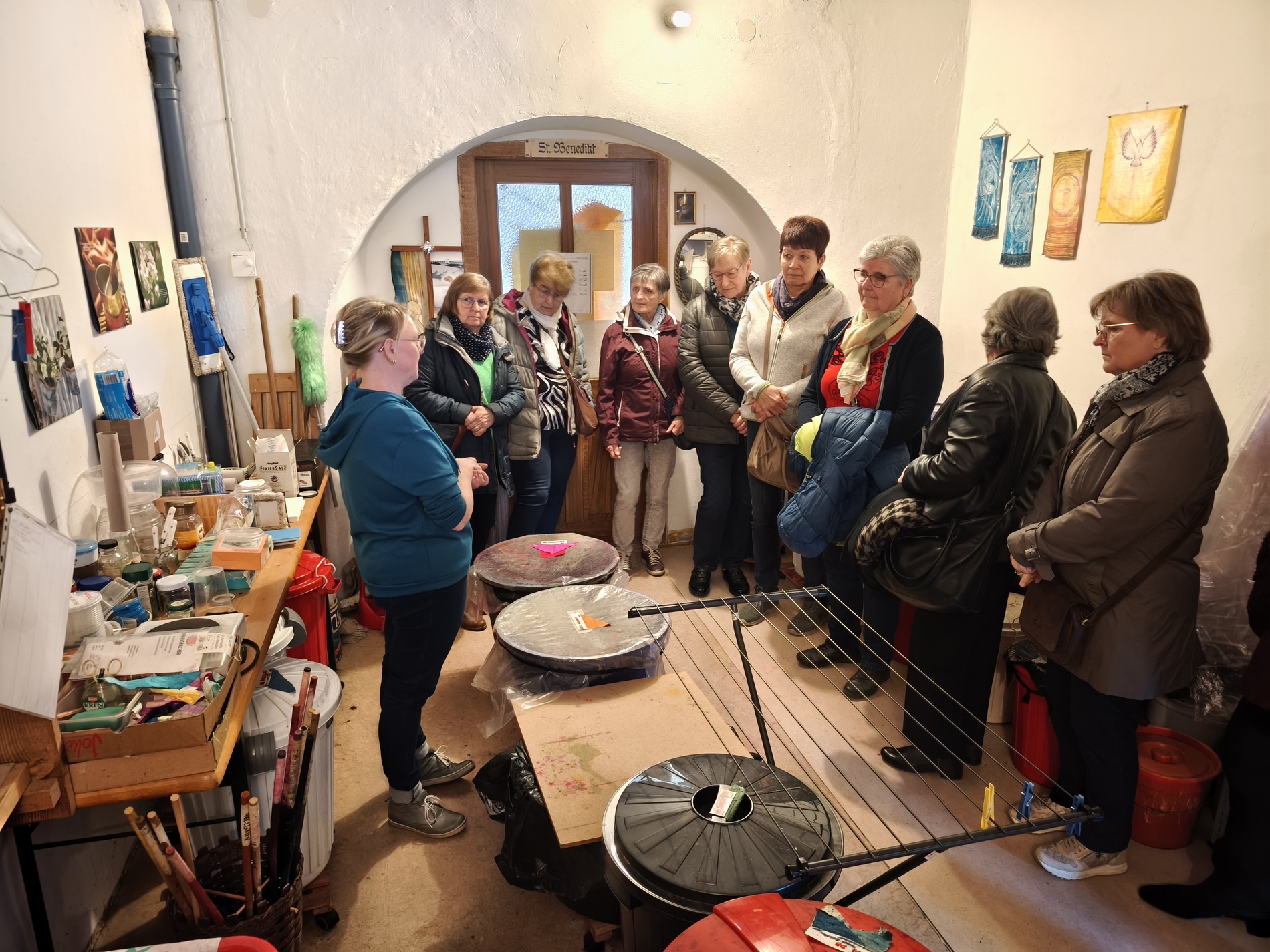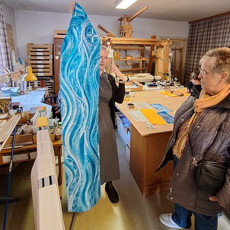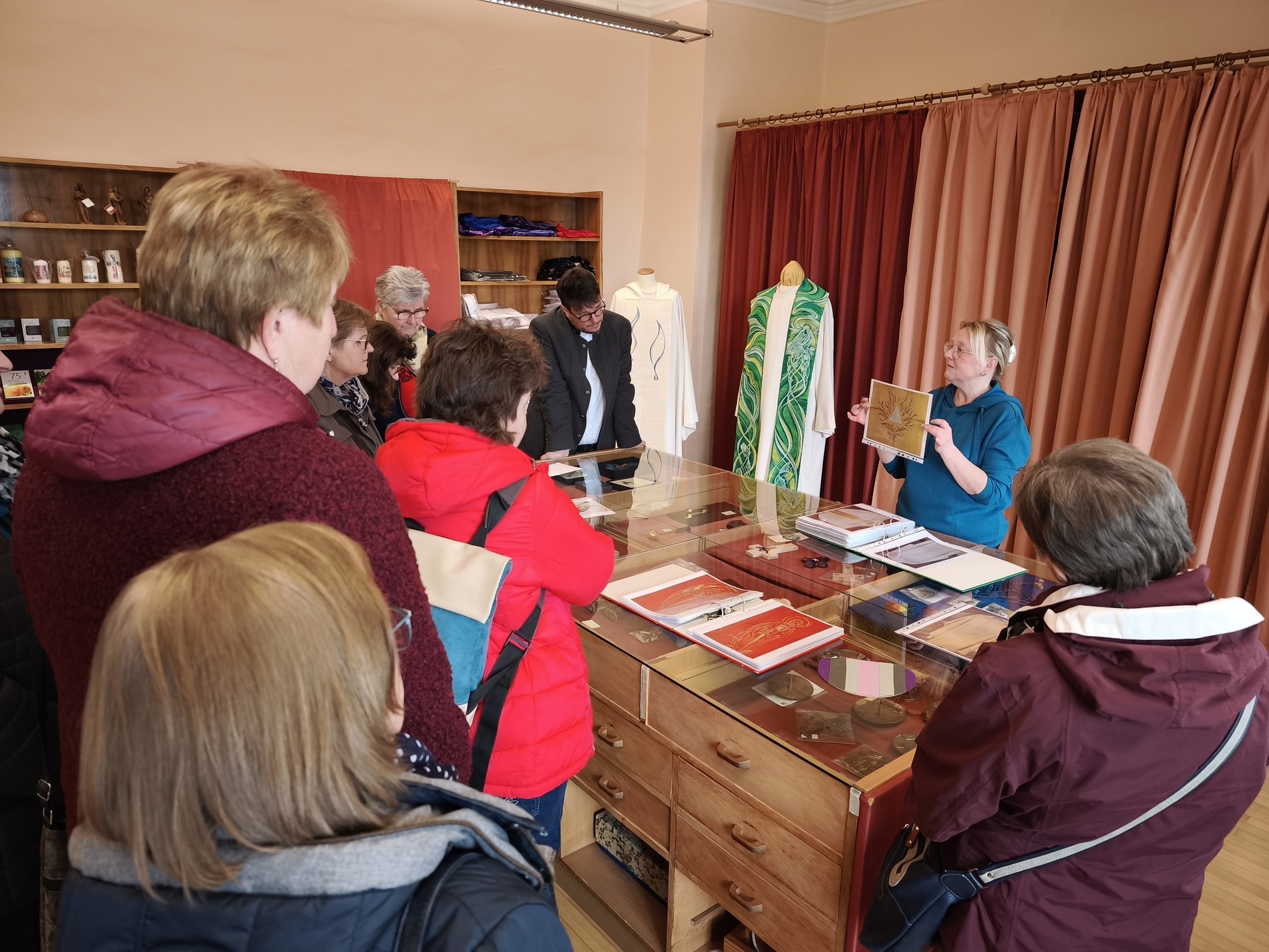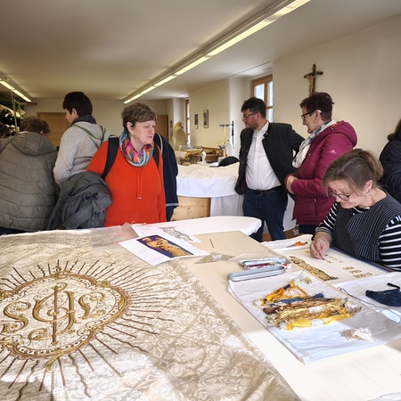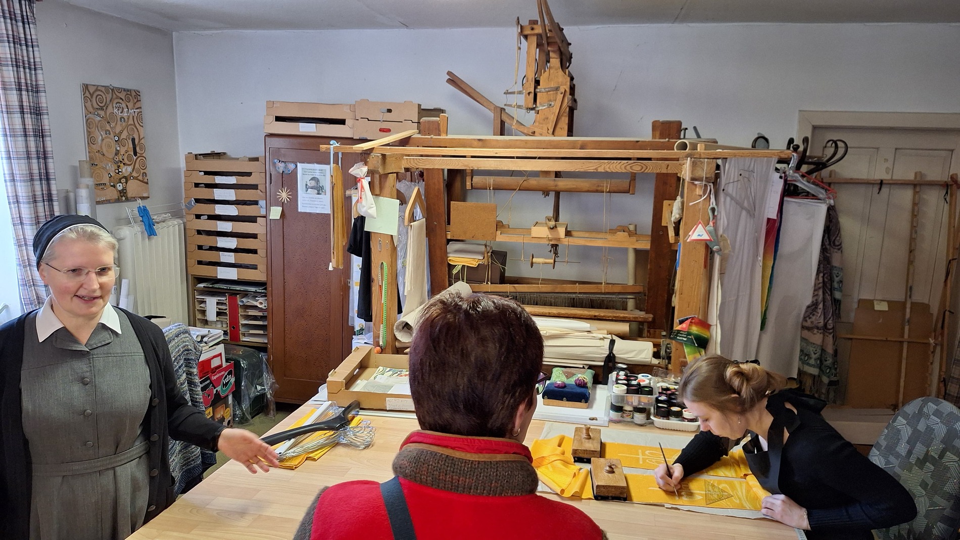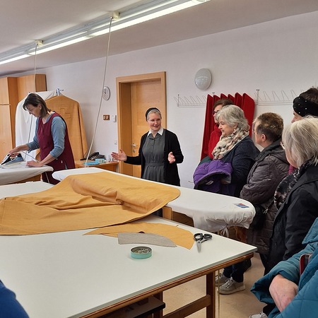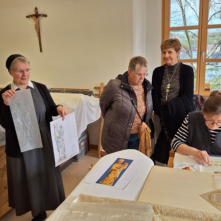 Da zur Zeit der Biberbacher Fronleichnams-Himmel im Kloster der Benediktinerinnen in Steinerkirchen zur Restaurierung ist kam der Wunsch auf, die dortige Paramentik einmal zu besuchen und mehr über dieses Handwerk zu erfahren. Viel zu Bestaunen gab es dann auch bei der Führung durch die Paramenten-Stickerei und die Batik-Abteilung: Das ganze handwerkliche Geschick ruht in den Händen von nur mehr wenigen weltlichen MitarbeiterInnen oder Klosterschwestern.