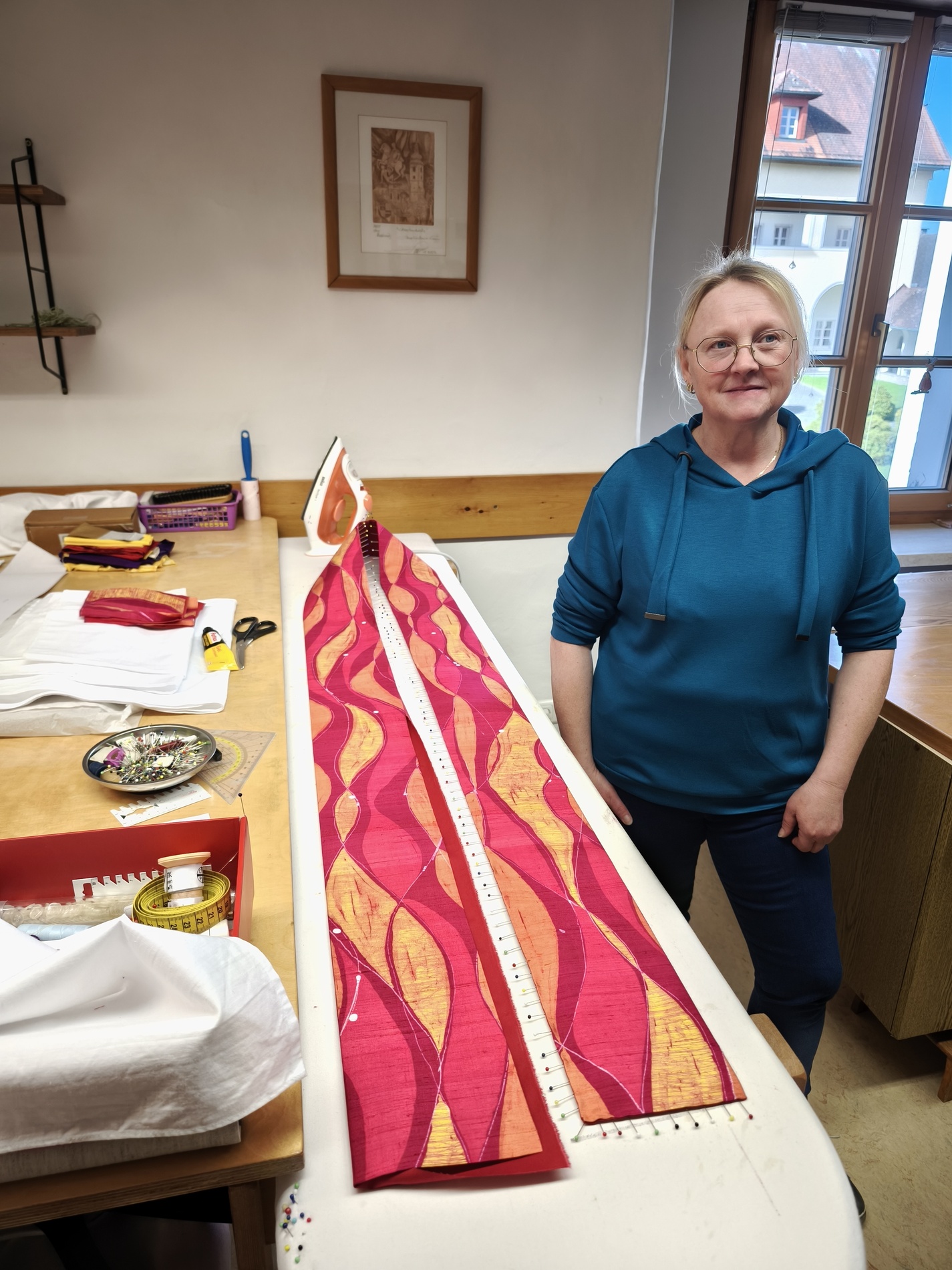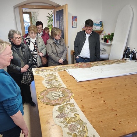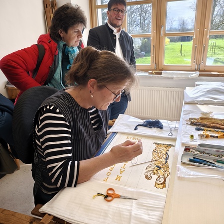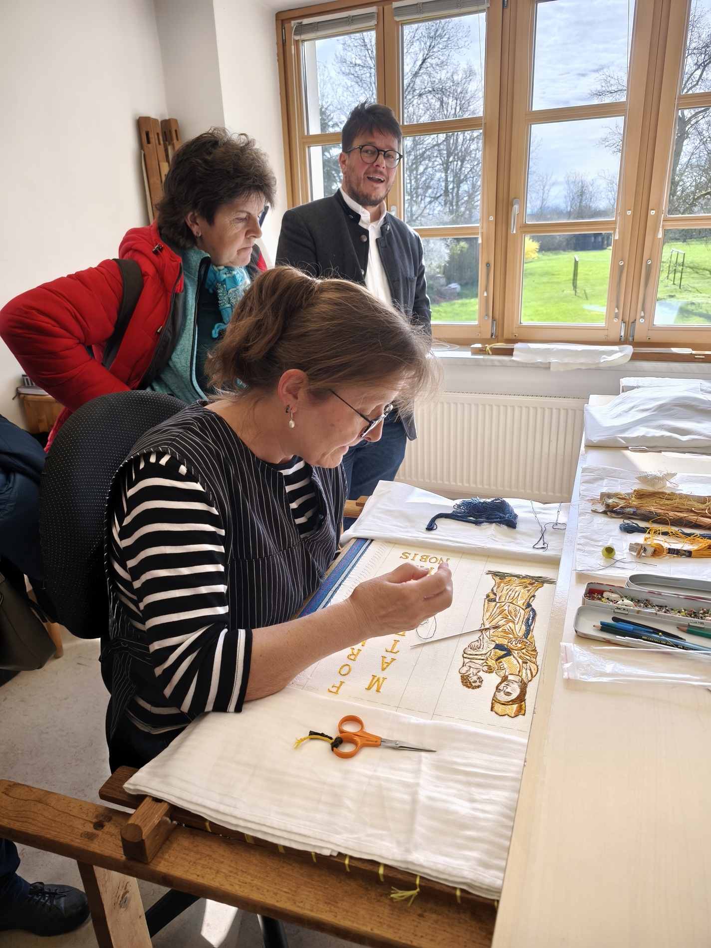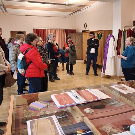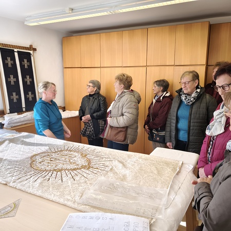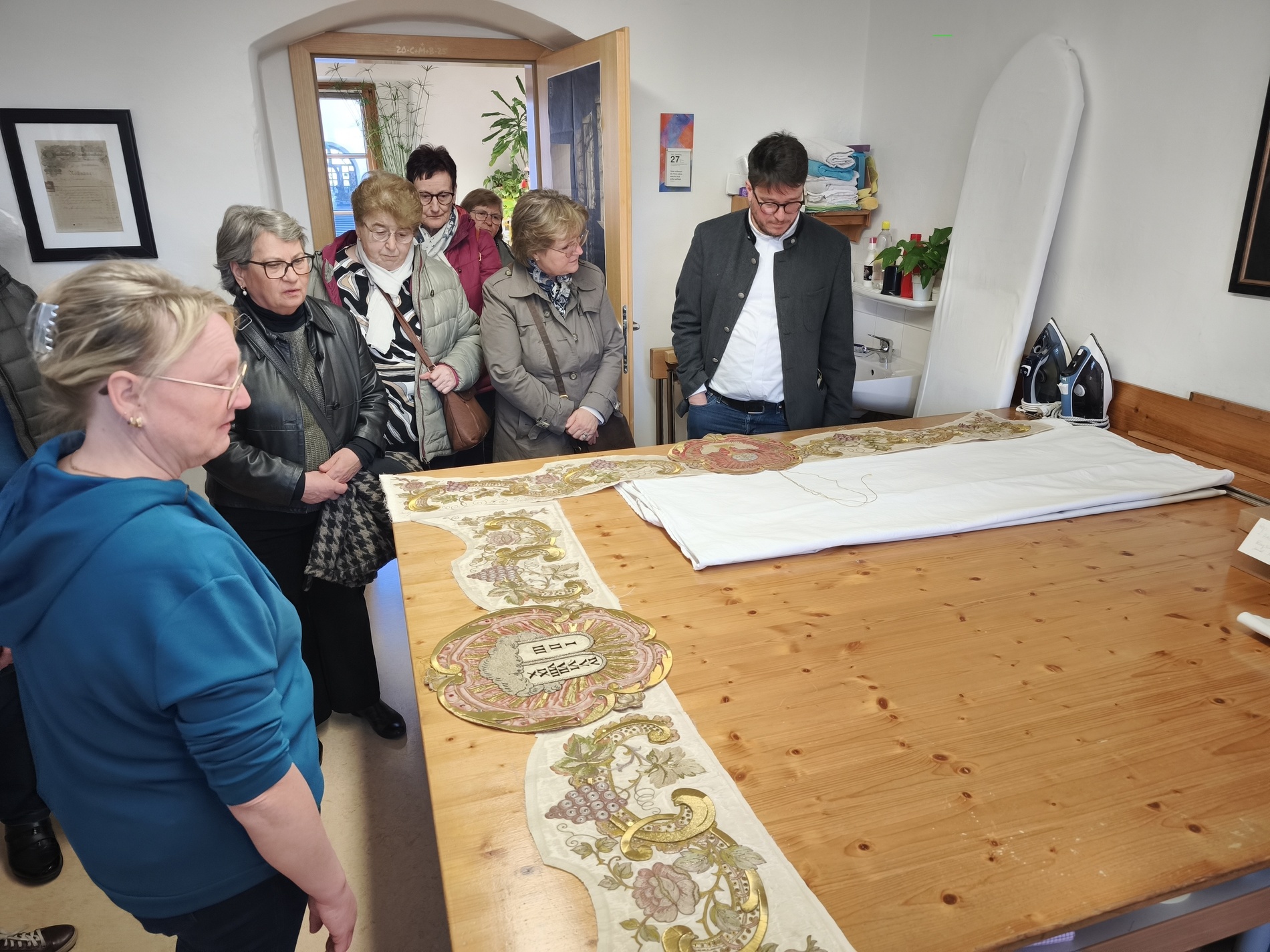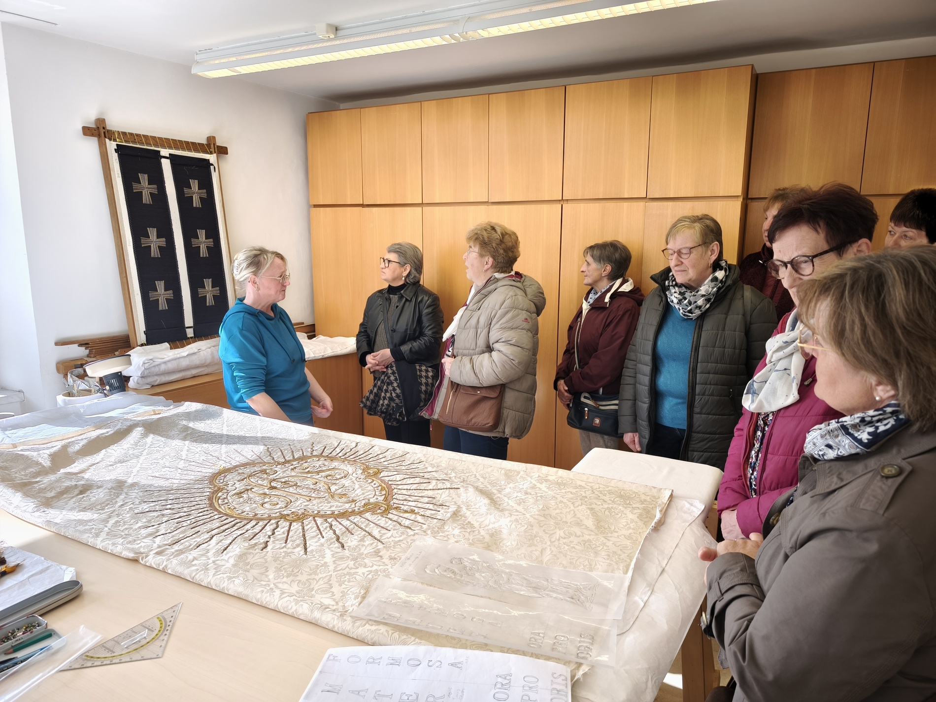 Leider werden immer mehr Paramenten-Stickereien aufgelassen und so gibt es in Steinerkirchen lange Wartezeiten auf handgefertigte Messgewänder, Stolen oder Restaurierungen von Fahnen oder anderen Paramenten. Wir waren begeistert von den schönen Stoffen, Stickereien und Motiven, die auf verschiedenste Weise hergestellt werden.