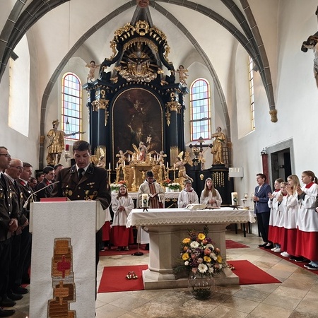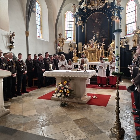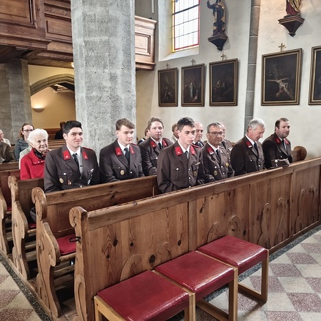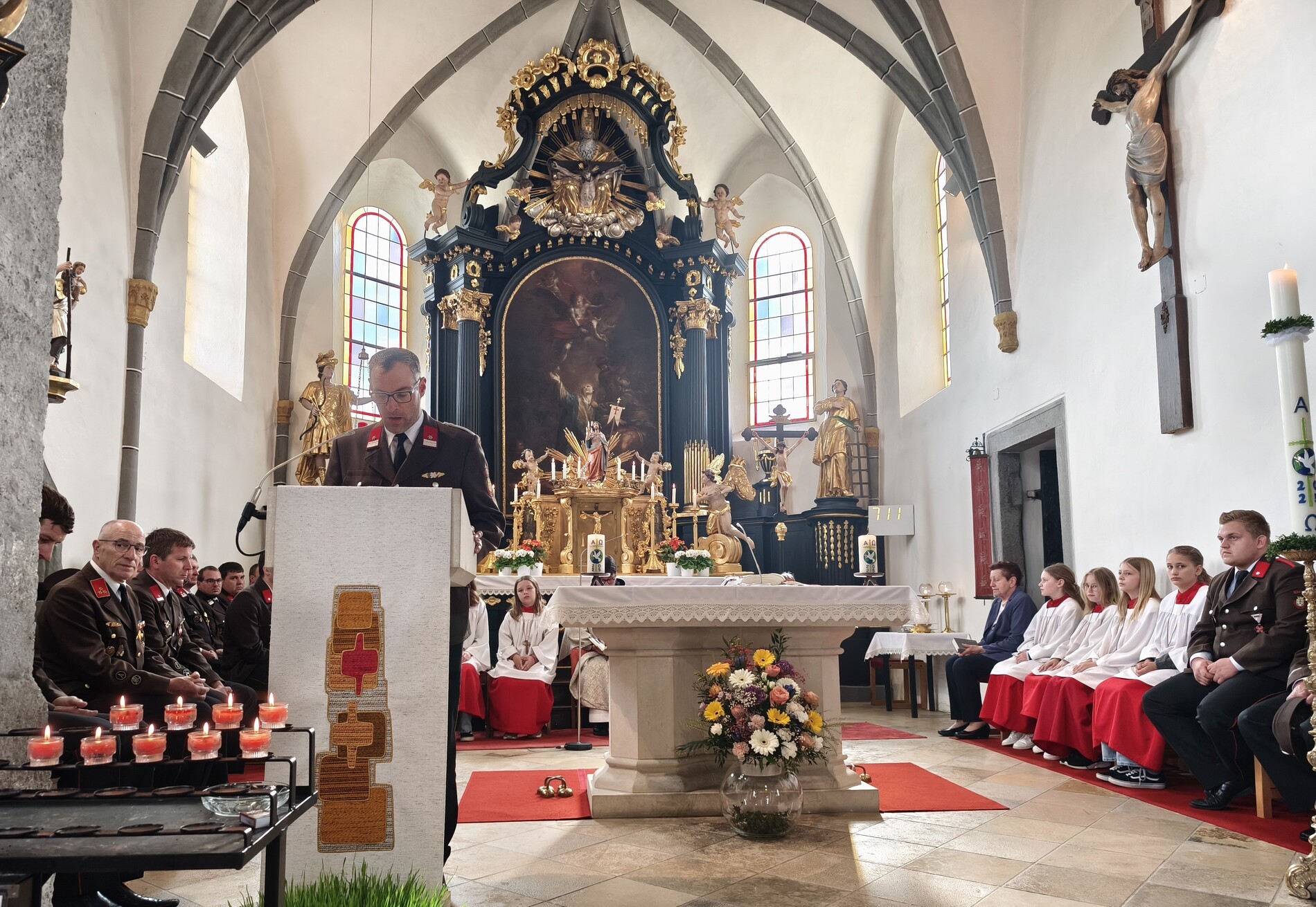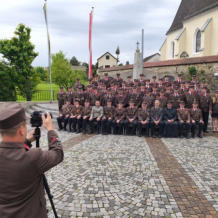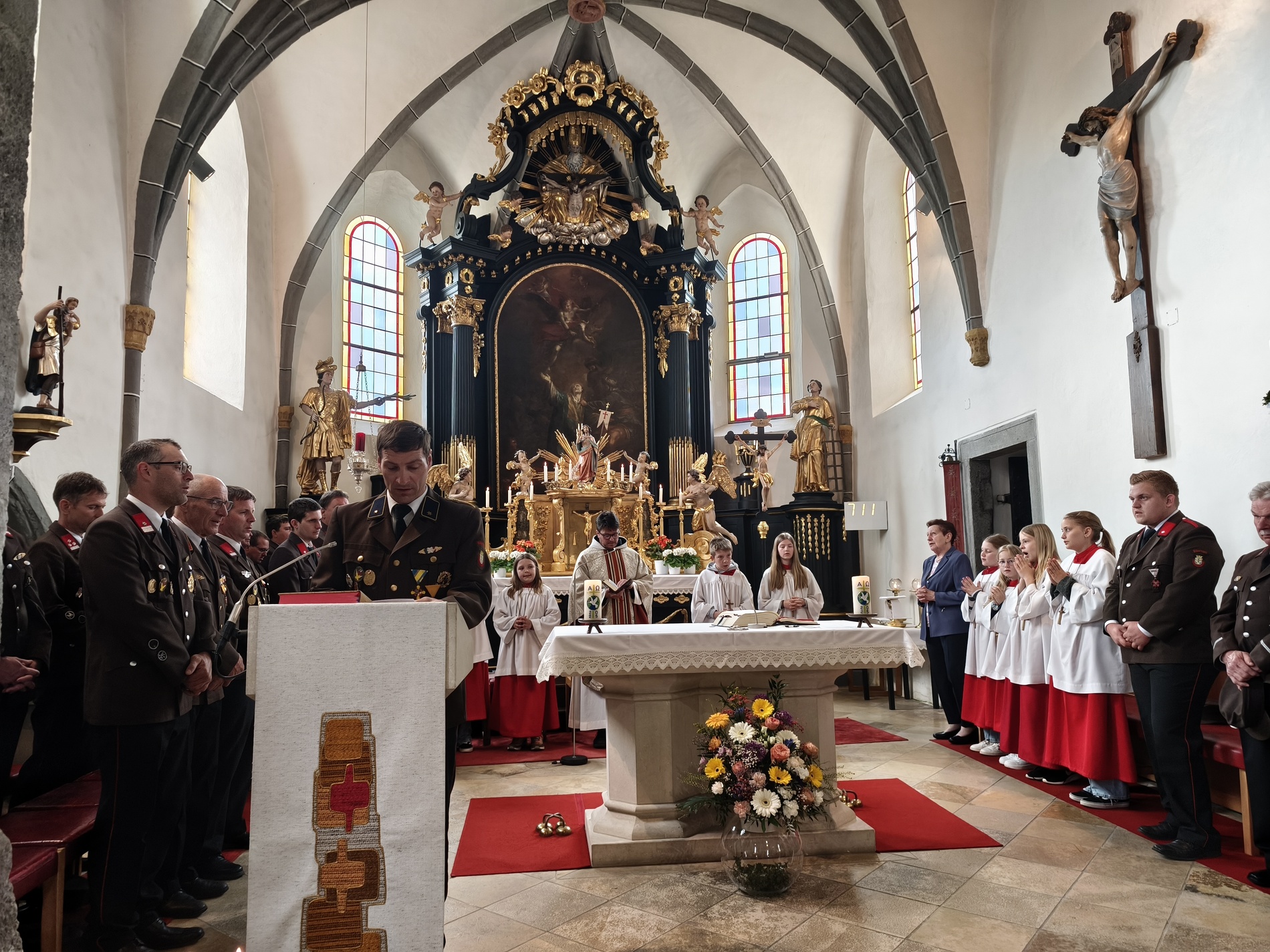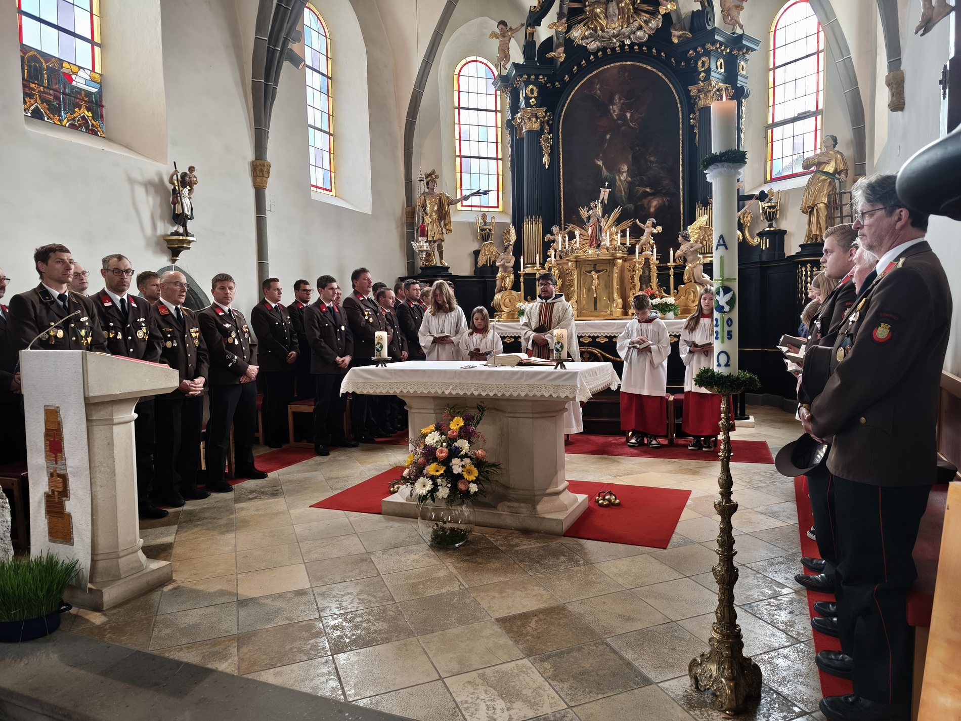 An diesem Florianisonntag nahm die Feuerwehr in größtmöglicher Mannschaftsstärke an der Messe teil - ein beindruckendes Bild - waren doch alle im Anschluss zum gemeinsamen Gruppenfoto am Dorfplatz geladen, das aus Anlass des 125 Jahr-Jubiläums entstand.