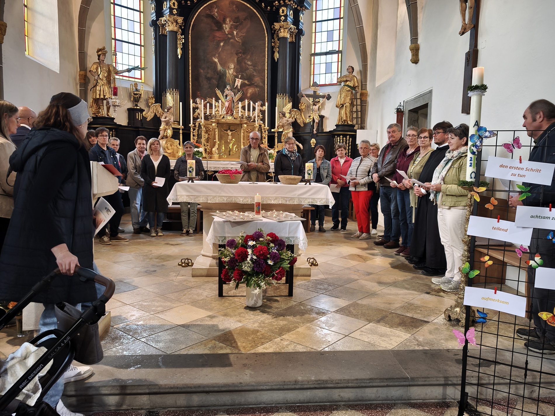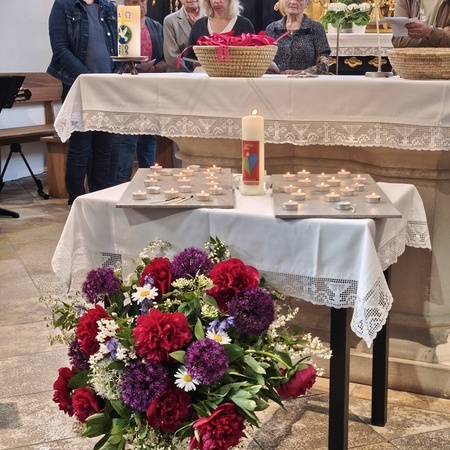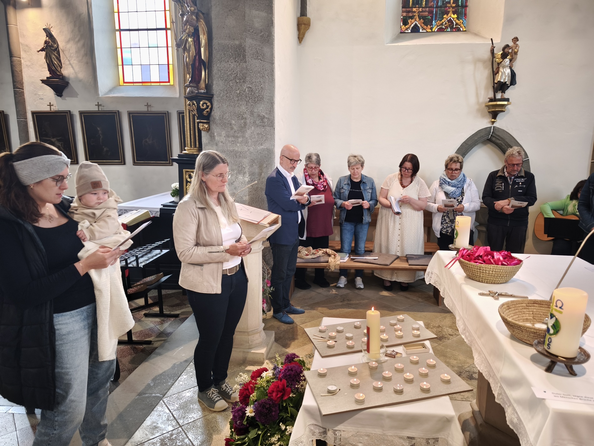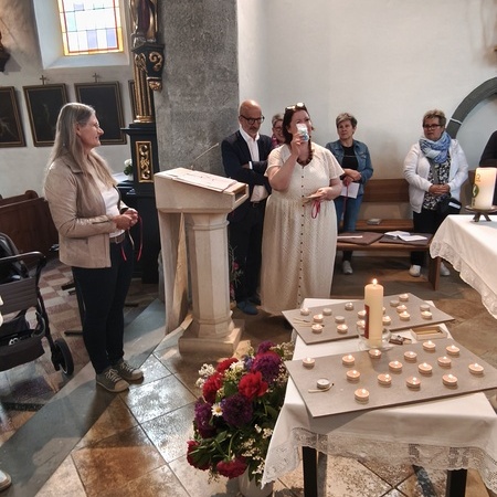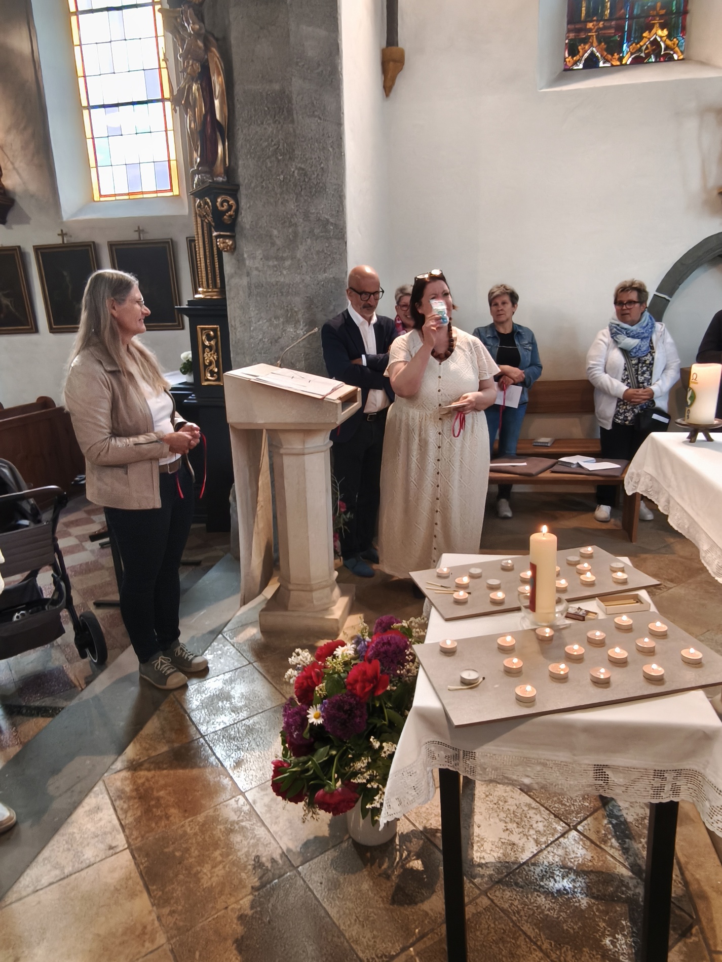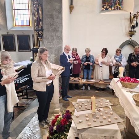 In einem kurzen Gesprächsaustausch holten wir die menschlichen Engel in unserem Leben in unsere Mitte und entzündeten als Dank und Bitte Kerzen vor dem Volksaltar. Im abschließenden Gebetskreis im Altarraum segneten wir gemeinsam die Segensbänder, die wieder zusammen mit dem nächsten Pfarrblatt und der Caritas Sammlung an alle Haushalte in Biberbach verteilt werden - und wir segneten uns selber mit dem Segenslied "Gottes guter Segen sei mit uns" (an dieser Stelle Danke an Maria Rittmannsberger für die musikalische Begleitung mit der Gitarre!).