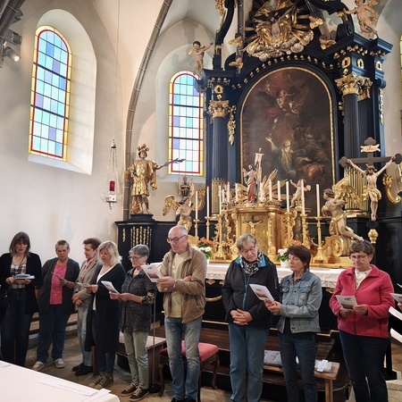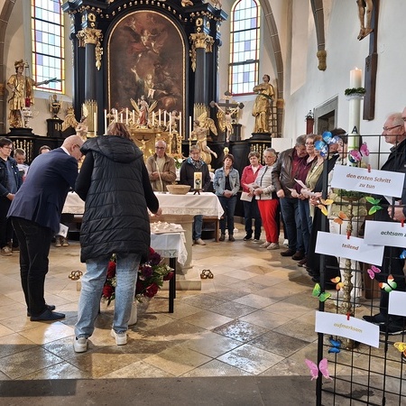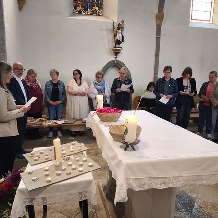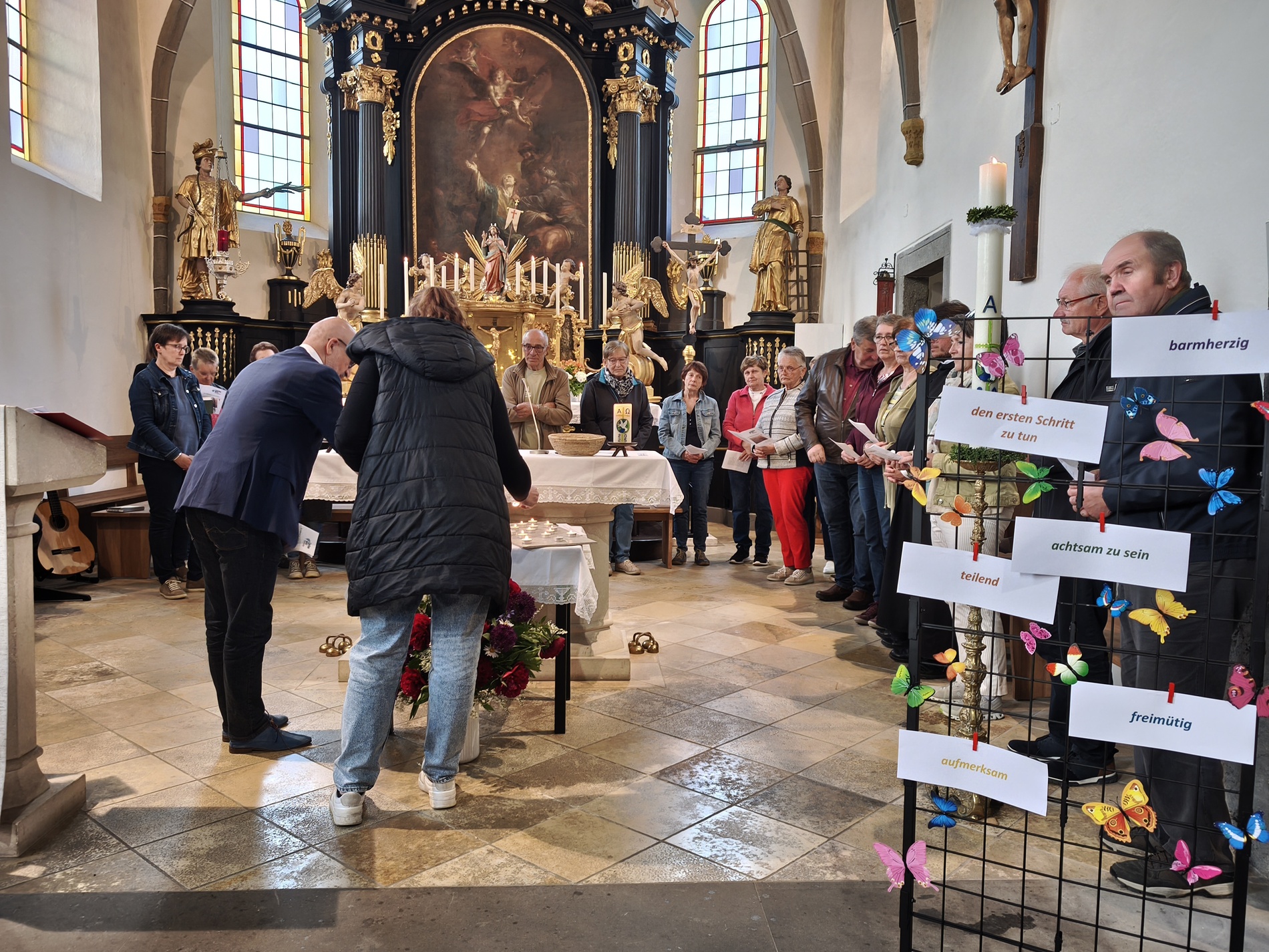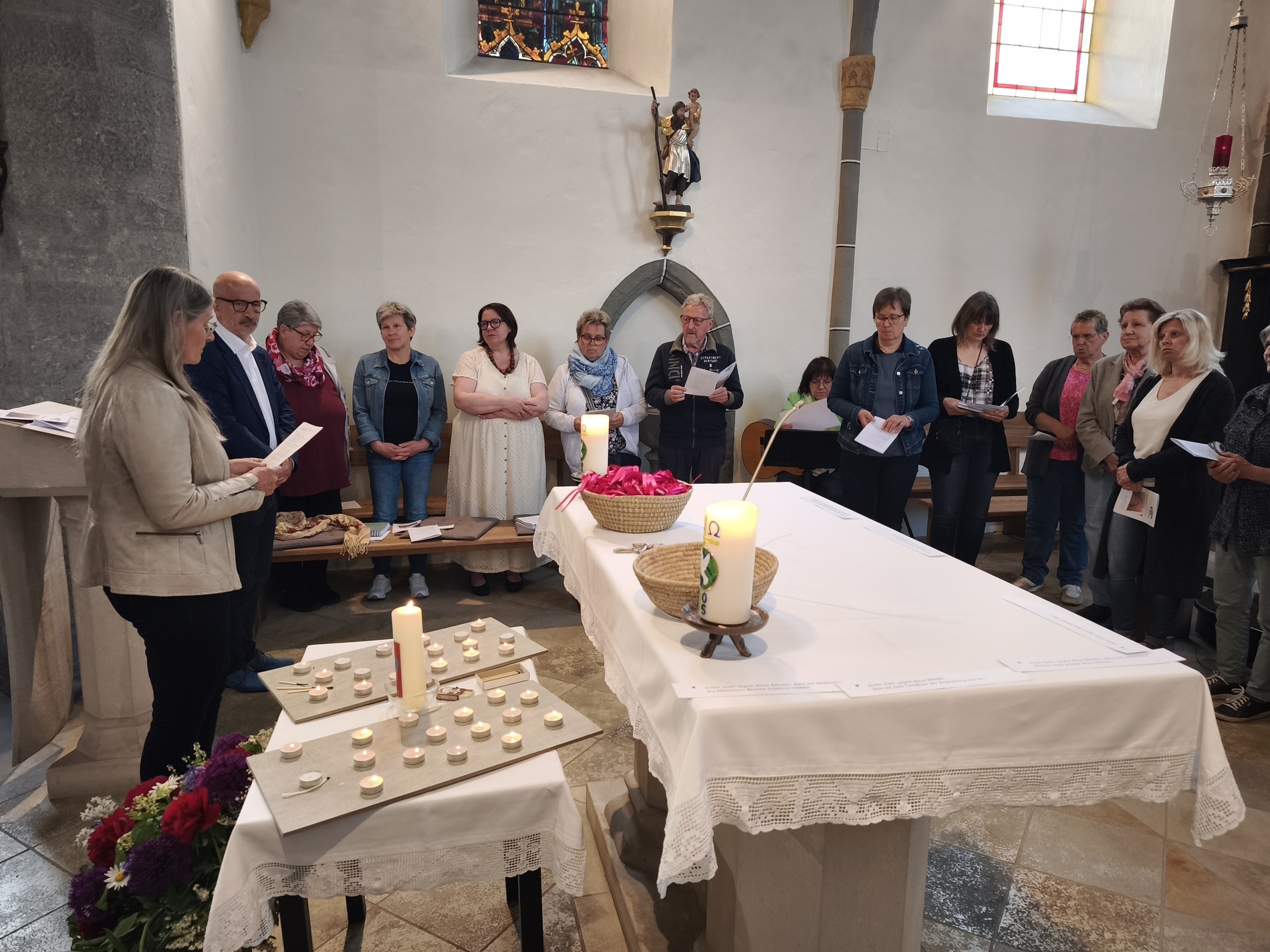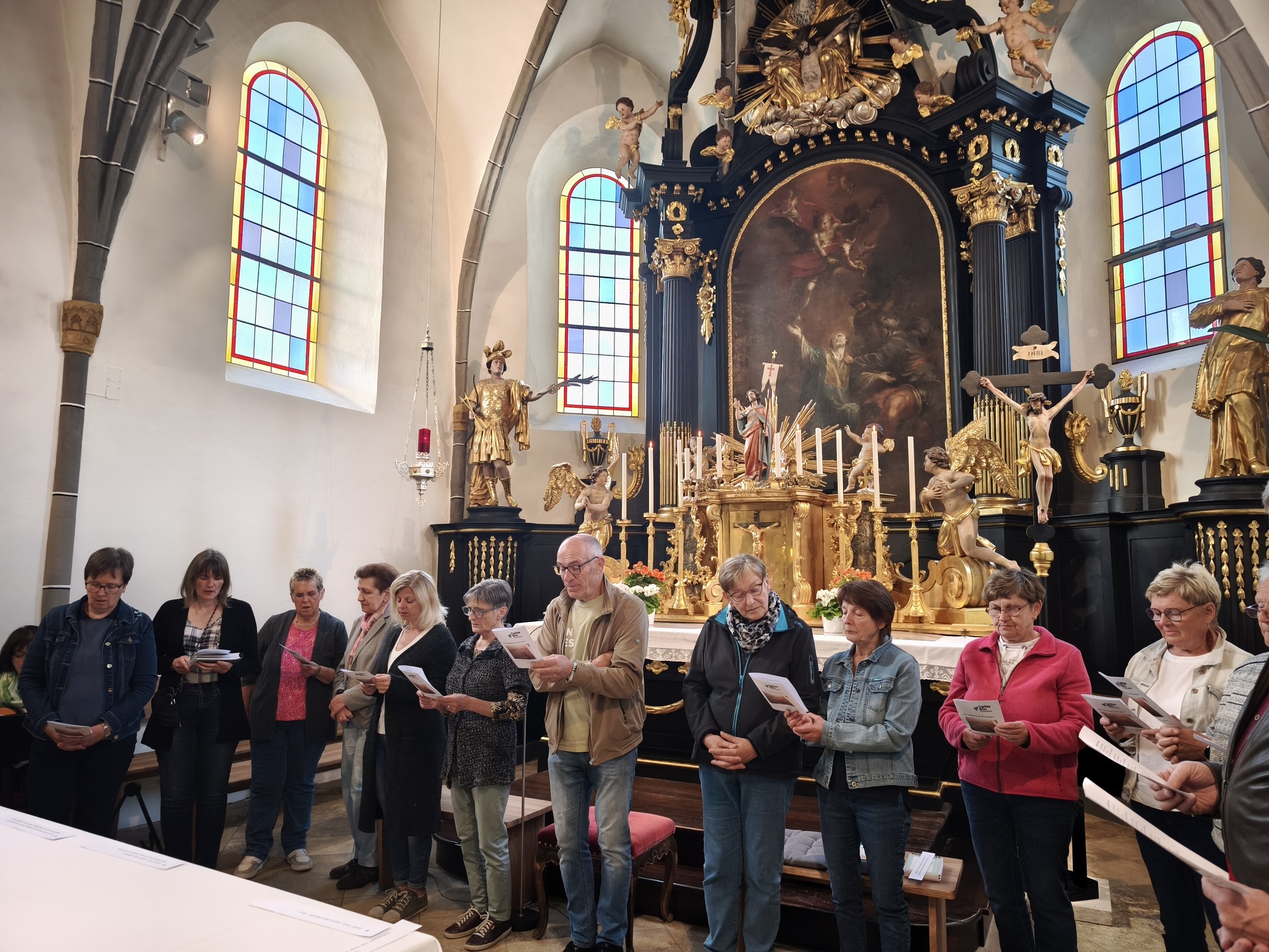 In einem kurzen Gesprächsaustausch holten wir die menschlichen Engel in unserem Leben in unsere Mitte und entzündeten als Dank und Bitte Kerzen vor dem Volksaltar. Im abschließenden Gebetskreis im Altarraum segneten wir gemeinsam die Segensbänder, die wieder zusammen mit dem nächsten Pfarrblatt und der Caritas Sammlung an alle Haushalte in Biberbach verteilt werden - und wir segneten uns selber mit dem Segenslied "Gottes guter Segen sei mit uns" (an dieser Stelle Danke an Maria Rittmannsberger für die musikalische Begleitung mit der Gitarre!).