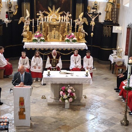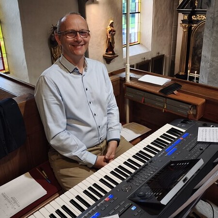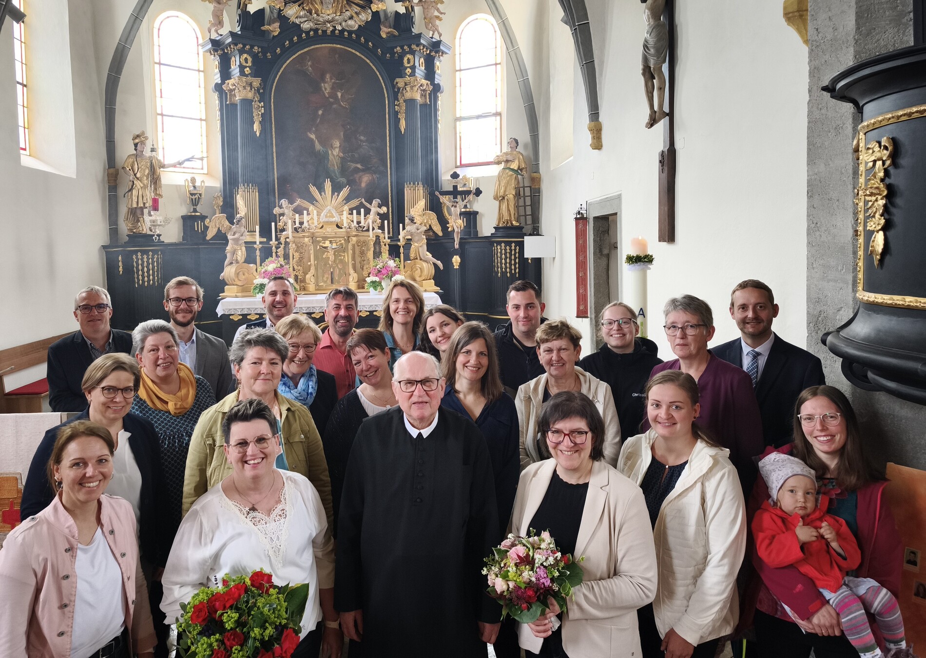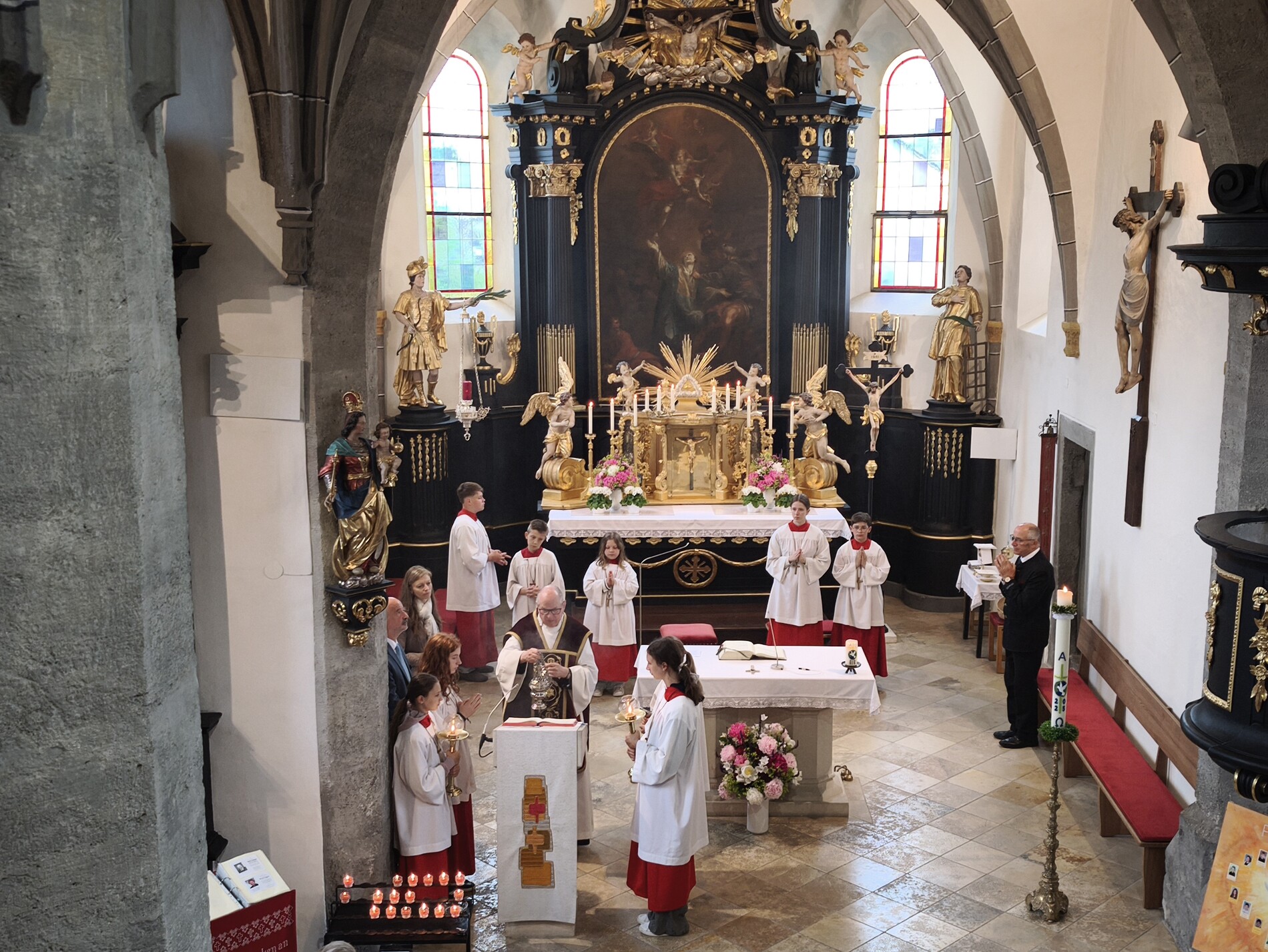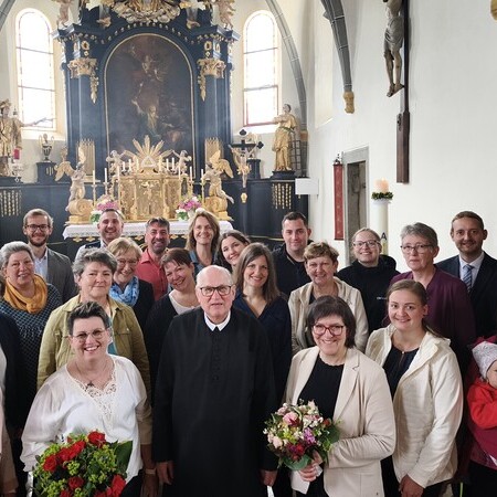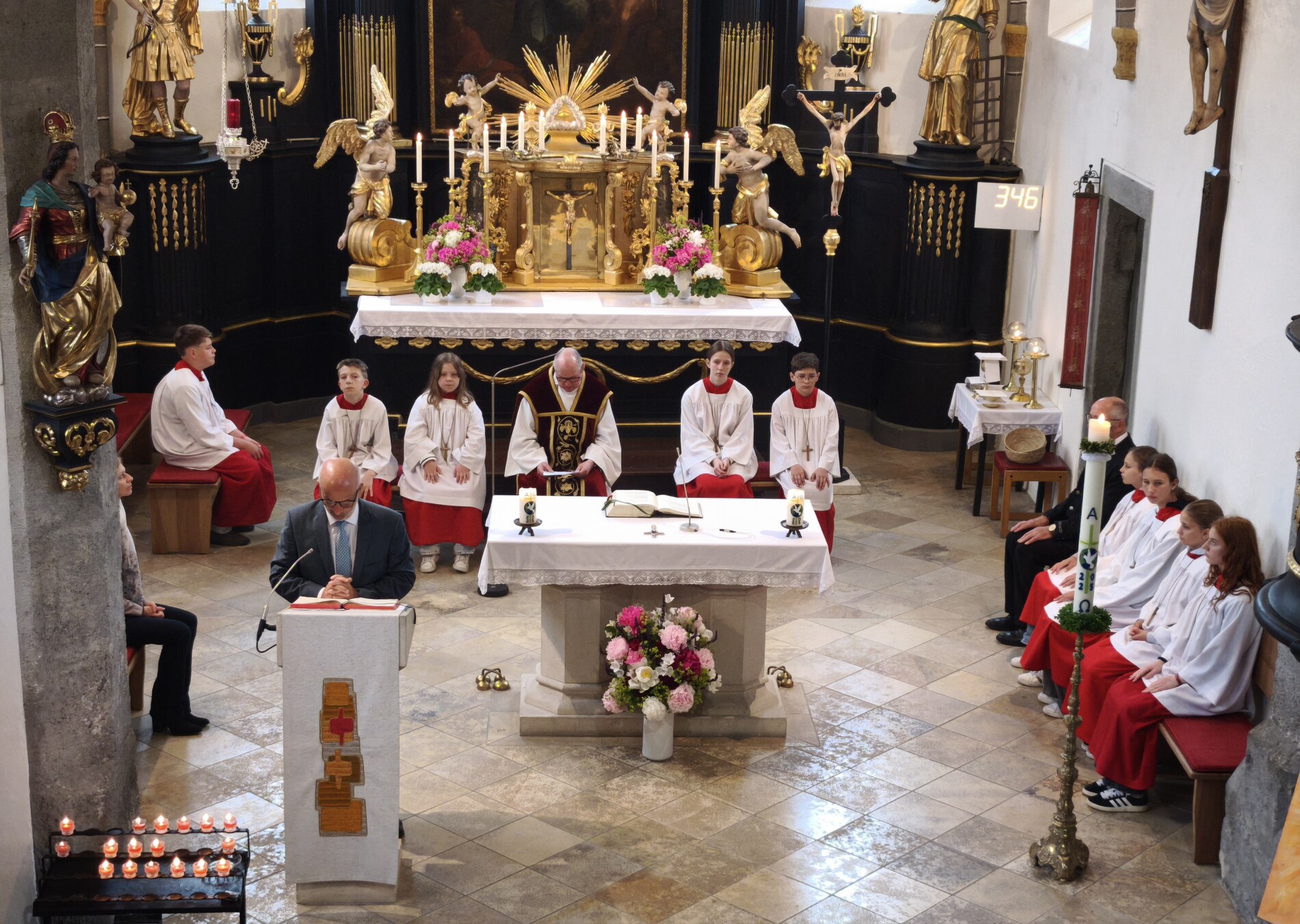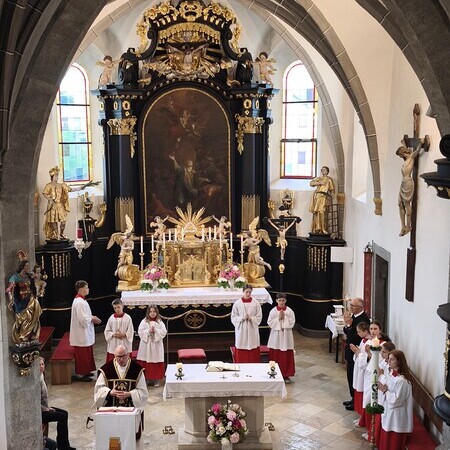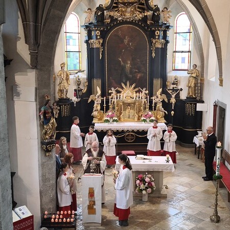 Mit vielen schwungvollen rhythmischen Liedern umrahmte der Projektchor "PGR & friends" unter der Leitung von Claudia Schörghuber das Hochamt am Pfingstsonntag, das von P. Aegid zelebriert wurde - instrumental begleitet von Martin Radl/Keyboard und Johanna Radl/Querflöte, sowie Fabian Röcklinger am Cajon.