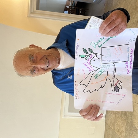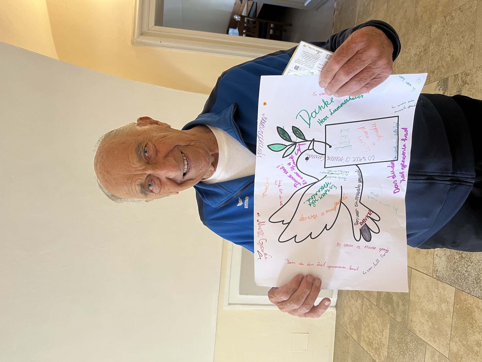 Am Ende der Veranstaltung wurde an Karl Lammerhuber eine große Friedenstaube als Dankeschön für seine Zeit, seine Offenheit und seine herzliche Art übergeben. Es war, wie Herr Lammerhuber treffend formulierte, obgleich der ernsten Thematik eine „eine muadstrum Gaudi“ und eine Veranstaltung die nicht nur Wissen vermittelte, sondern ein Beitrag zur Erinnerungskultur und zur Stärkung von Empathie und Zivilcourage sein soll – Werte, die heute aktueller denn je sind.