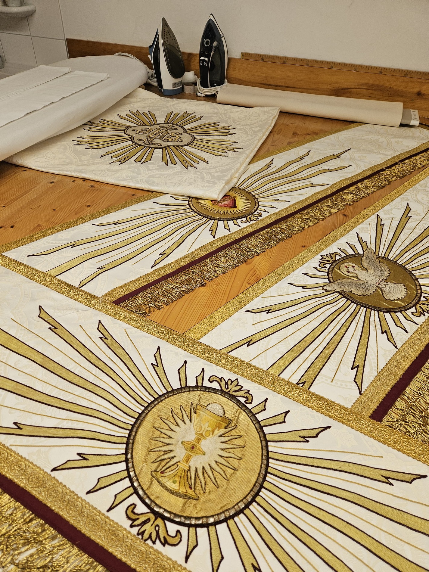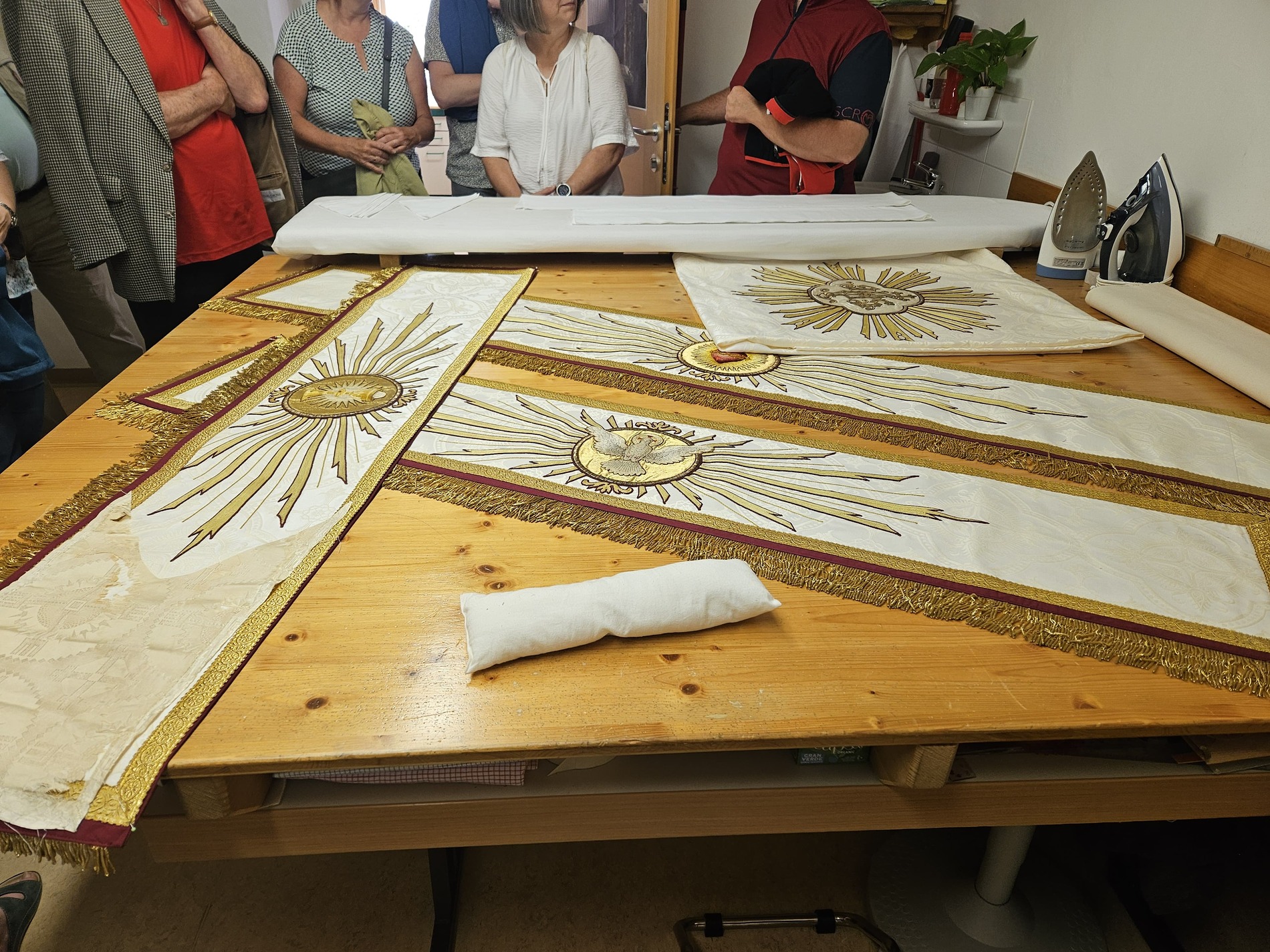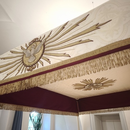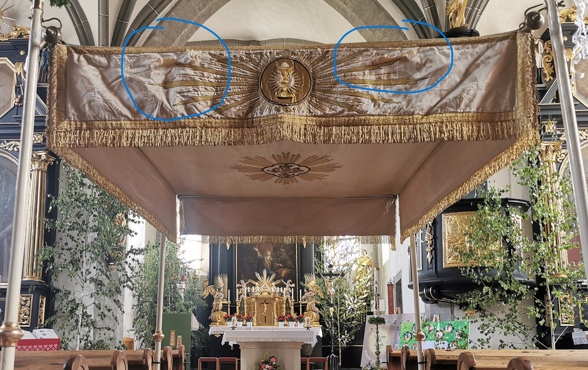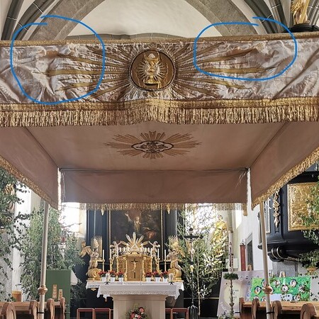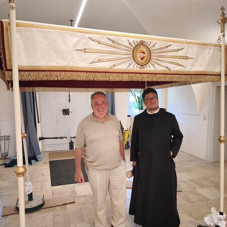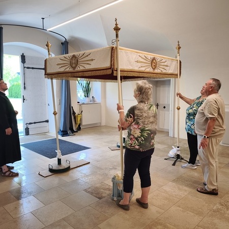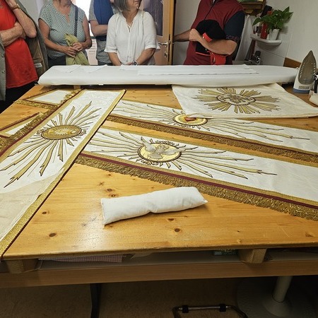 Der Fronleichnams-Baldachin wurde letztes Jahr in die Paramentik der Benediktinerinnen in Steinerkirchen zur notwendig gewordenen Restaurierung gebracht. Rund 80 bis 90 Arbeitsstunden sind für die Restaurierung angefallen, die Stickereien wurden aus dem schadhaften Stoff ausgeschnitten und wieder neu auf Damast aufgenäht.